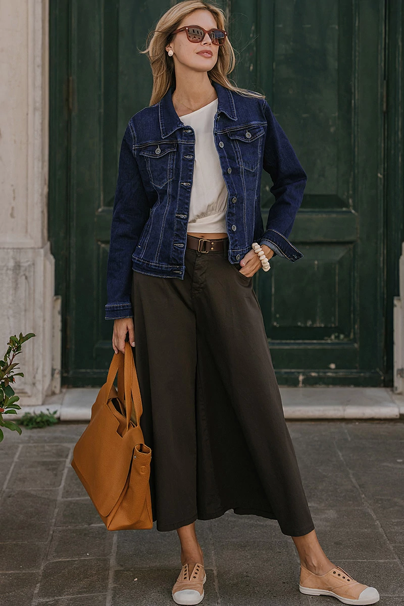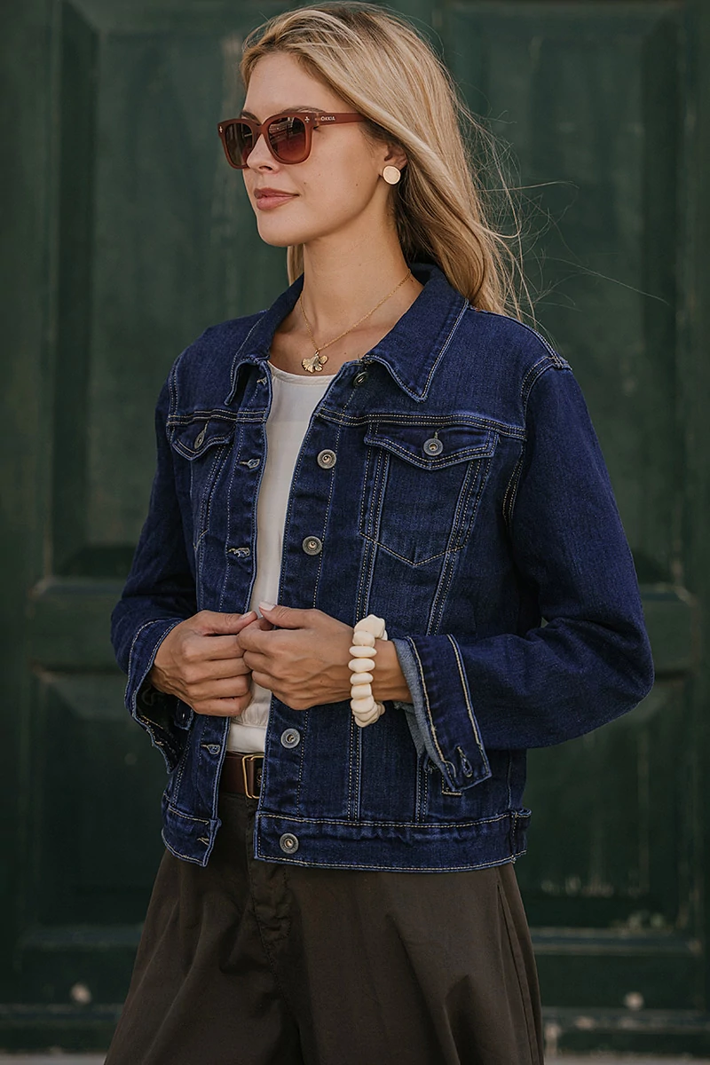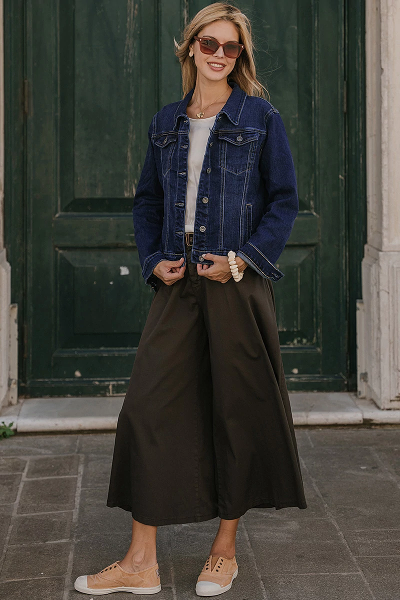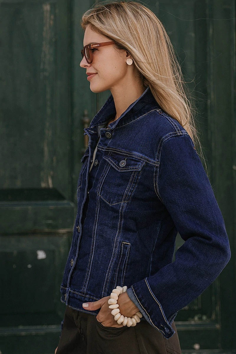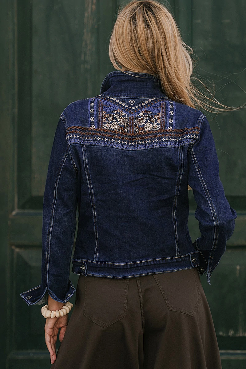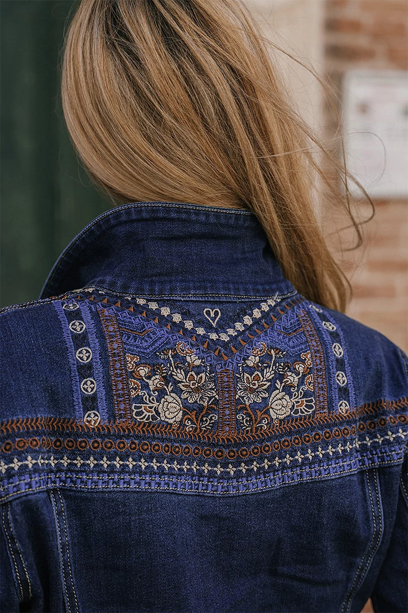 Farmer stílusú, puha pamut anyag, klasszikus fazon, rövid szabás, hosszú ujjal, gombos mandzsetta, elöl gombbal ellátott két mellzseb, belső zseb és további két zseb az oldalán. Elöl végig gombokkal záródik, a háta hímzéssel díszített. Anyaga rugalmas, puha farmer anyag.