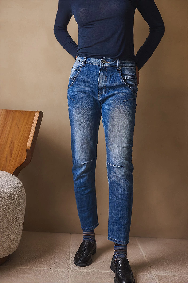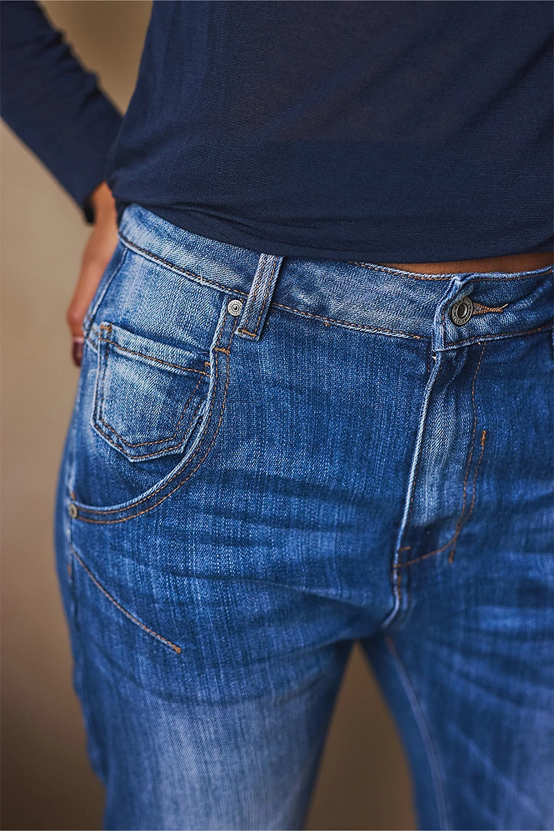 Ez a farmer a lezser vagányság és a kényelem tökéletes darabja. Enyhén ülepes fazonja divatos, modern sziluettet ad, miközben a rugalmas anyag biztosítja a kényelmes viseletet. A koptatások, gyűrések és a különböző irányú bevarrások karakteres, egyedi megjelenést kölcsönöznek, kiemelve a farmer laza, városi stílusát. Klasszikus ötzsebes kialakítása és cipzár-gombos záródása időtálló részlet, amely teljessé teszi a nadrág megjelenését.