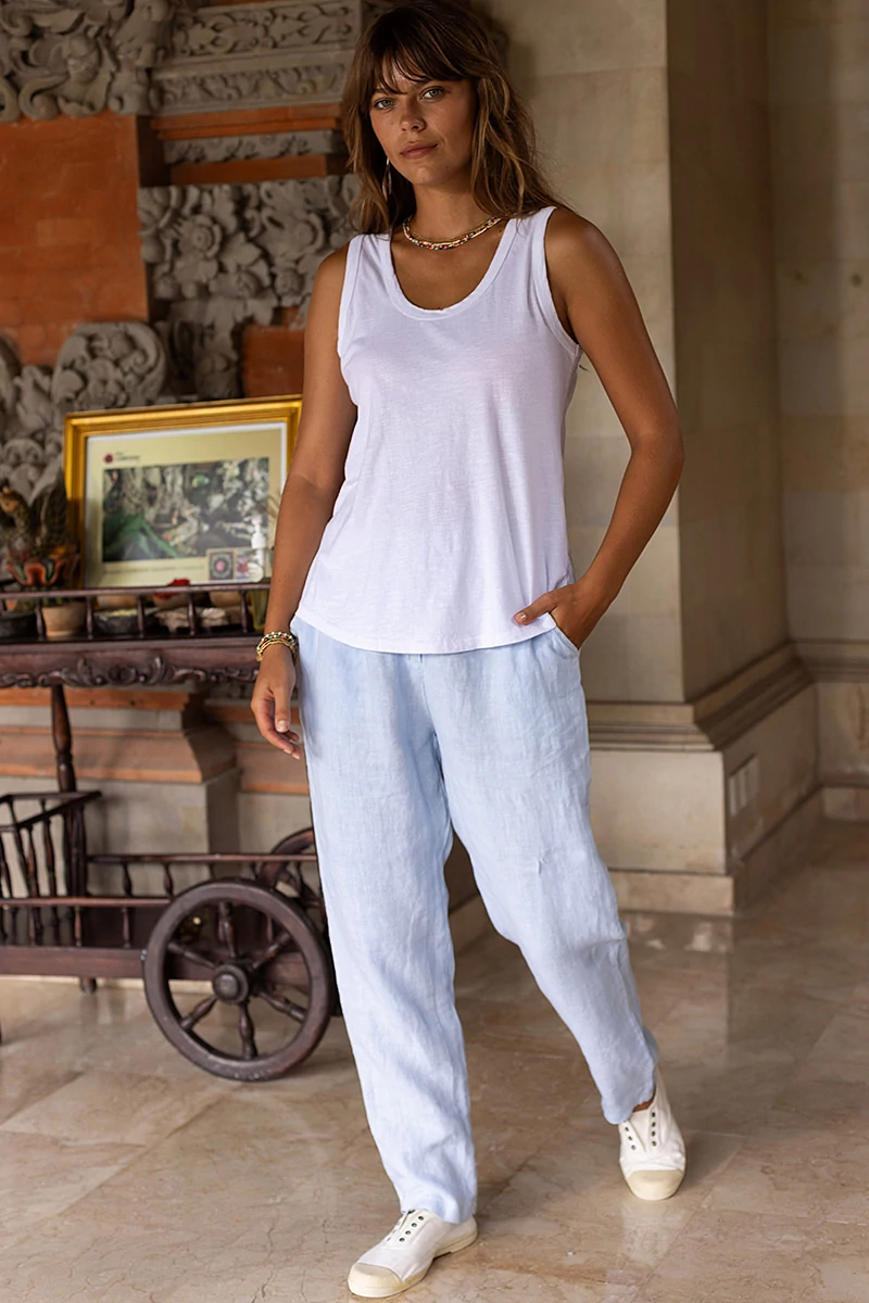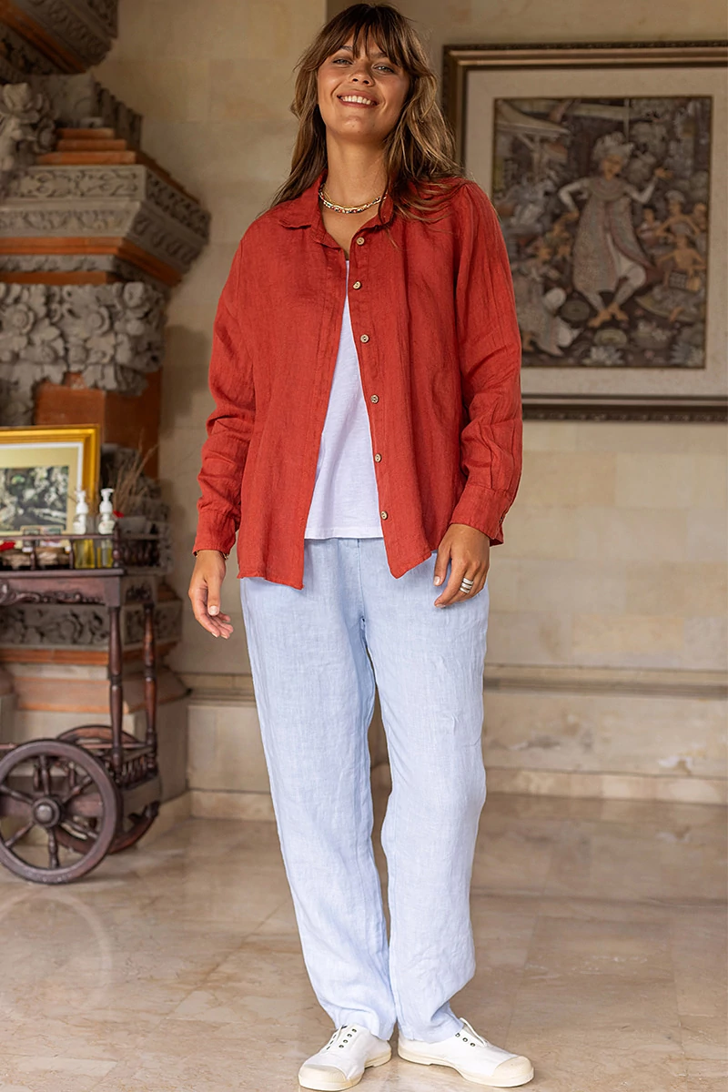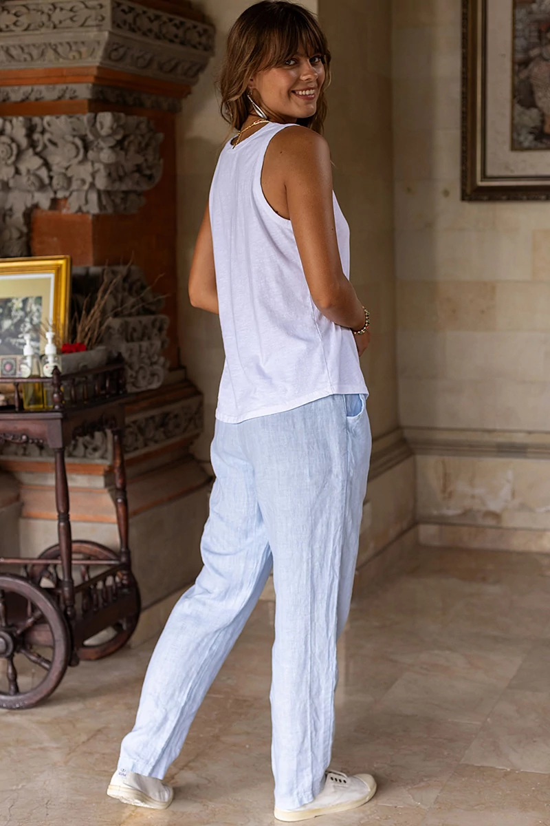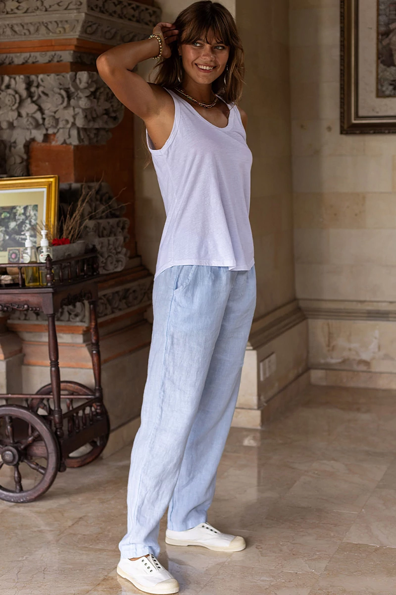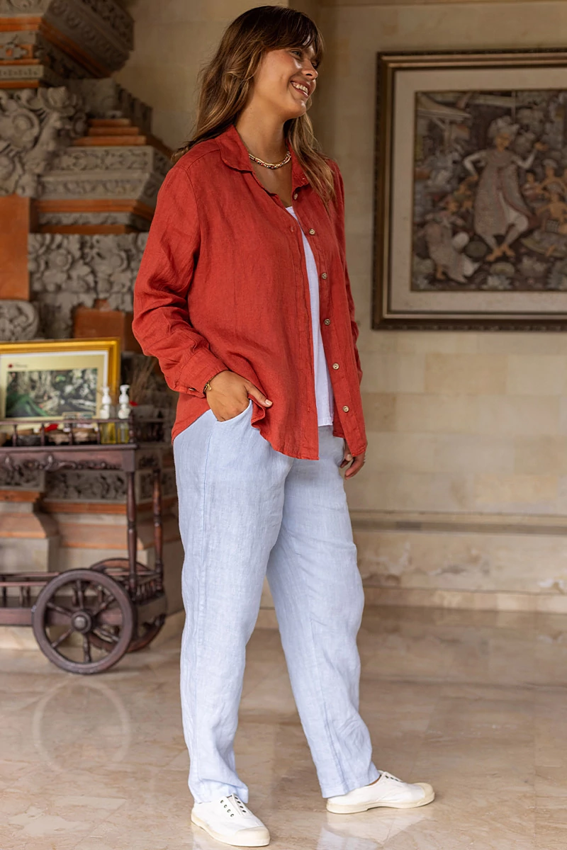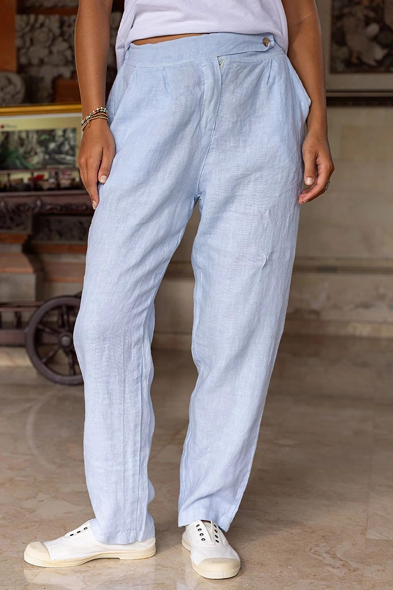 Len nadrág gombos, cipzáros magasabb derékkal, két oldalt zsebekkel, derekánál bővitő csiptetésekkel. Lefele szűkülő szárral. Anyaga nem rugalmas, szép esésű, 100% lenvászon.