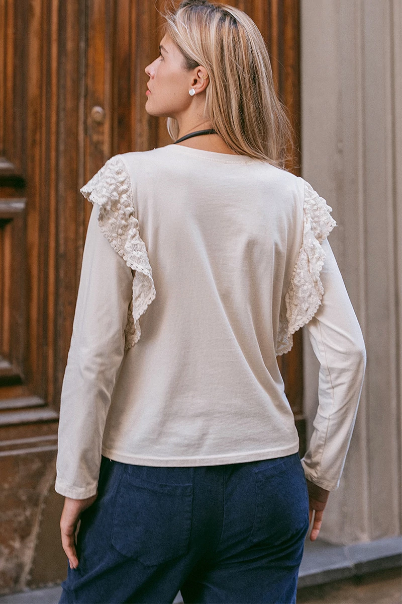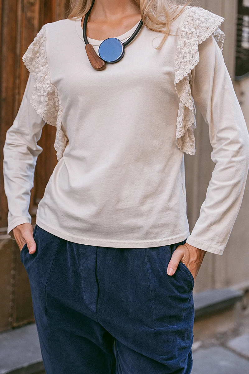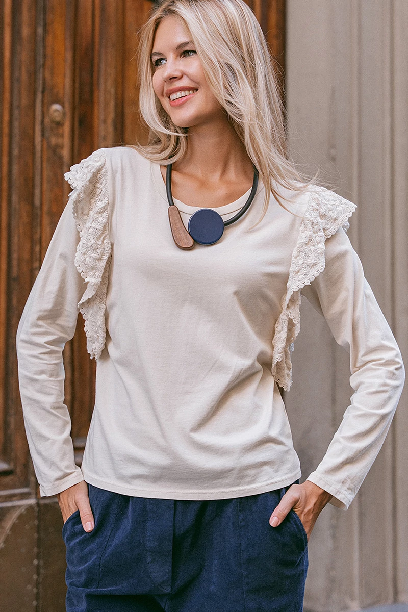 Enyhén testkövető felső hosszú ujjal, kerek nyakkal, vállánál azsúrozott fodrokkal. Az anyaga rugalmas pamut.
