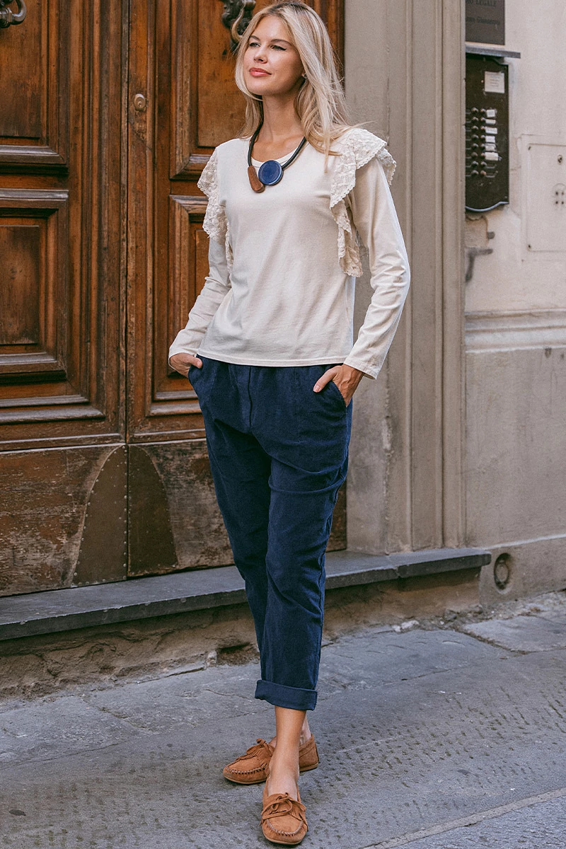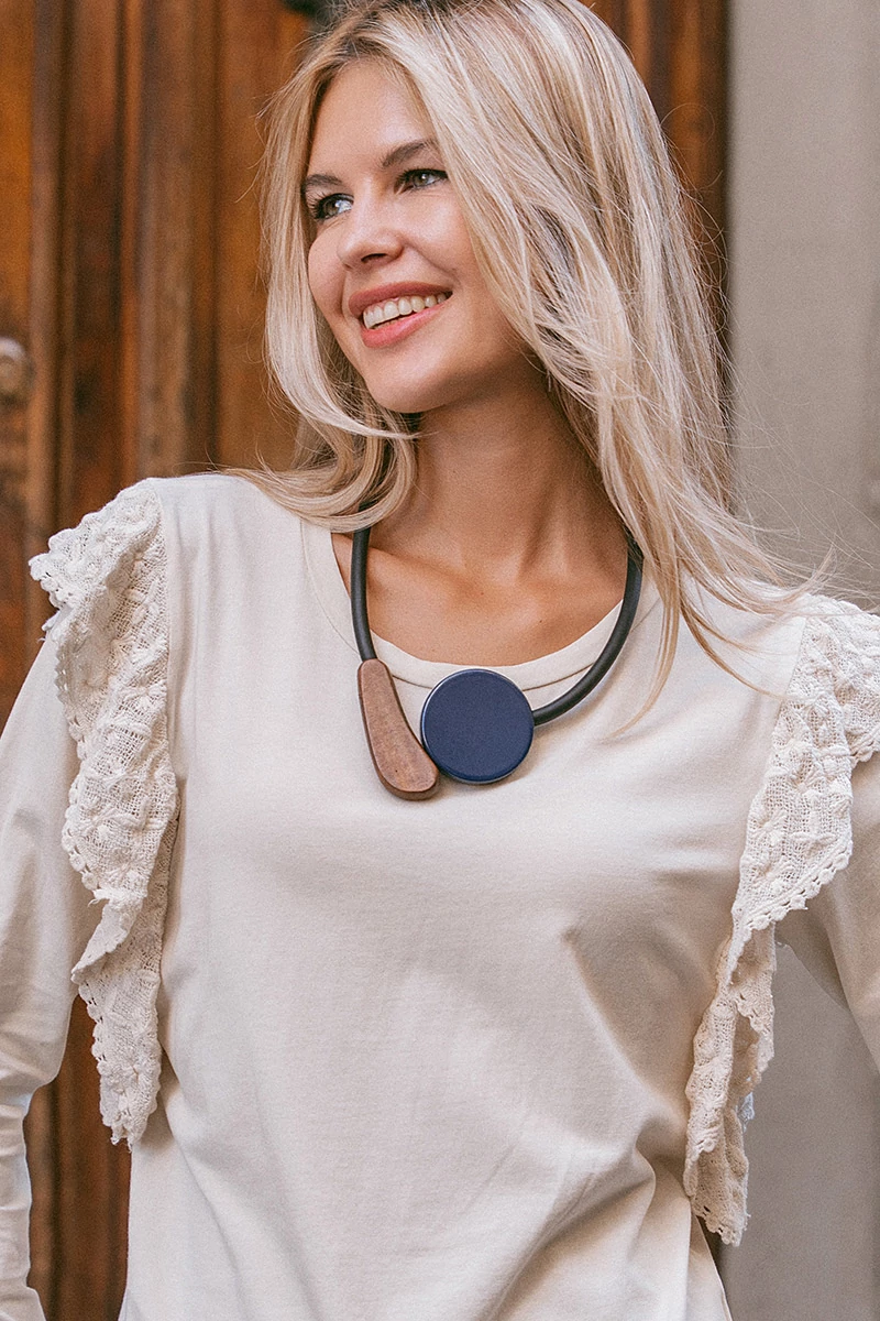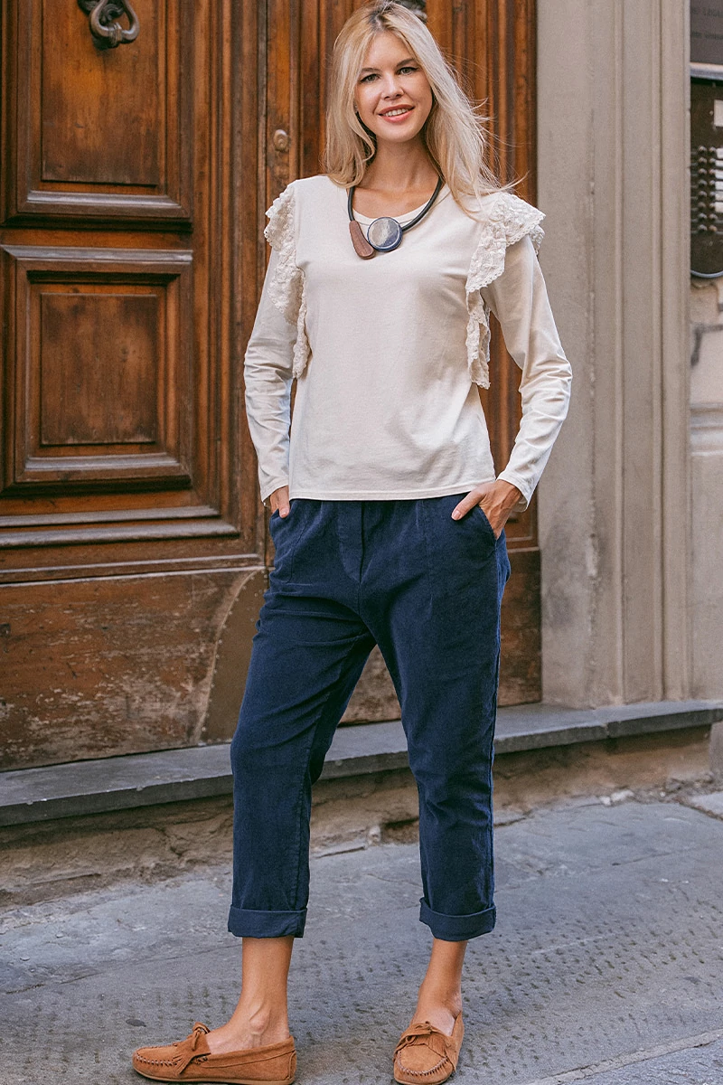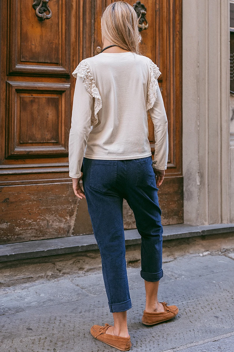 Enyhén testkövető felső hosszú ujjal, kerek nyakkal, vállánál azsúrozott fodrokkal. Az anyaga rugalmas pamut.