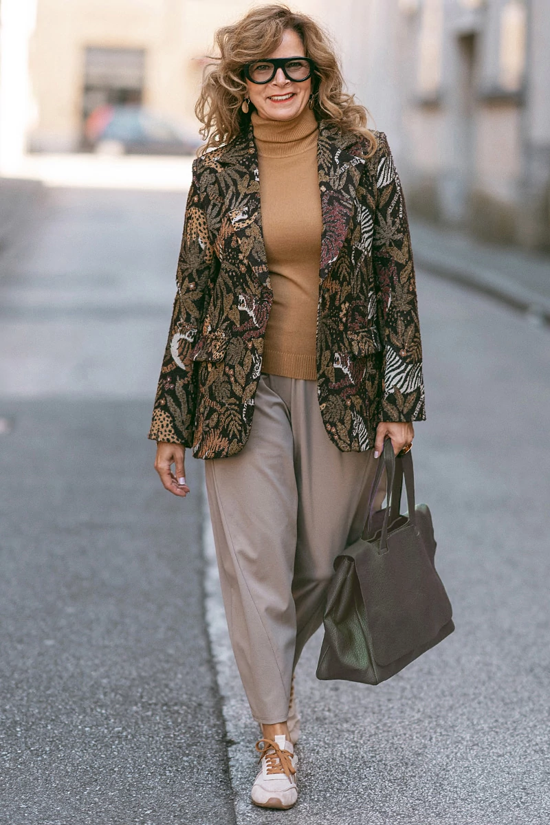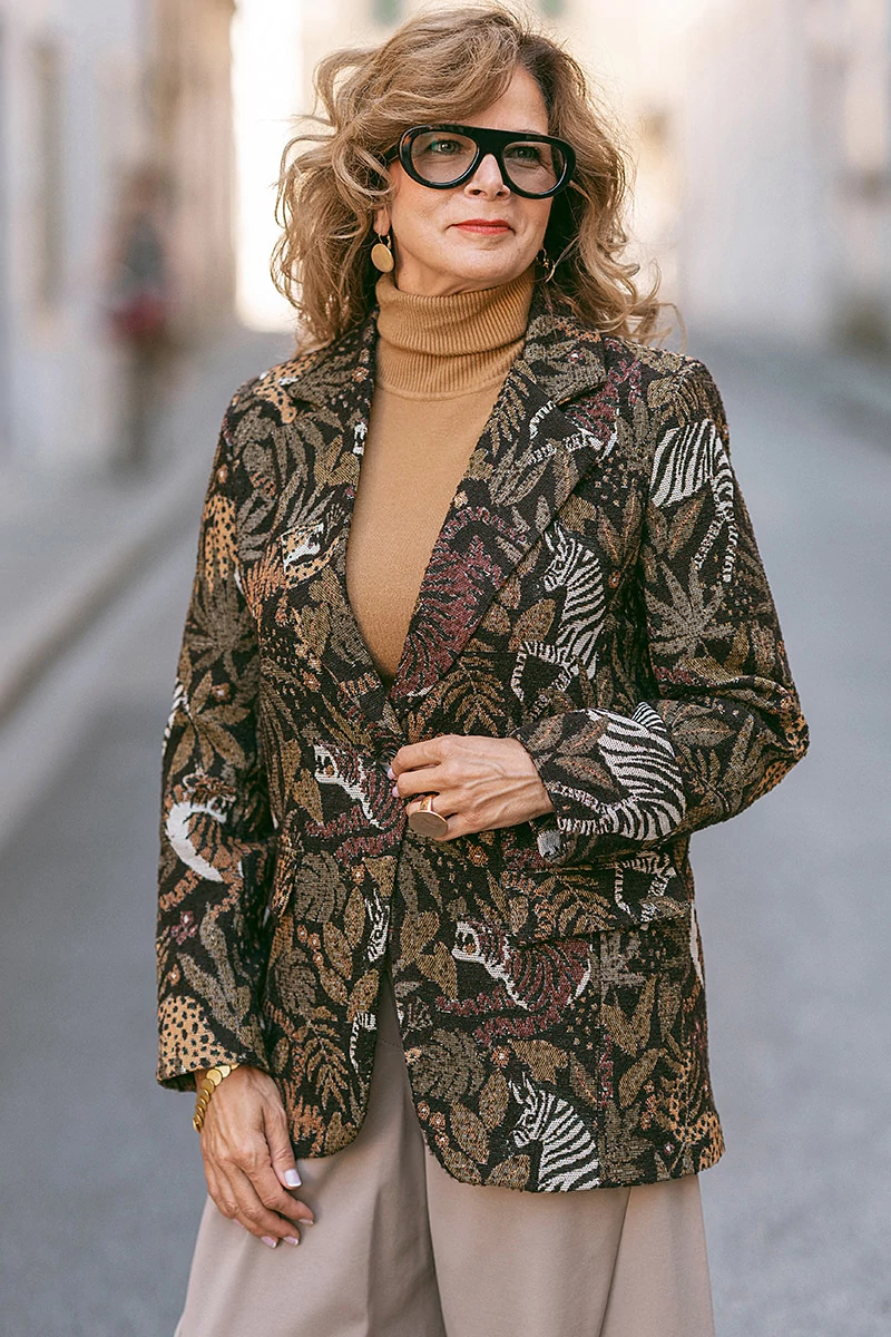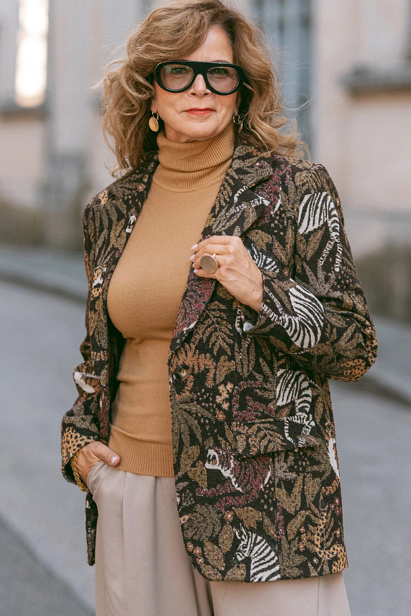 Lezserebb szabású zakókabát karcsúsító varrásokkal, füles díszzsebekkel, hosszú ujjal, hajtókás gallérral, selyembéléssel. Elöl gombbal záródik. Az anyaga nem rugalmas, mintás, közepes vastag szöttes hatású szövet.
