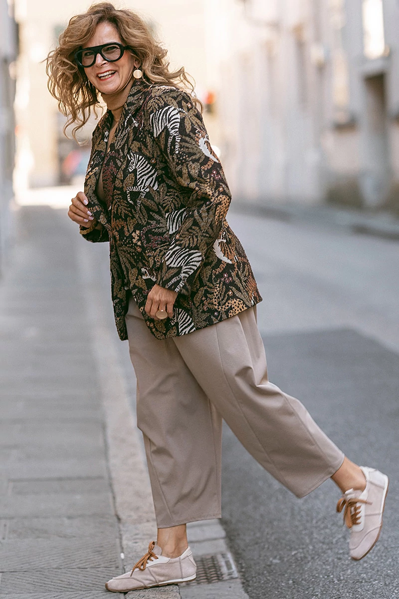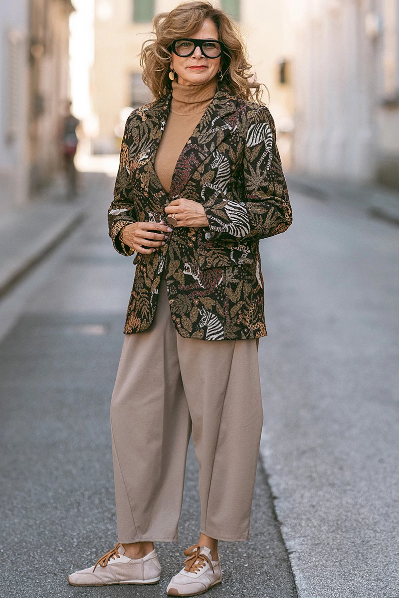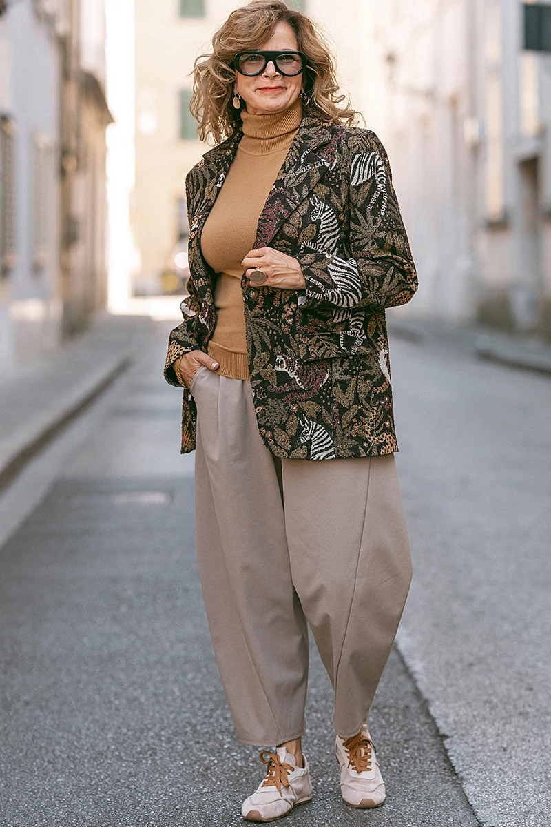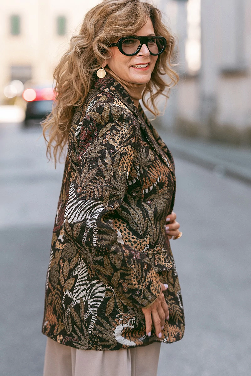 Lezserebb szabású zakókabát karcsúsító varrásokkal, füles díszzsebekkel, hosszú ujjal, hajtókás gallérral, selyembéléssel. Elöl gombbal záródik. Az anyaga nem rugalmas, mintás, közepes vastag szöttes hatású szövet.
