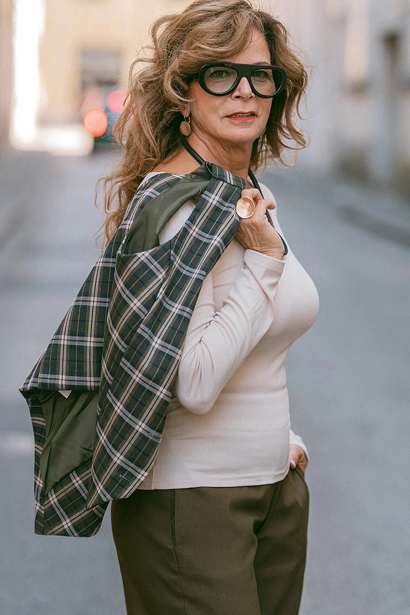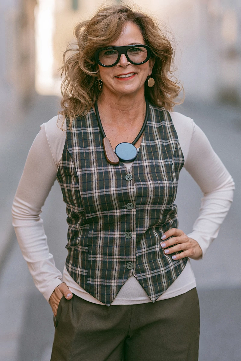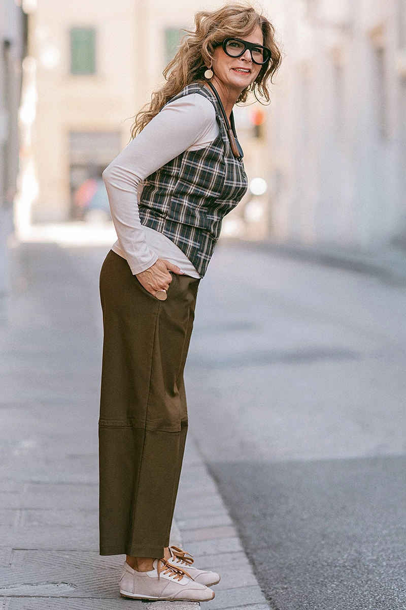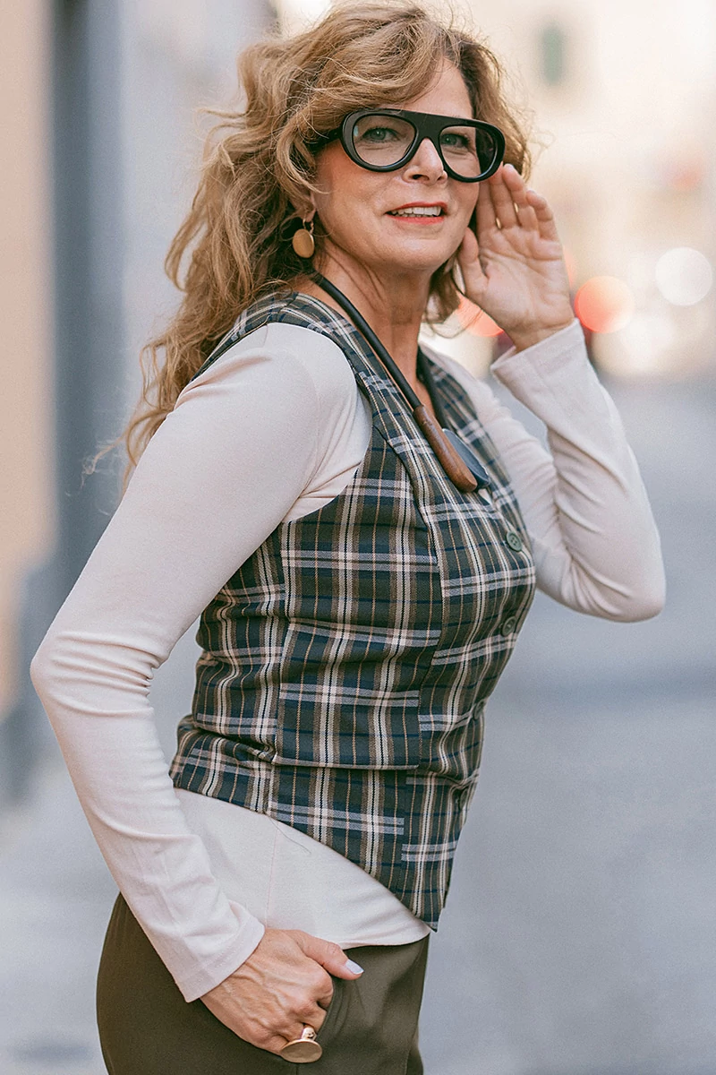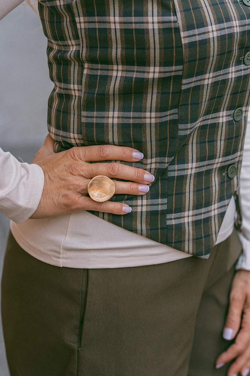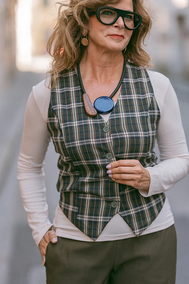 Egyenes vonalú, varrásokkal enyhén karcsúsított mellény, selyem béléssel, V nyakkal. Gombokkal záródik. Az anyaga puha, nem rugalmas, mintás szövet.