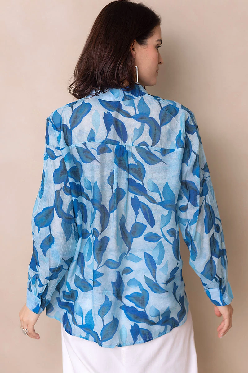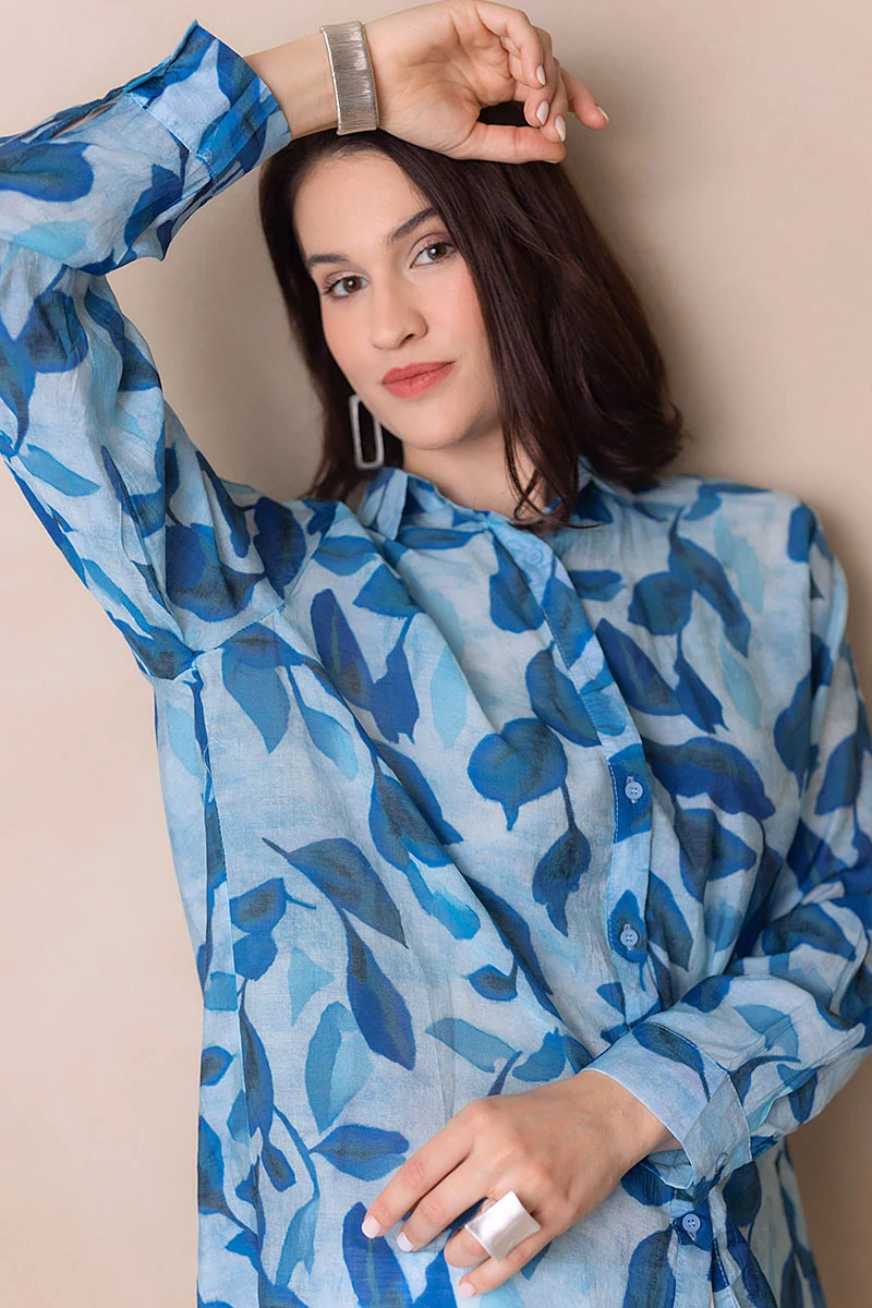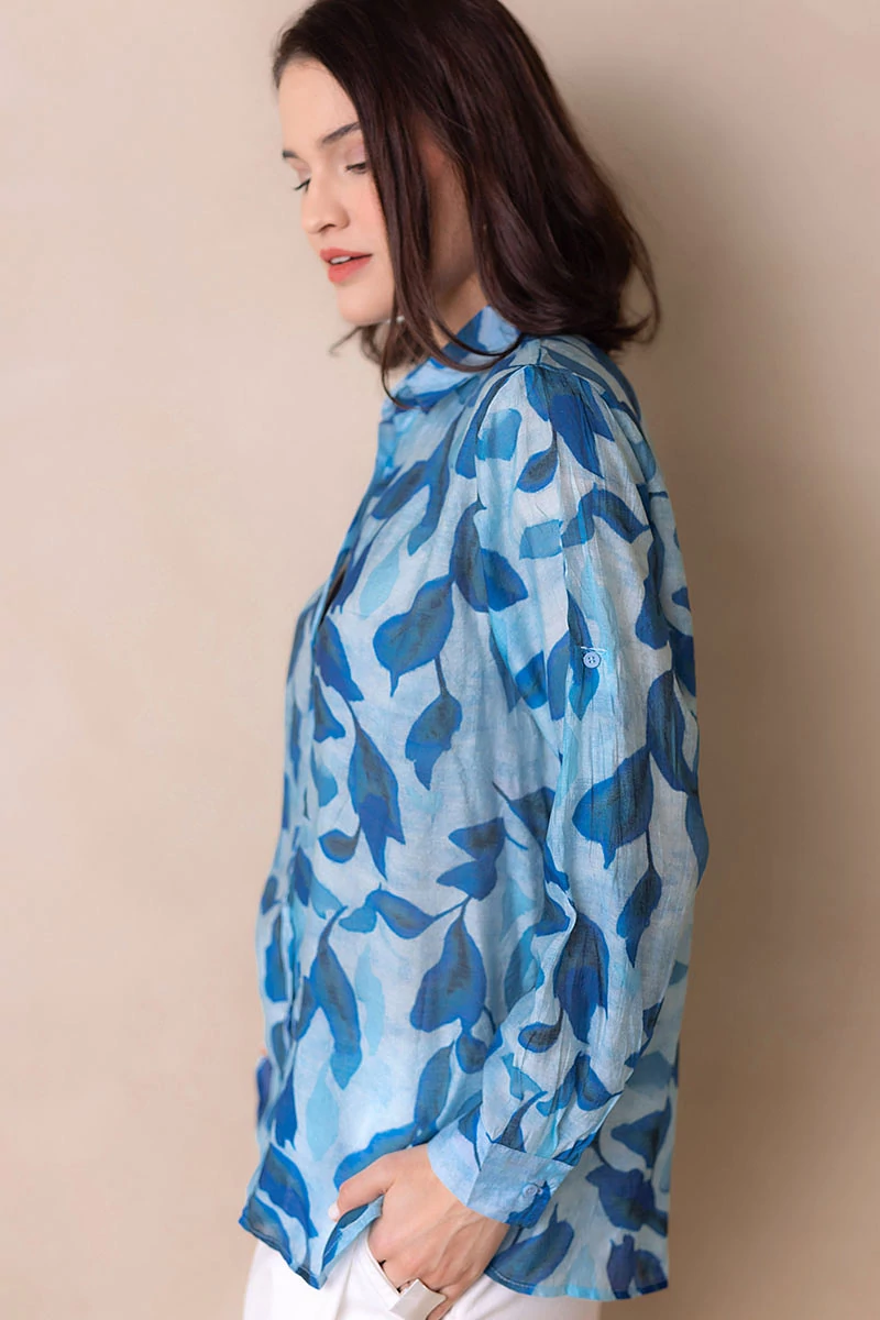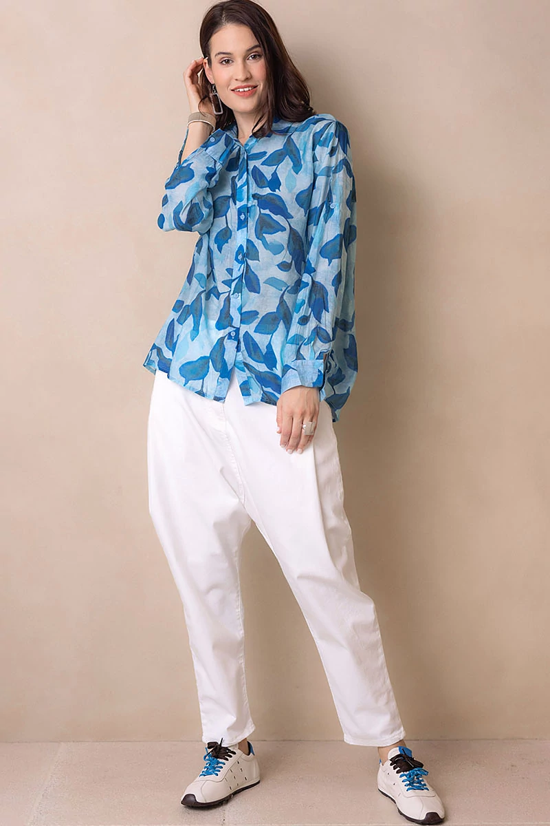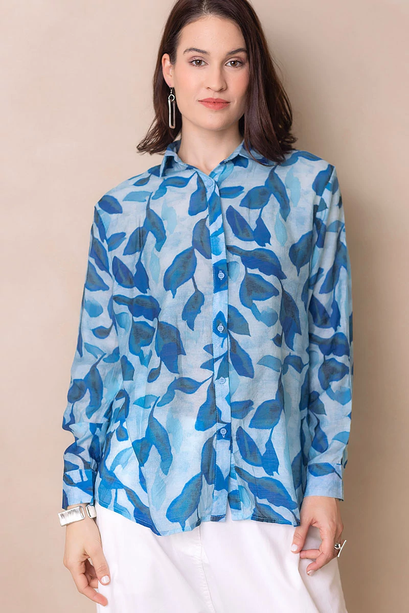 Egyenes vonalú blúz gallérral, hosszú mandzsettás ujjal. Kellemes, karakteres darab, amely egyszerre romantikus és bájos. Elöl végig gombokkal záródik. Anyaga nem rugalmas, könnyű, selyemfényű, muszlinszerű anyag.