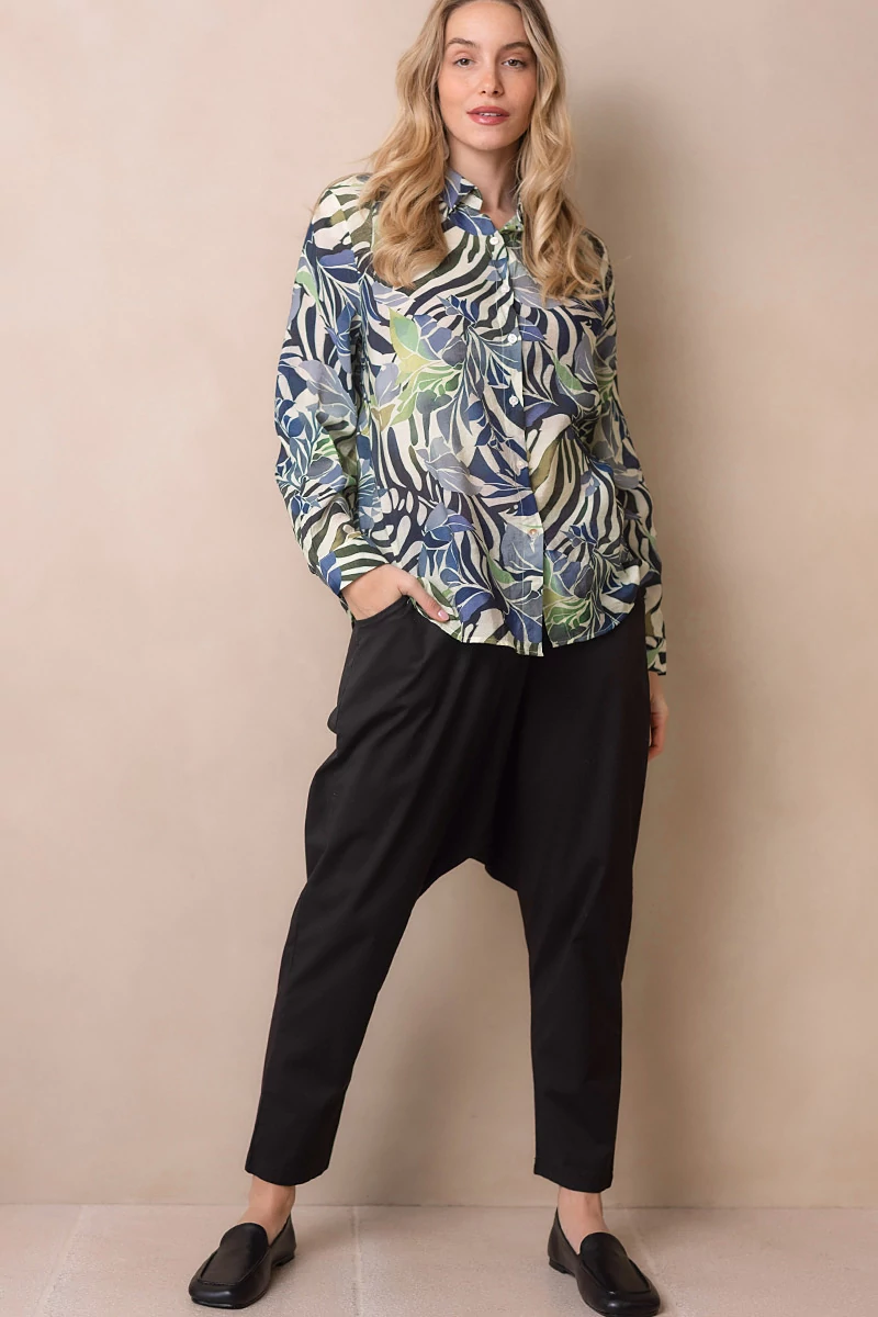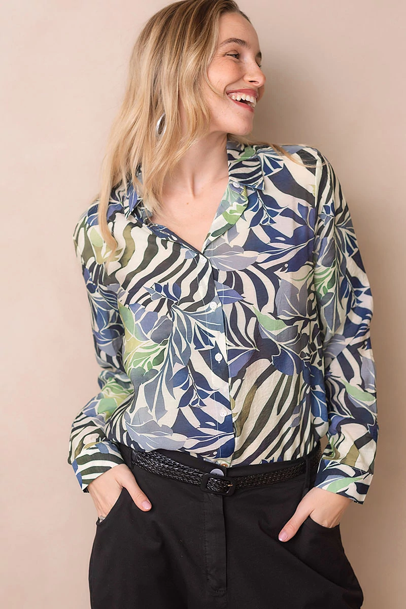Egyenes vonalú blúz gallérral, hosszú mandzsettás ujjal. Kellemes, karakteres darab, amely egyszerre romantikus és bájos. Elöl végig gombokkal záródik. Anyaga nem rugalmas, könnyű, selyemfényű, muszlinszerű anyag.
