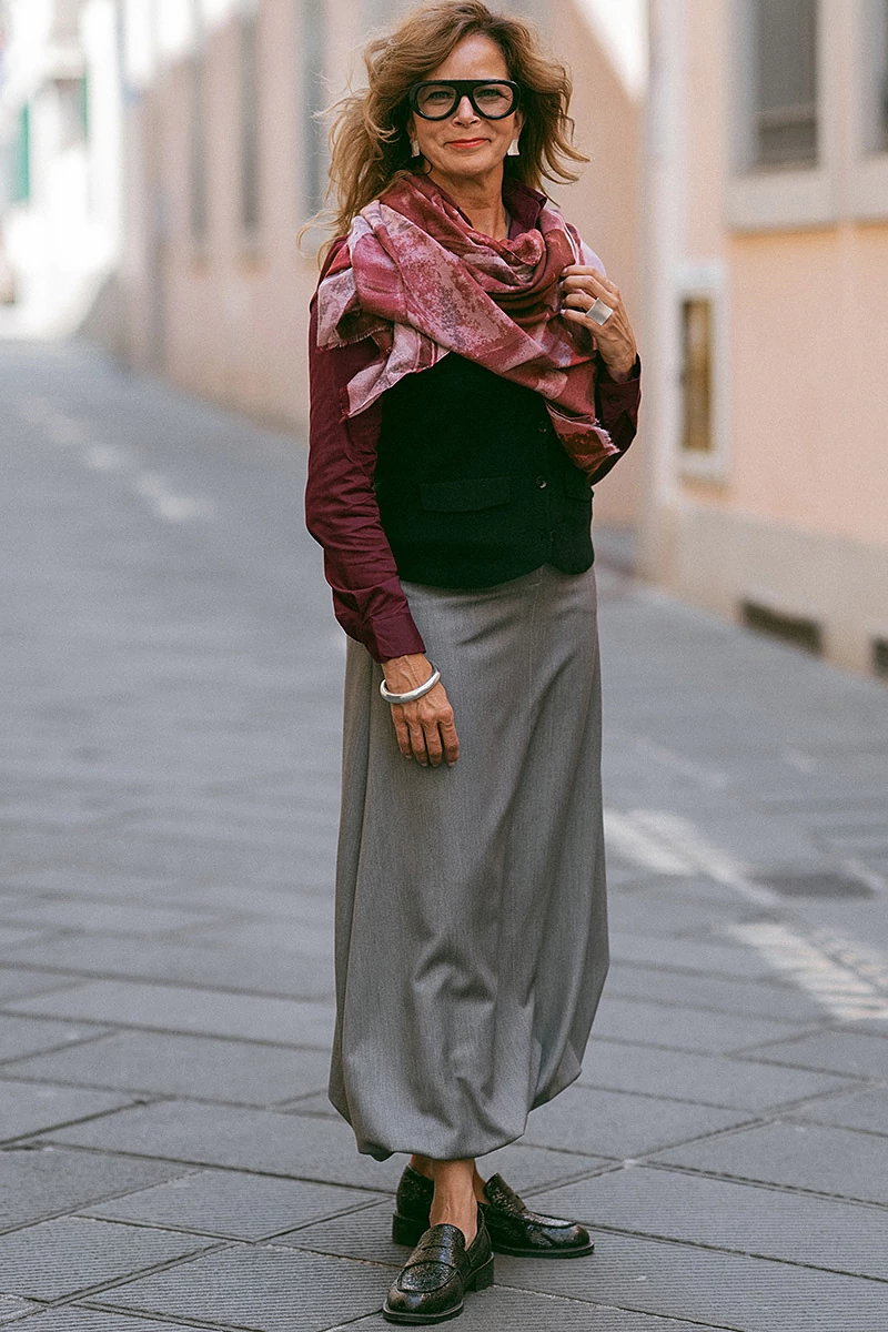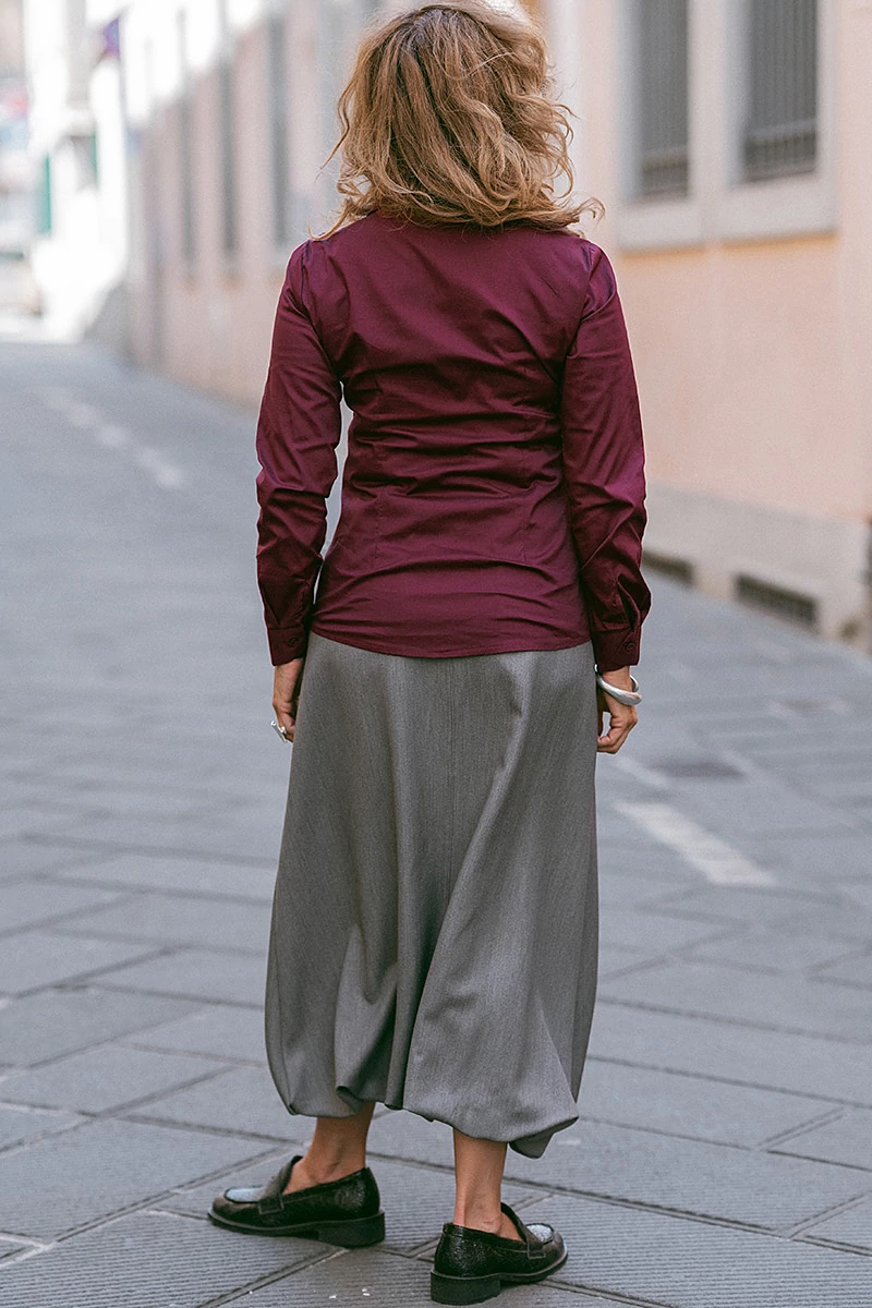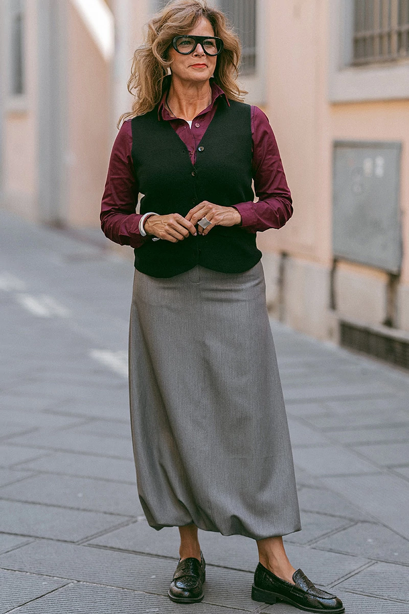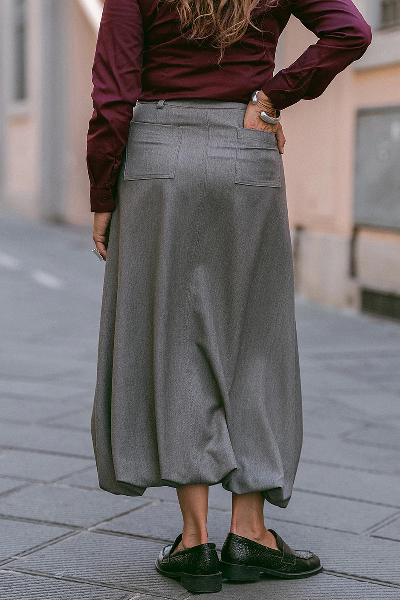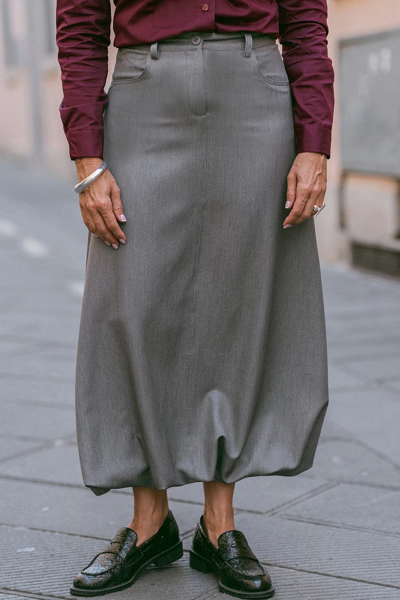 Buborék fazonú, kétrétegű alj, alul rugalmas ráncolással, gombos, cipzáros derékkal, két oldal és két farzsebbel. Az anyaga belül vékony, puha, enyhén rugalmas anyag, felső réteg enyhén rugalmas, enyhén selyemfényű szövet.