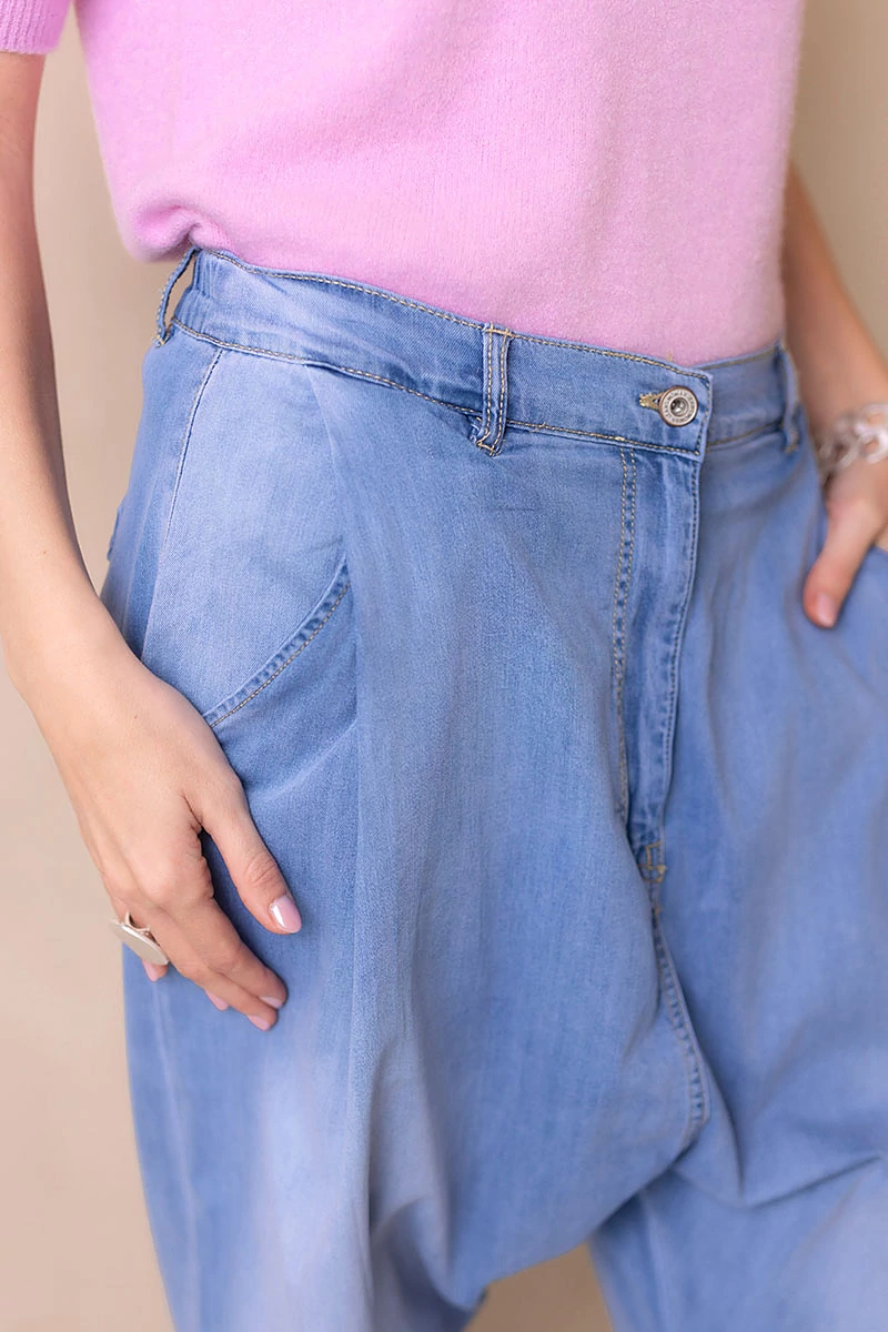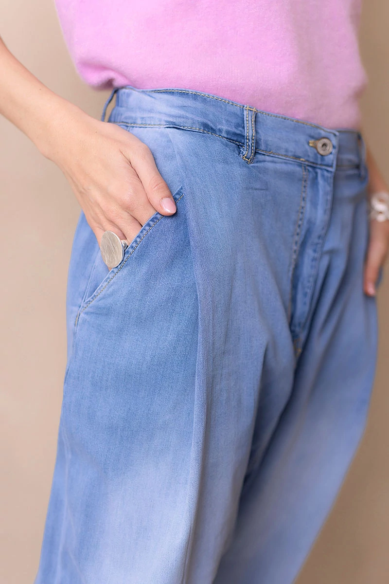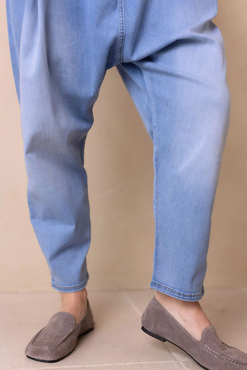 Rugalmas, koptatott farmeranyagból készült ülepes nadrág, elöl bővítő hajtásokkal. Két oldalzseb és hátul két díszzseb egészíti ki. Derekán cipzáras, gombos záródás, hátul gumírozással a kényelmes illeszkedésért. Normál szárhosszúságú, nagyobb méretezésű, lezser fazon, amely laza, mégis stílusos megjelenést ad.