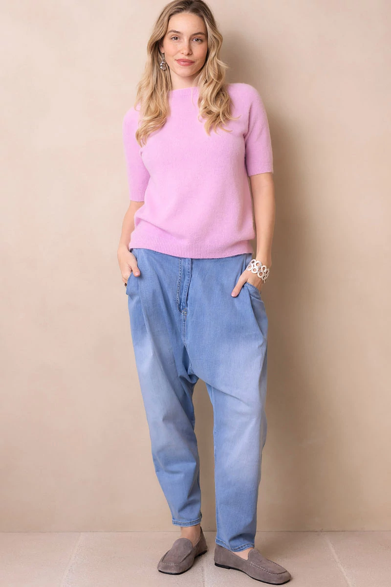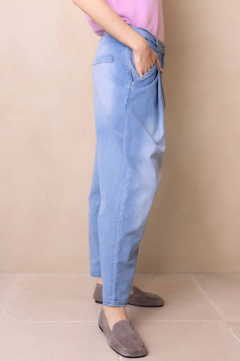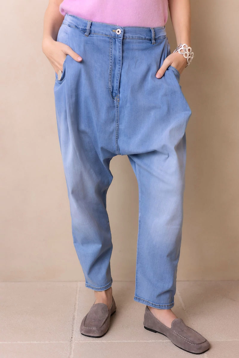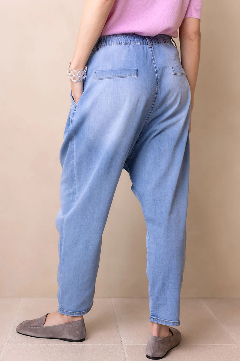 Rugalmas, koptatott farmeranyagból készült ülepes nadrág, elöl bővítő hajtásokkal. Két oldalzseb és hátul két díszzseb egészíti ki. Derekán cipzáras, gombos záródás, hátul gumírozással a kényelmes illeszkedésért. Normál szárhosszúságú, nagyobb méretezésű, lezser fazon, amely laza, mégis stílusos megjelenést ad.