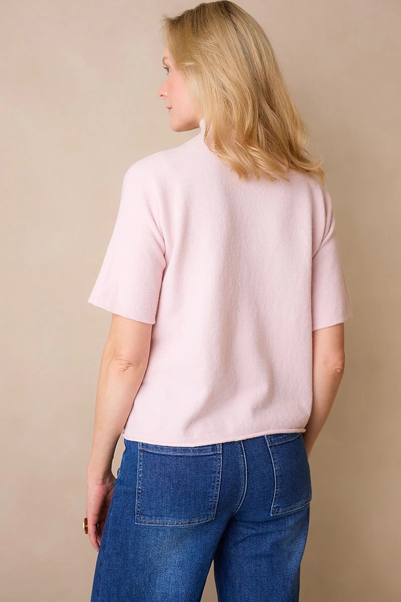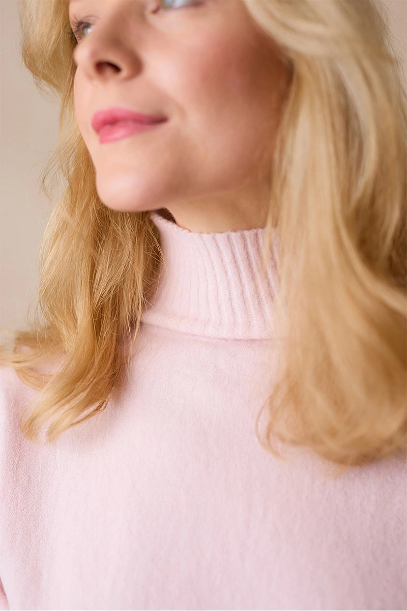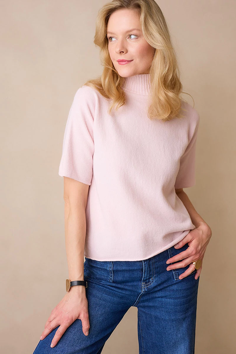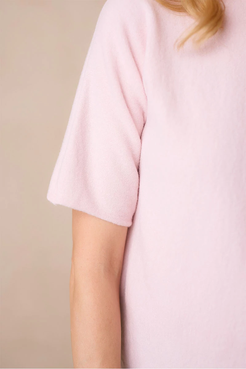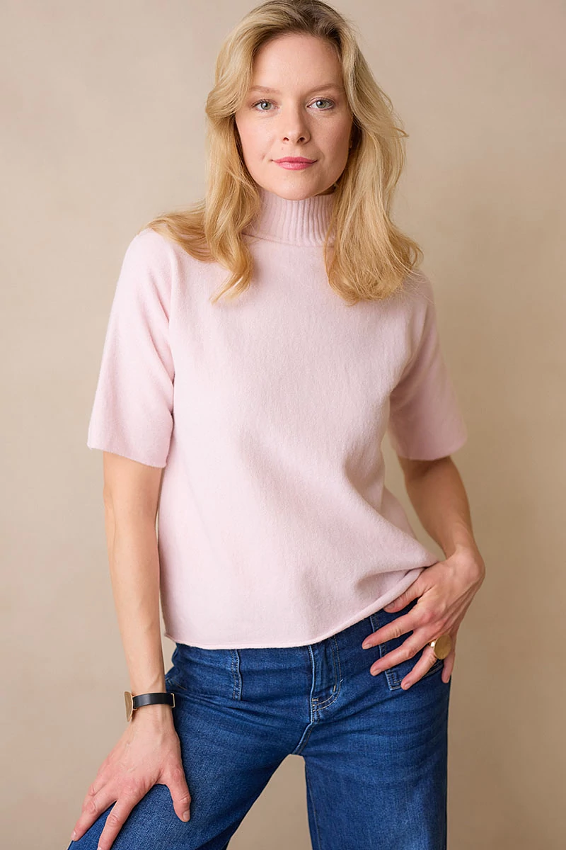 Lágy esésű, finom tapintású kötött felső, ami egyszerre kényelmes és nőies.A passzé nélküli, rövid T-ujj könnyed mozgást enged, a garbó nyak pedig laza eleganciát sugall. Passzé nélküli végei szabadabb, játékosabb hatást keltenek, így egyszerre sportosan természetes és finoman sikkes.