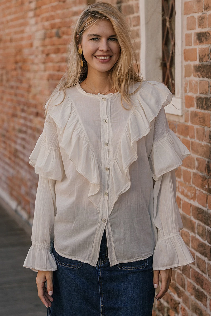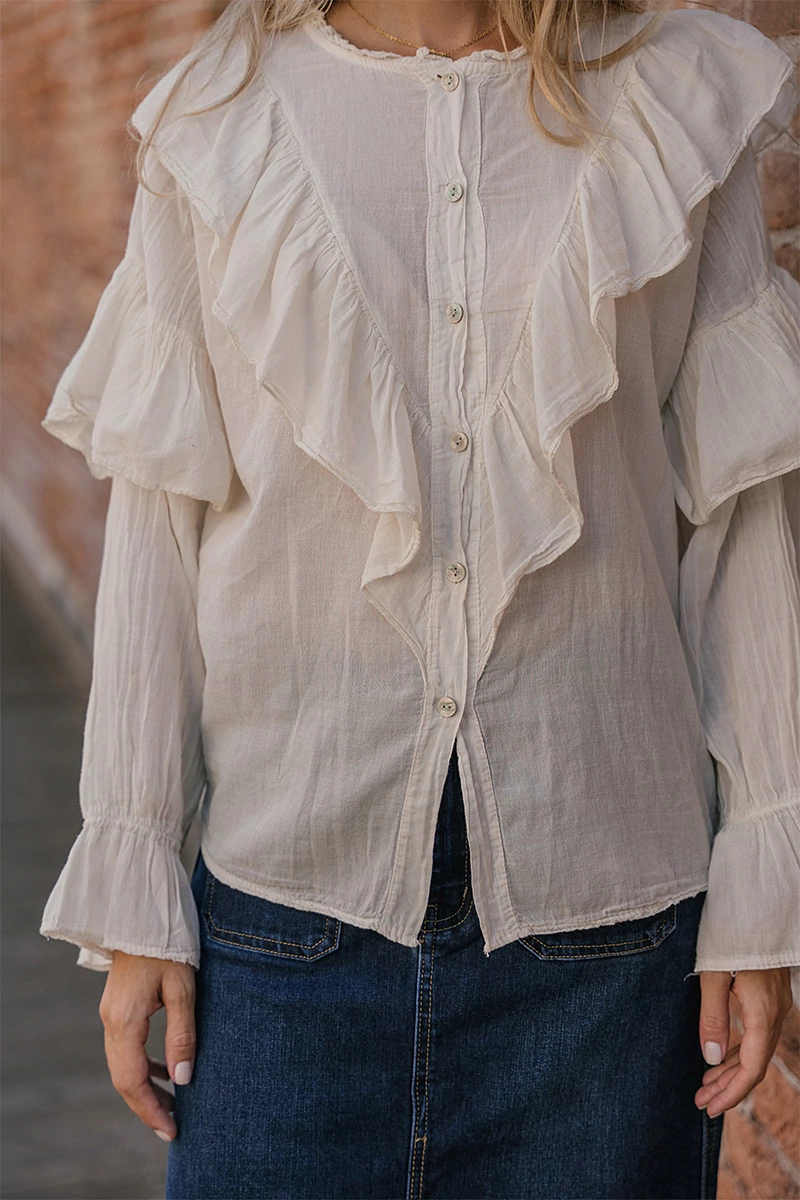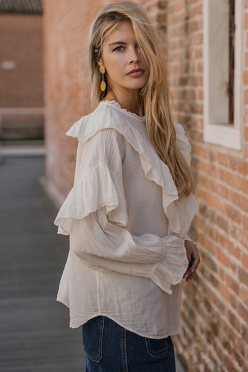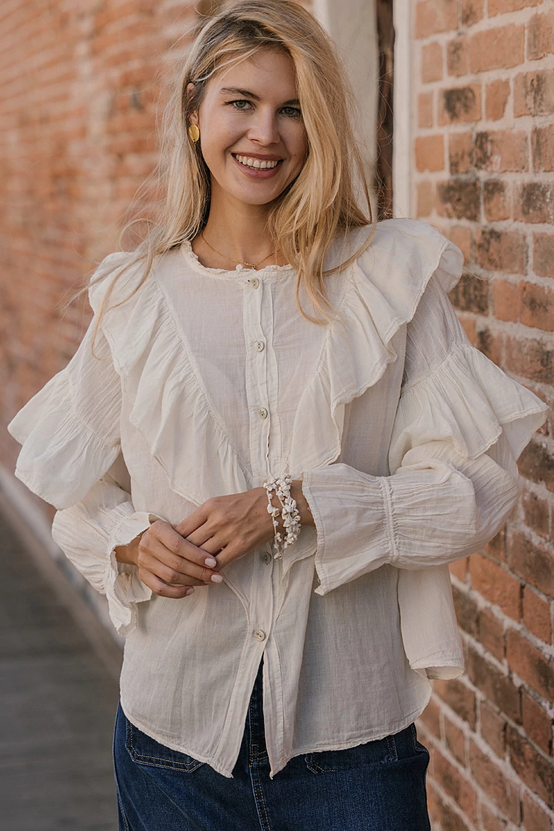 Egyenes vonalú blúz fodros körgallérral, ovális nyakkivágással, hosszú, fodros, tölcsér ujjal. Mandzsettánál gumírozott. Anyaga nem rugalmas, könnyű, puha pamut.