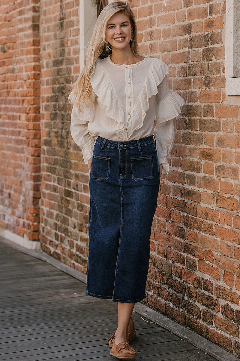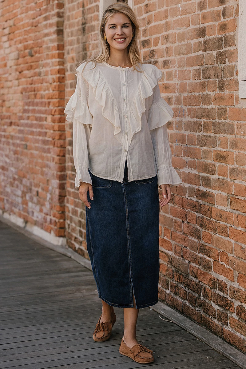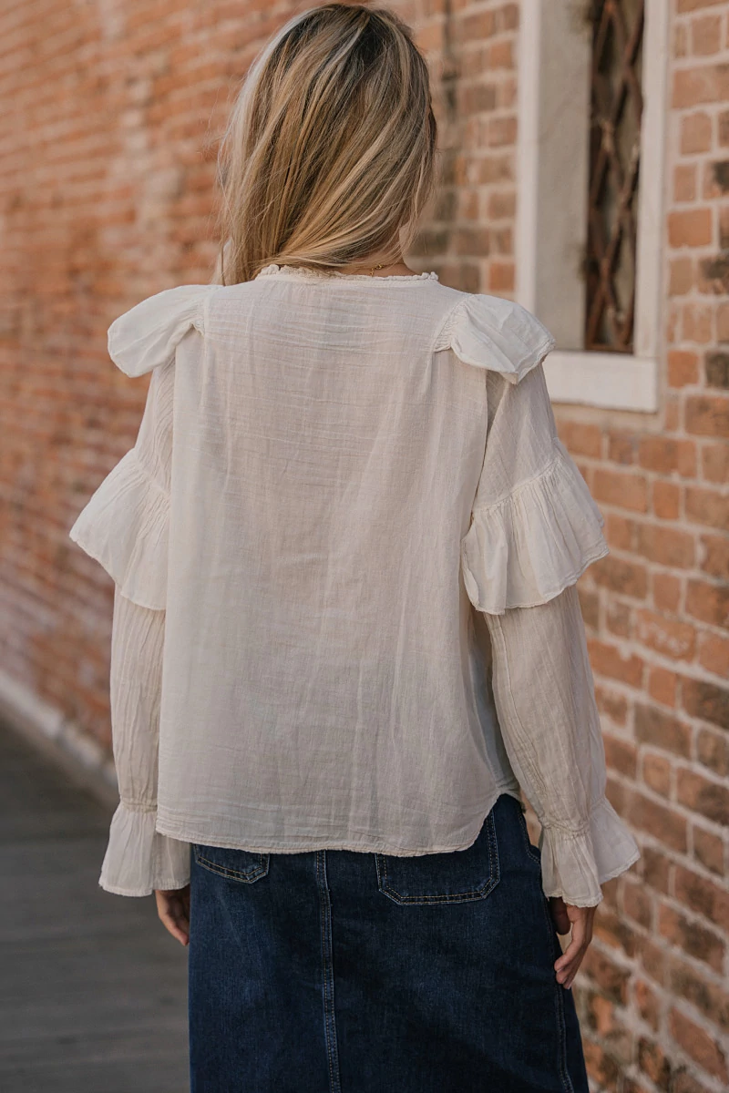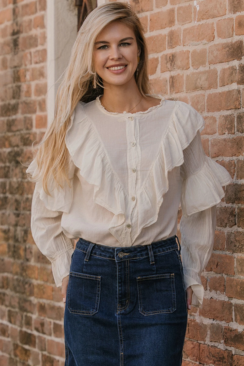 Egyenes vonalú blúz fodros körgallérral, ovális nyakkivágással, hosszú, fodros, tölcsér ujjal. Mandzsettánál gumírozott. Anyaga nem rugalmas, könnyű, puha pamut.