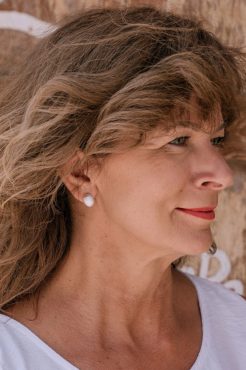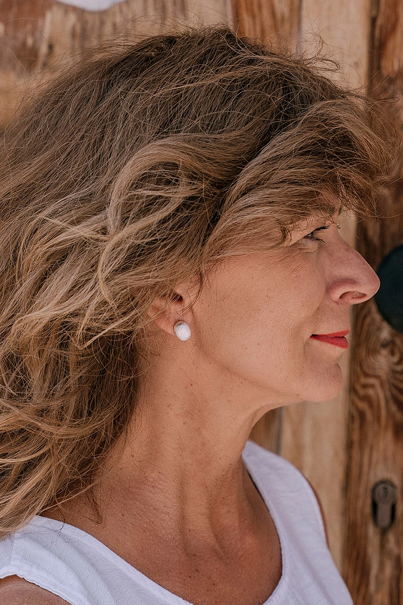 Gyöngy hatású, matt felületű, ezüst színű bedugós fülbevaló.