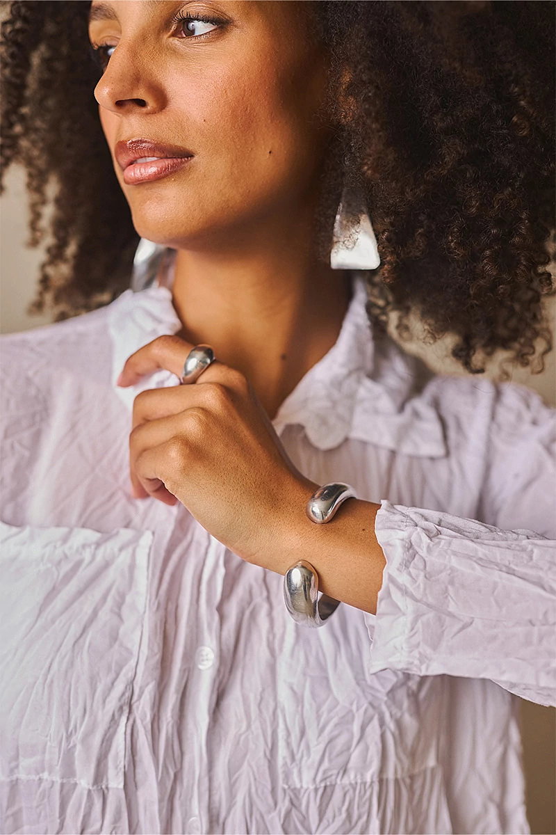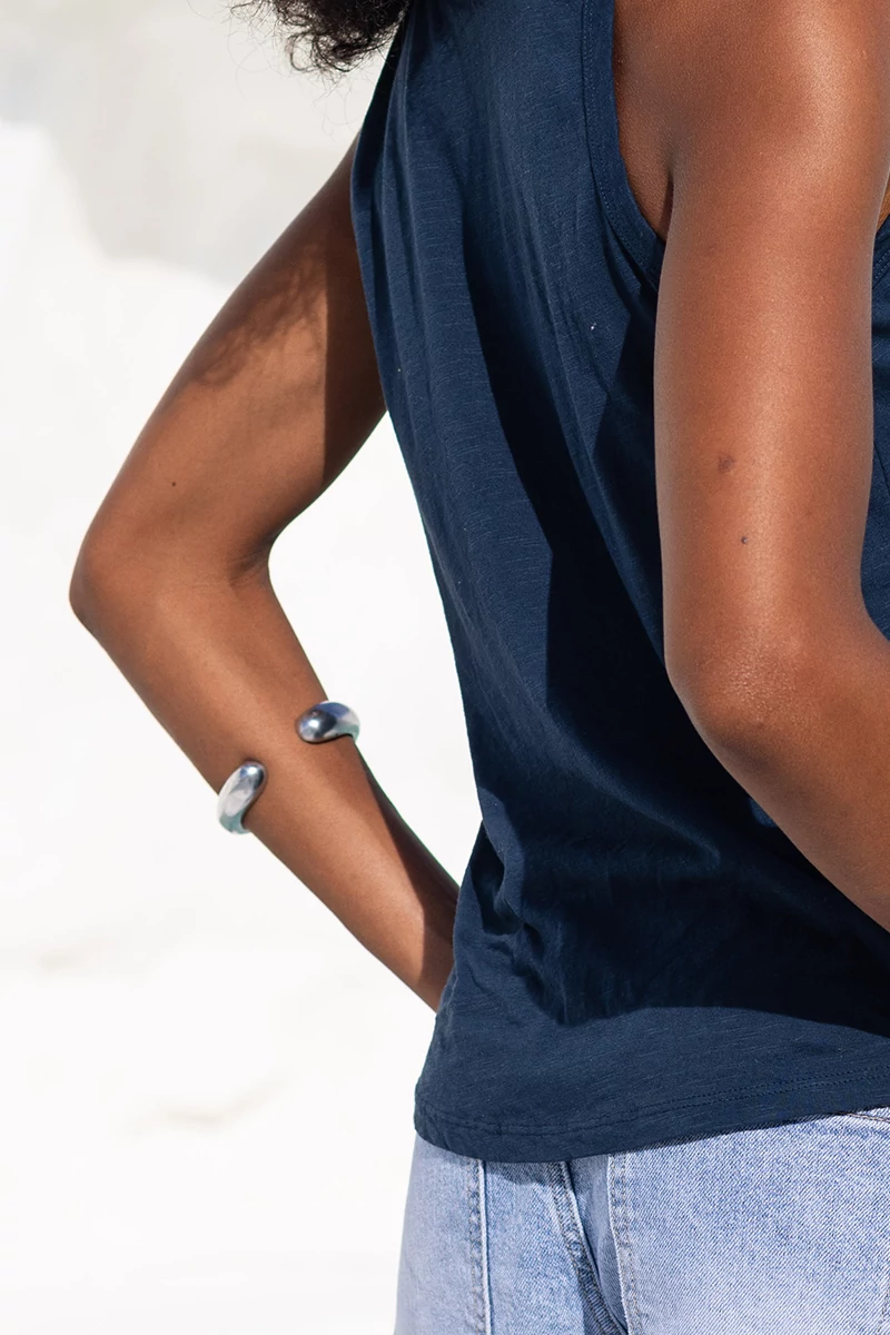 Merev, nyitott, lekerekített karkötő. Kézzel készített alumínium, 100%-ban újrahasznosított. Nikkeltesztelt. A méretek a termék kidolgozásából adódóan kismértékben eltérhetnek.