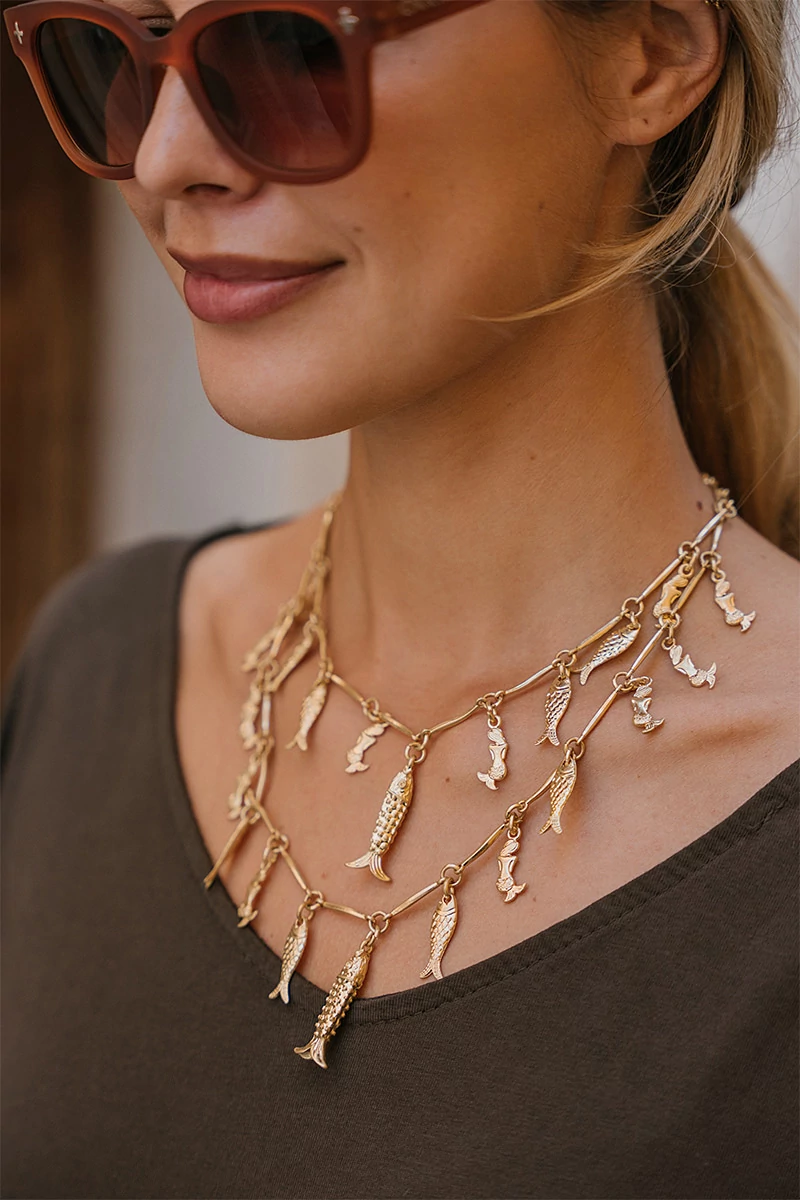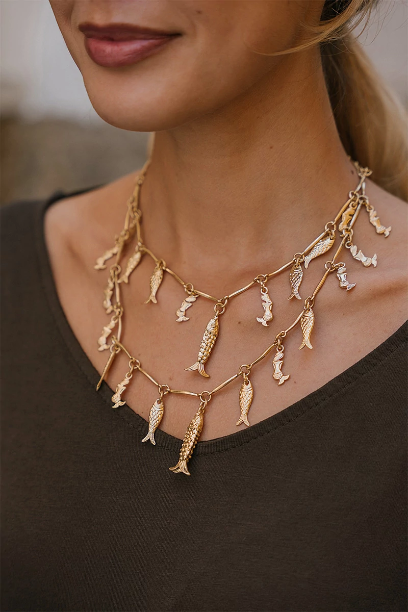 Két különálló, hosszabb rövidebb lánc halacskás függőkkel és állítható láncos csattal.
