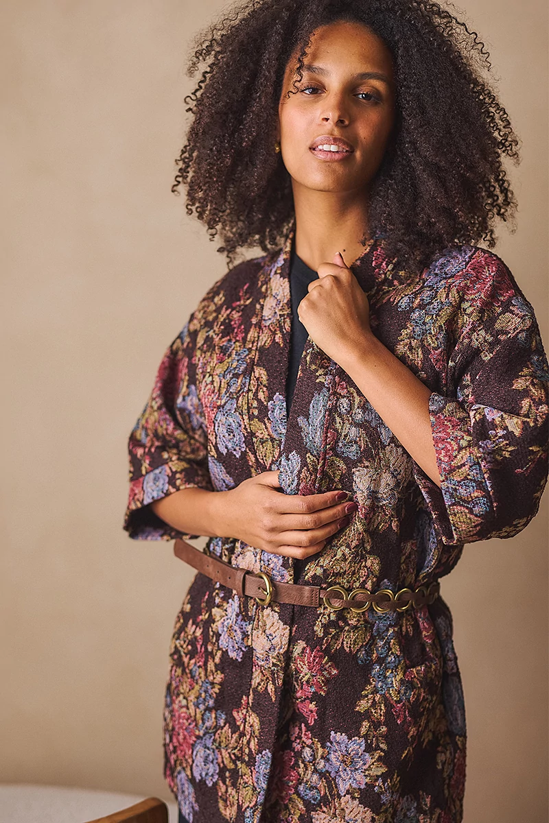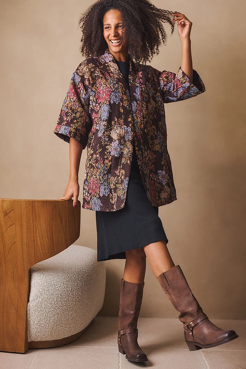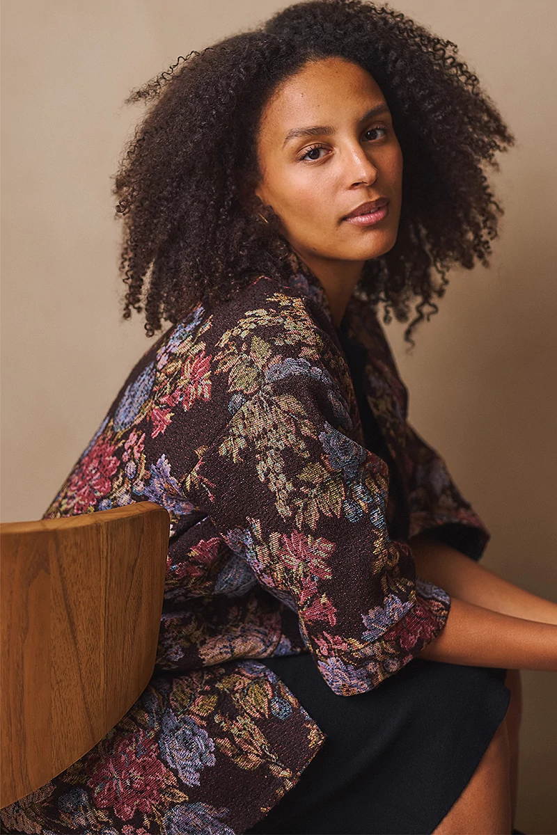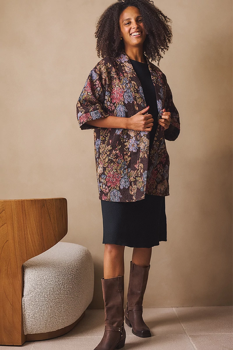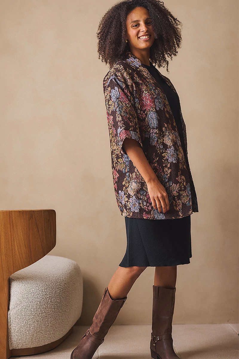 Lezserebb szabású, egyenes vonalú, béleletlen zakókabát, vágott zsebekkel, 1/2 hosszú ujjal, sálgallérral. Az anyaga nem rugalmas, mintás, közepes vastag szöttes hatású szövet.