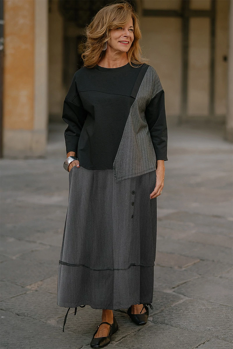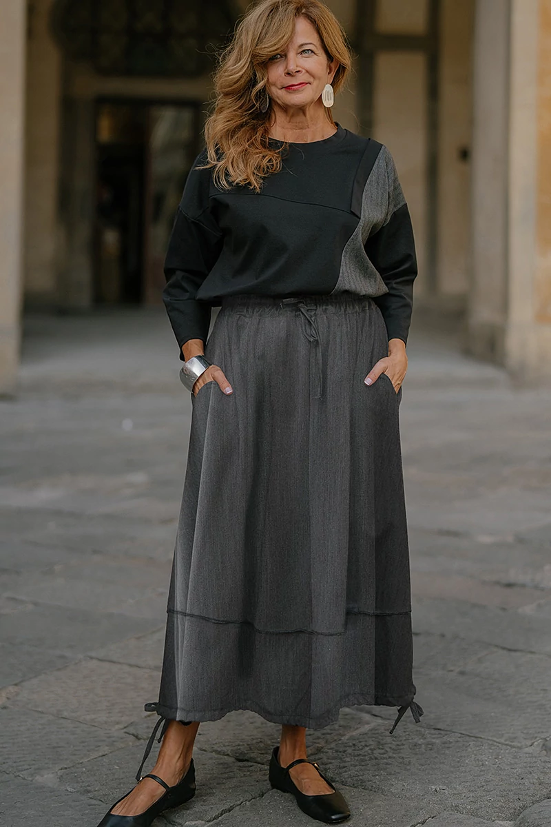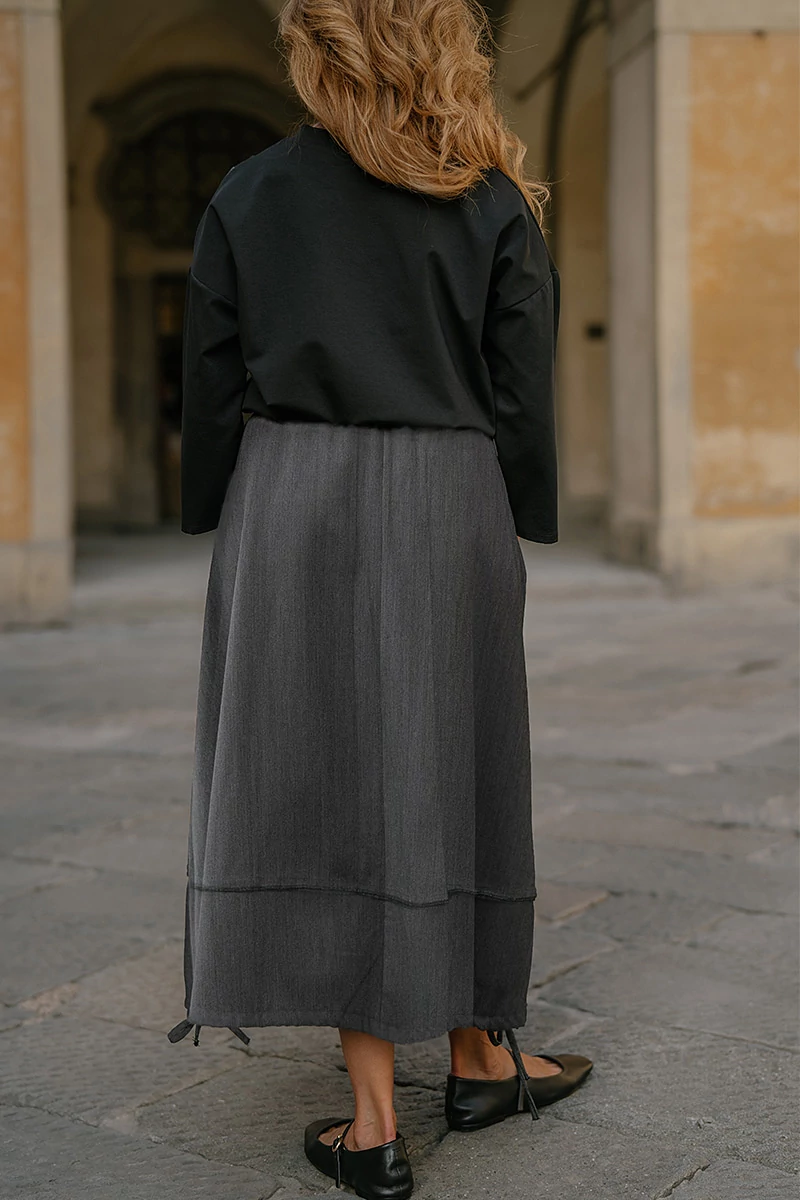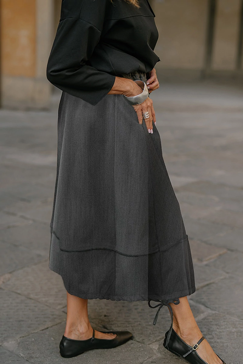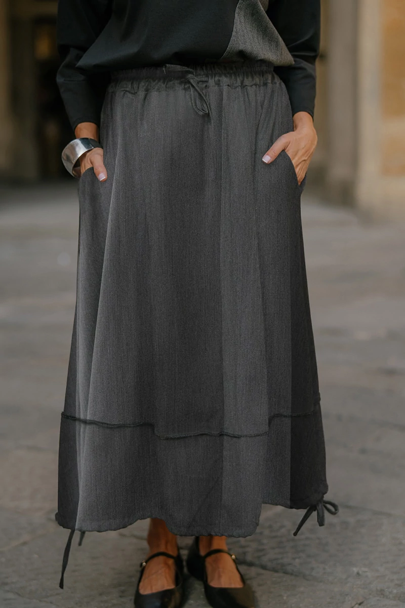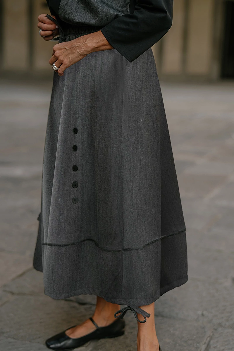Közepes hosszúságú szövet alj, gumírozott derékrésszel, elöl aszimmetrikusan, gombsorral díszített, két oldalt varrásvonalba rejtett zsebekkel, alján zsinórral húzva ráncolható. Az anyaga könnyű, nem rugalmas szövet.