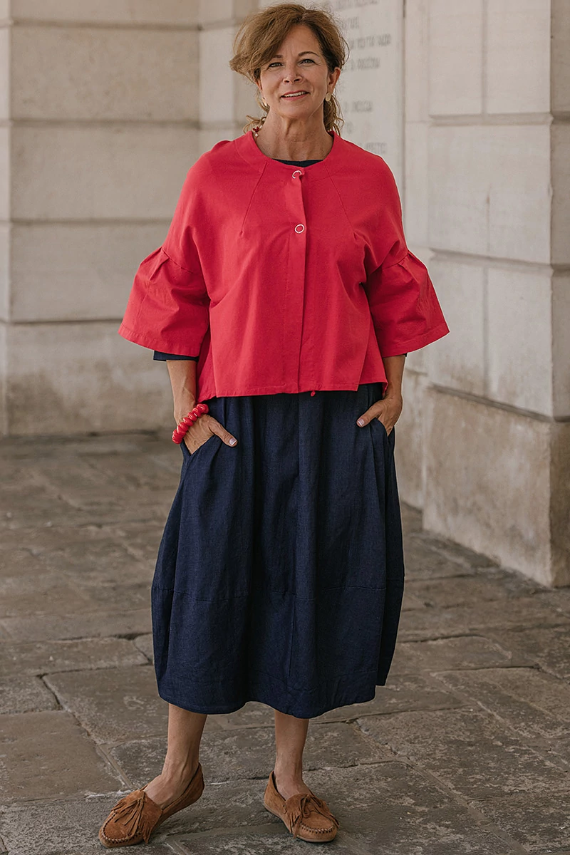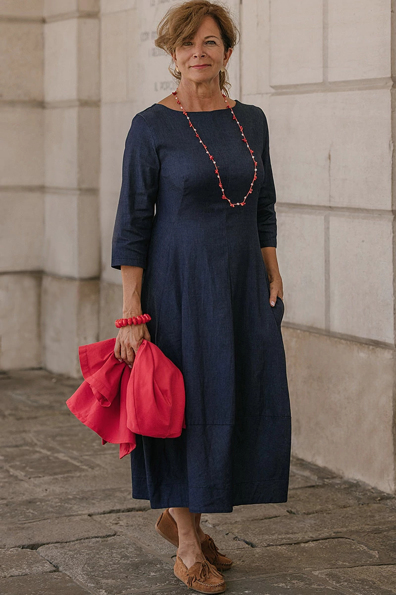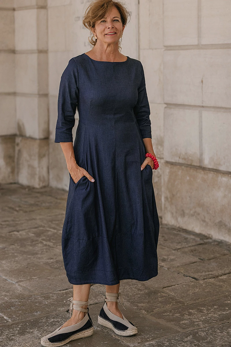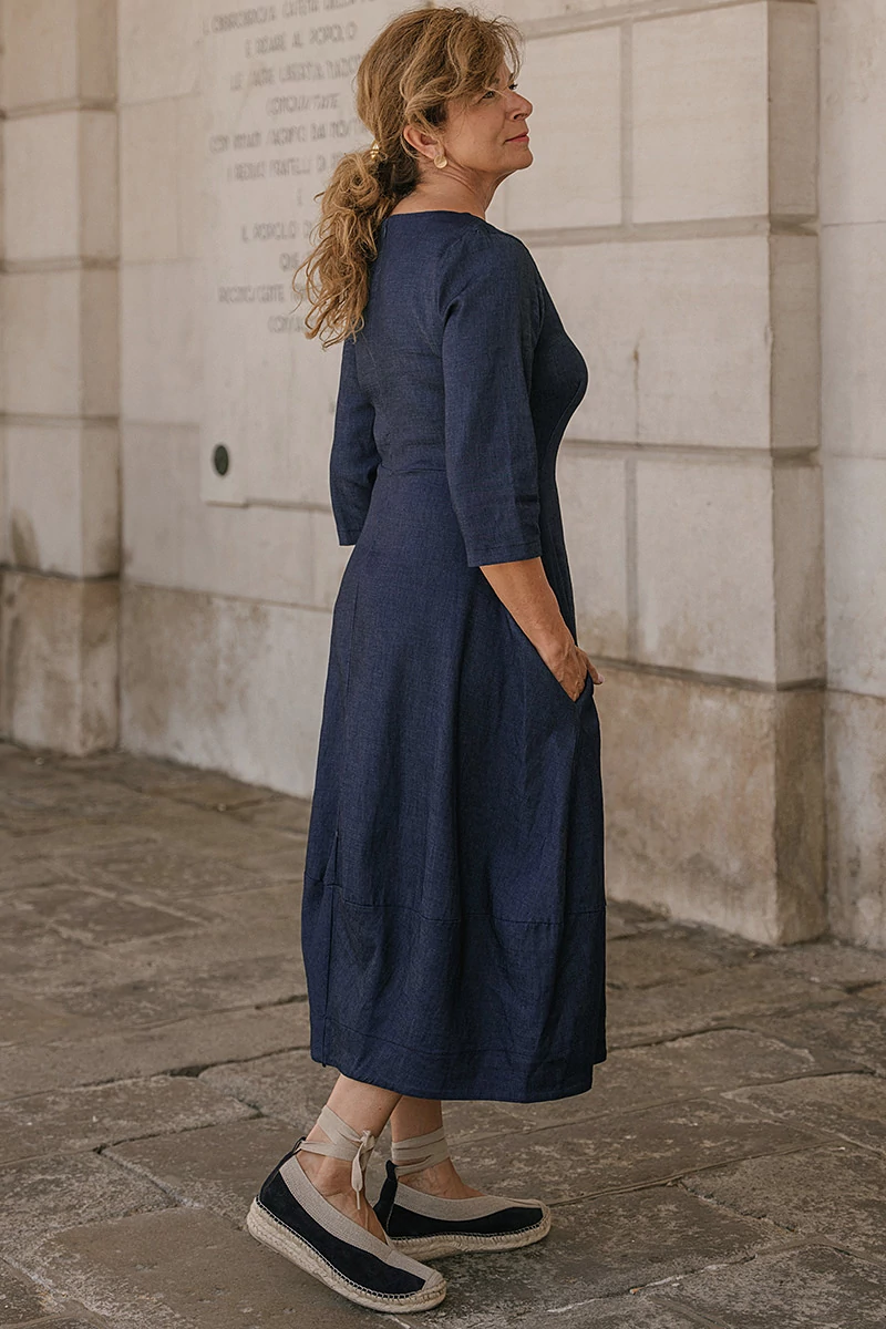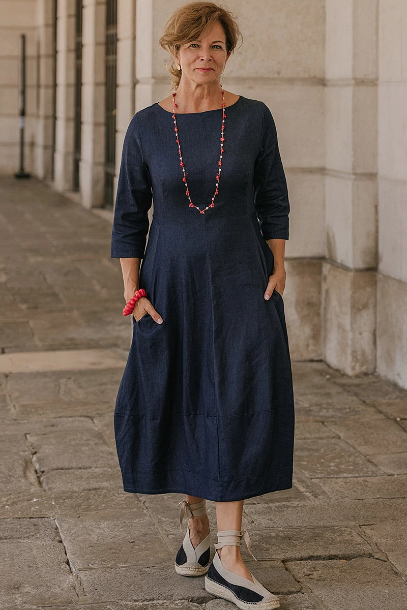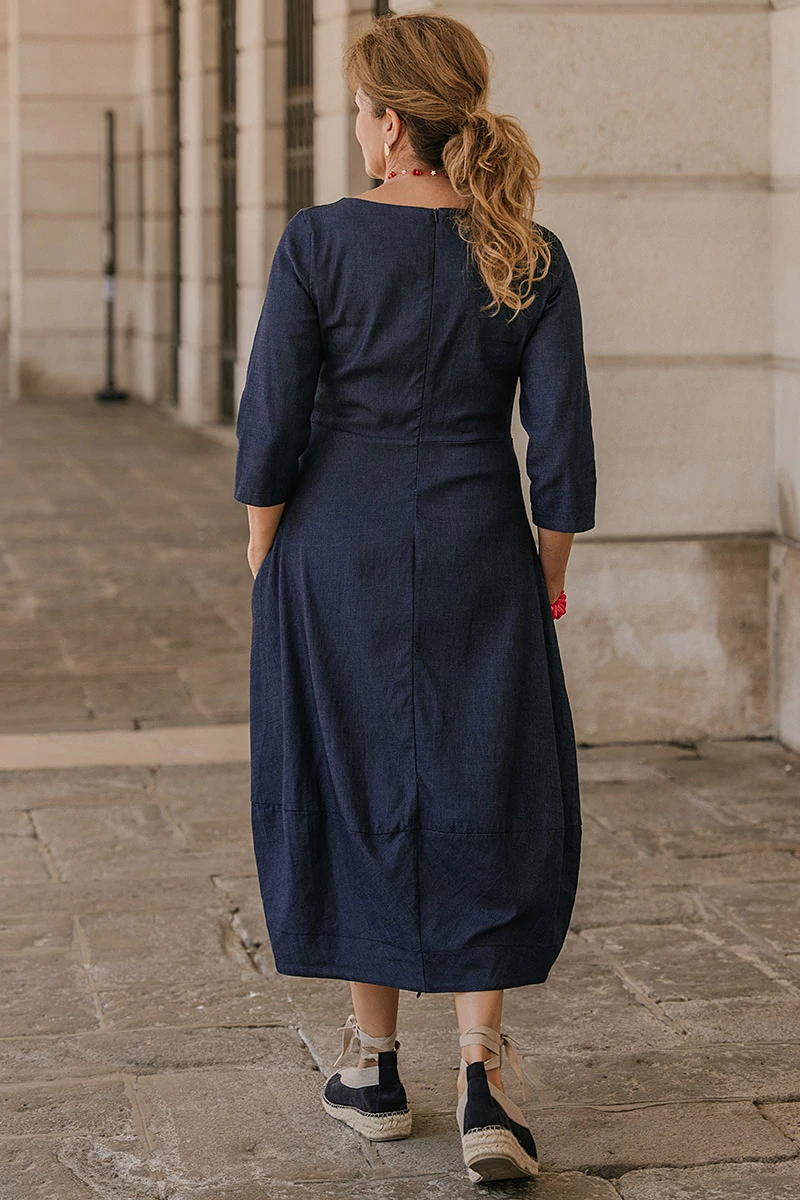 Koptatott, enyhén hagyma fazonú, karcsúsított, farmer midi ruha kerek nyakkivágással,3/4 hosszú ujjal. Csípőmagasságban varrásvonalba rejtett zsebekkel, hátul, nyakánál cipzárral. Anyaga enyhén rugalmas.
