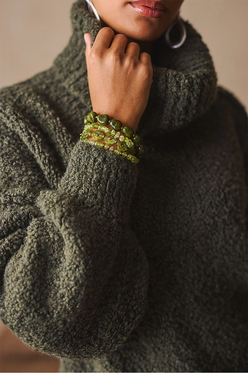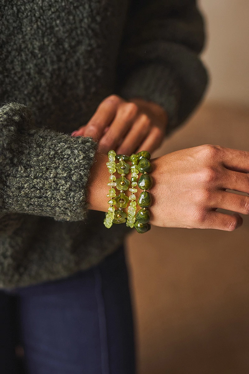 Színes, rugalmas, többsoros, gyöngyös karkötő, erős, magasfényű műanyagból. Játékos, mégis elegáns kiegészítő, ami egy mozdulattal személyessé teszi a megjelenést.