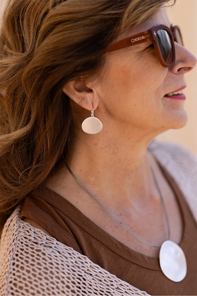 Enyhén hullámos és karcolt felületű kerek, ezüst hatású bedugós fülbevaló.