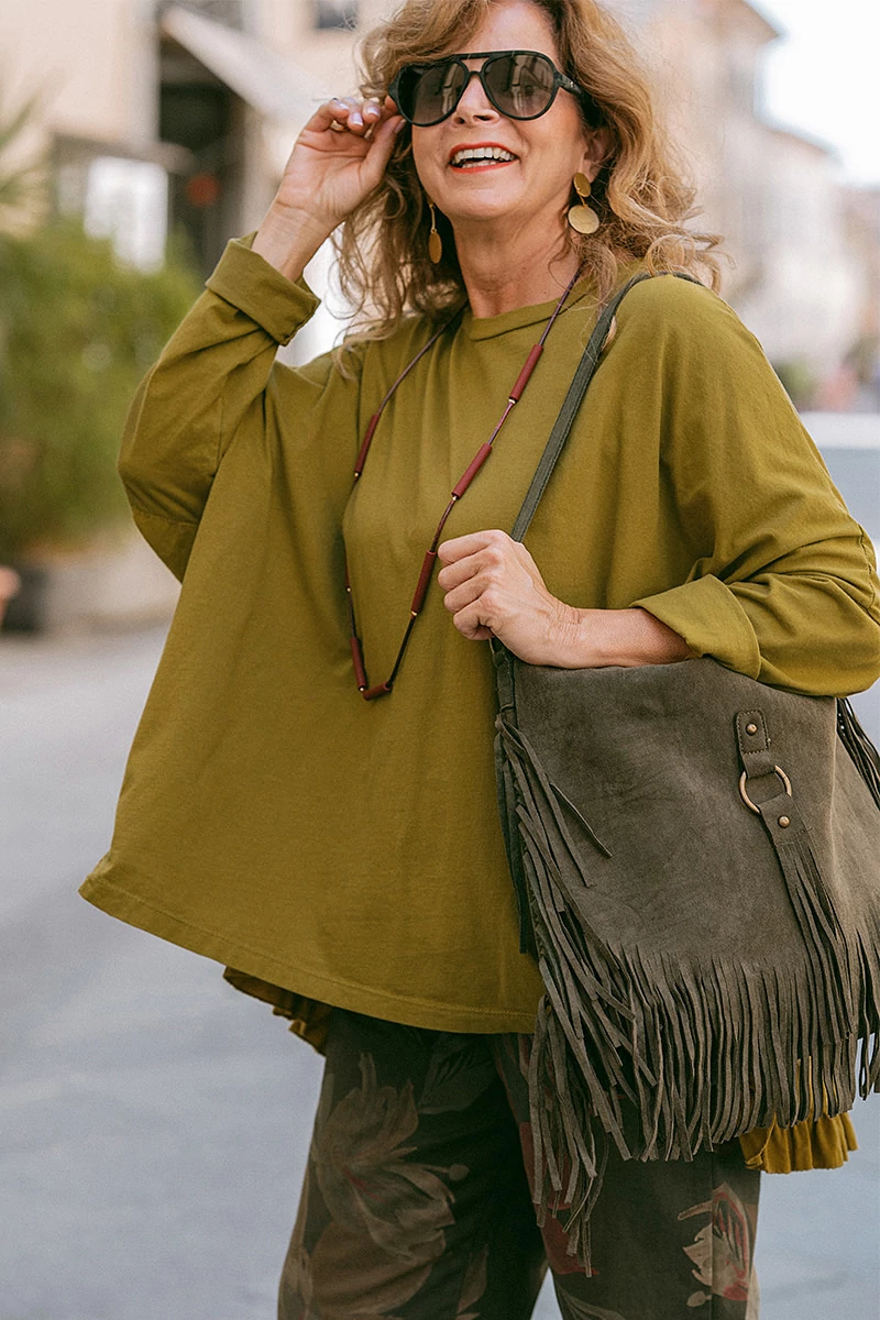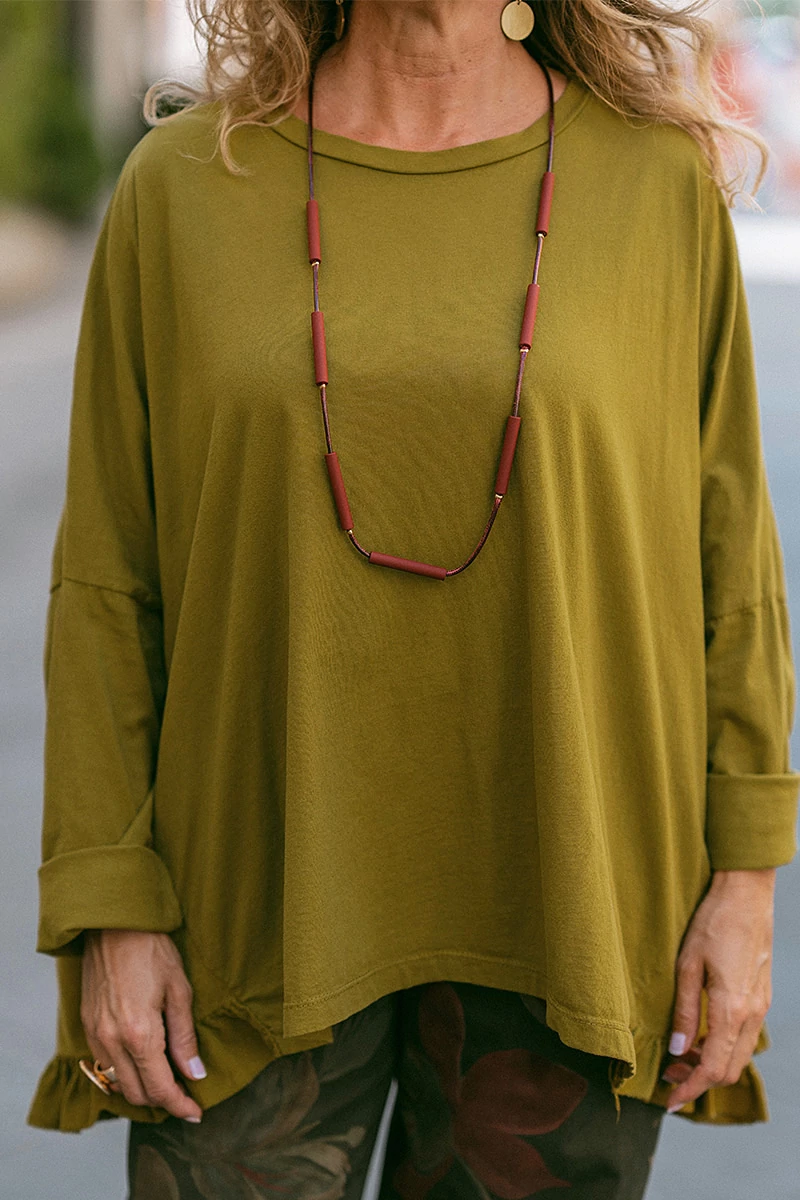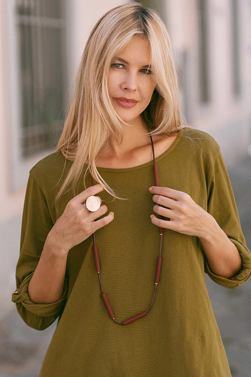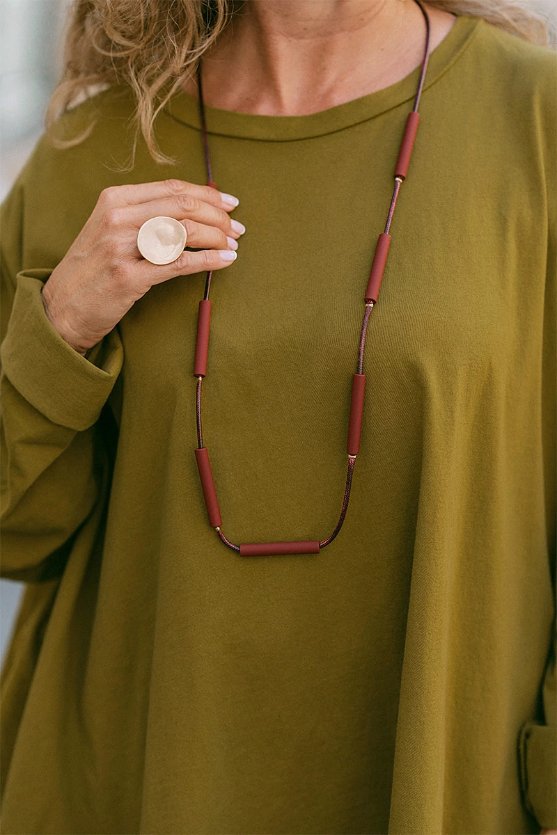 Színes, zsinóros lánc hosszú hengeres medálokkal, arany színű gyöngyökkel. A nyaklánc állítható, láncos kapoccsal záródik.