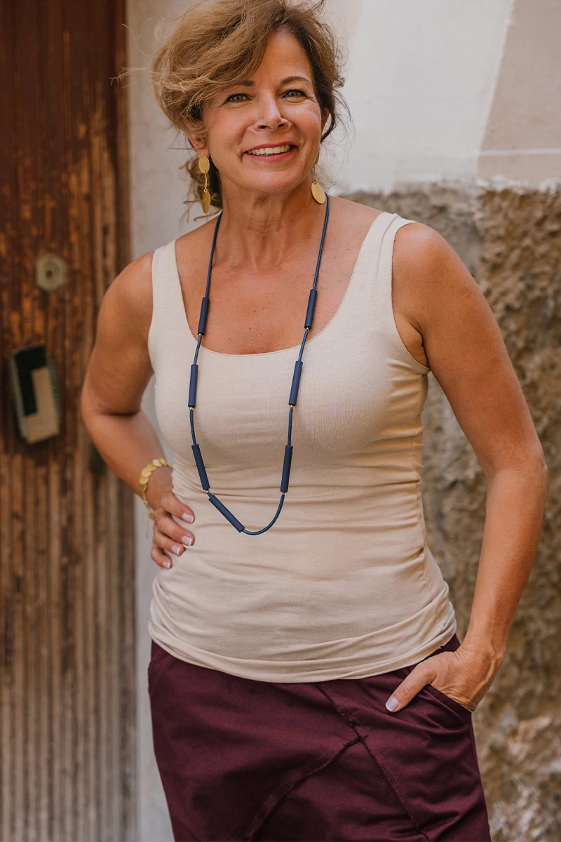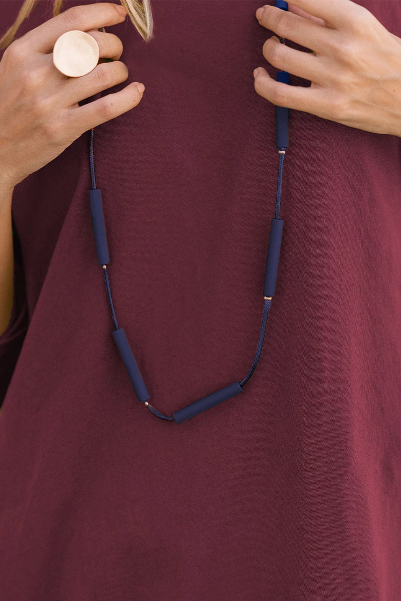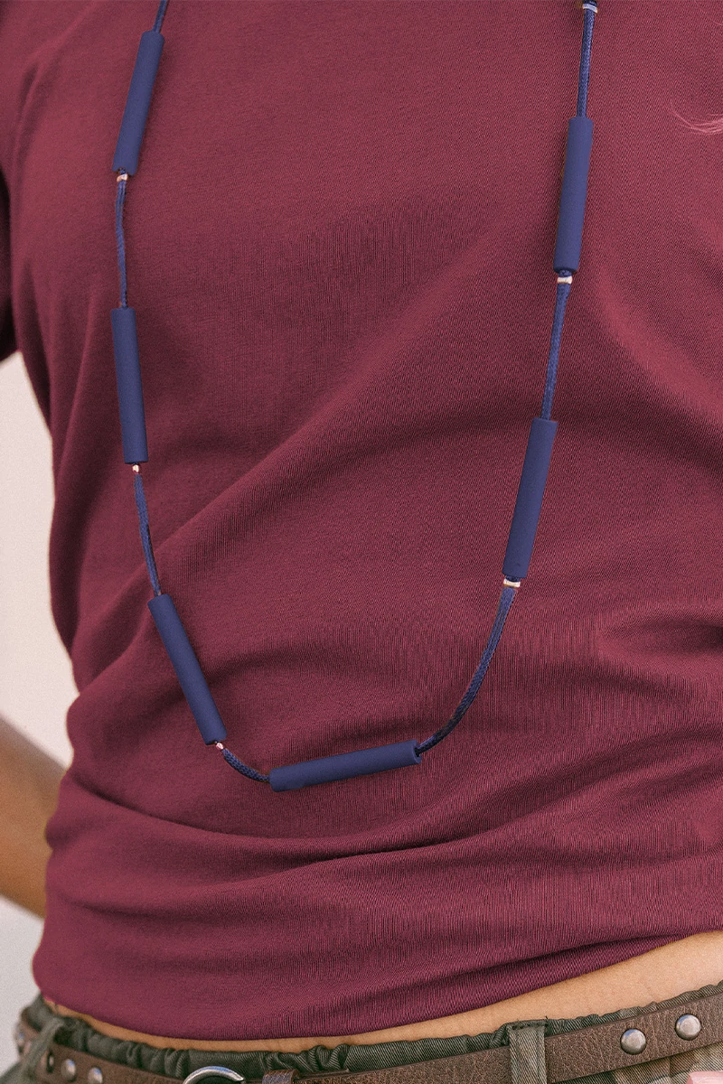 Színes, zsinóros lánc hosszú hengeres medálokkal, arany színű gyöngyökkel. A nyaklánc állítható, láncos kapoccsal záródik.