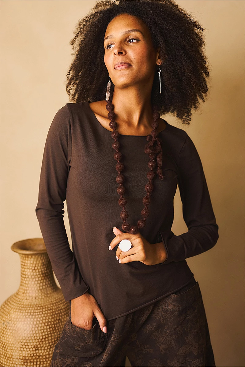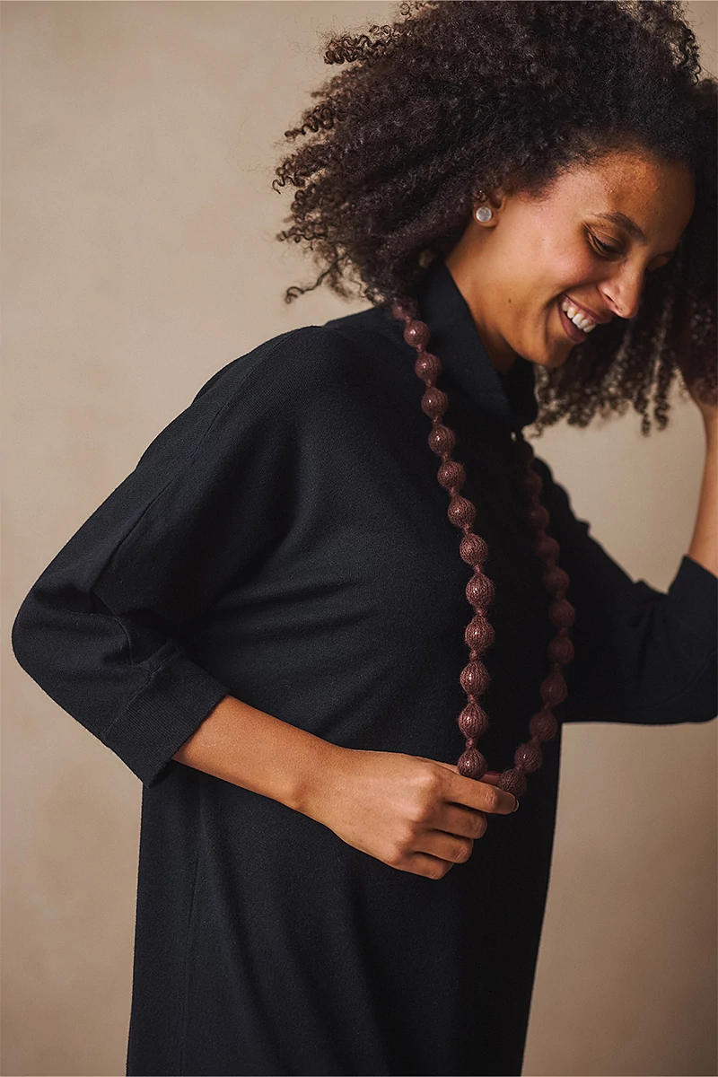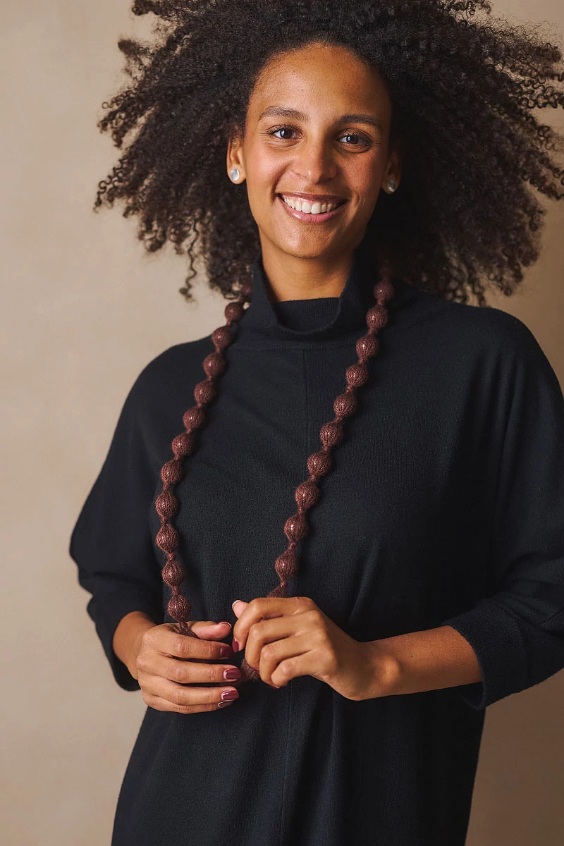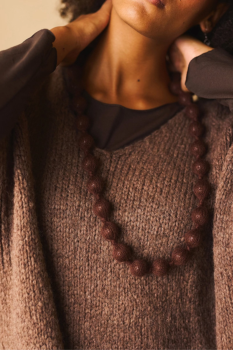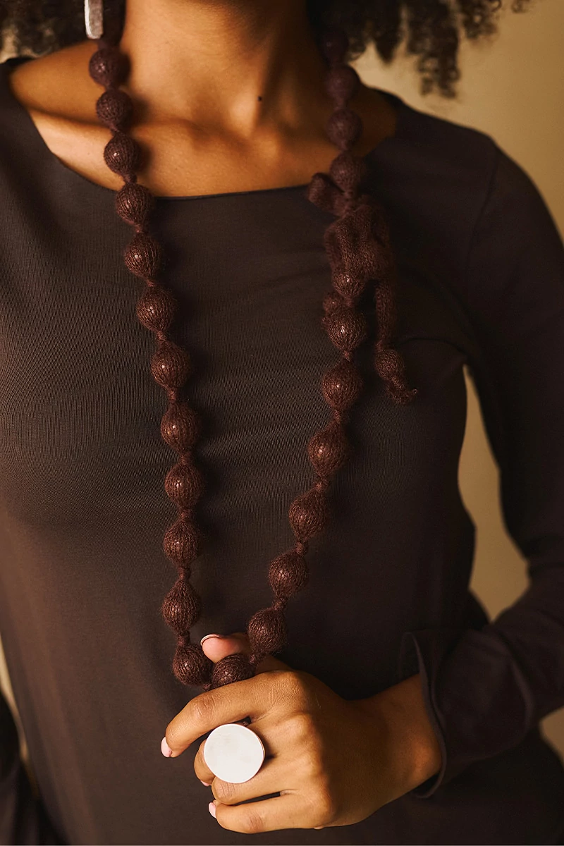 Különleges nyaklánc, amelyben a kézimunka és a modern design találkozik. A kb. 1 cm átmérőjű gyöngyöket finom horgolás borítja, a gyöngyök között aprólékos csomózás díszíti a láncot. Hosszú fazonja elegáns esést biztosít, így önmagában is hangsúlyos kiegészítő. A záródás is egyedi: a horgolt anyag csomózásával rögzíthető, ami természetes, kézműves karaktert ad a darabnak.