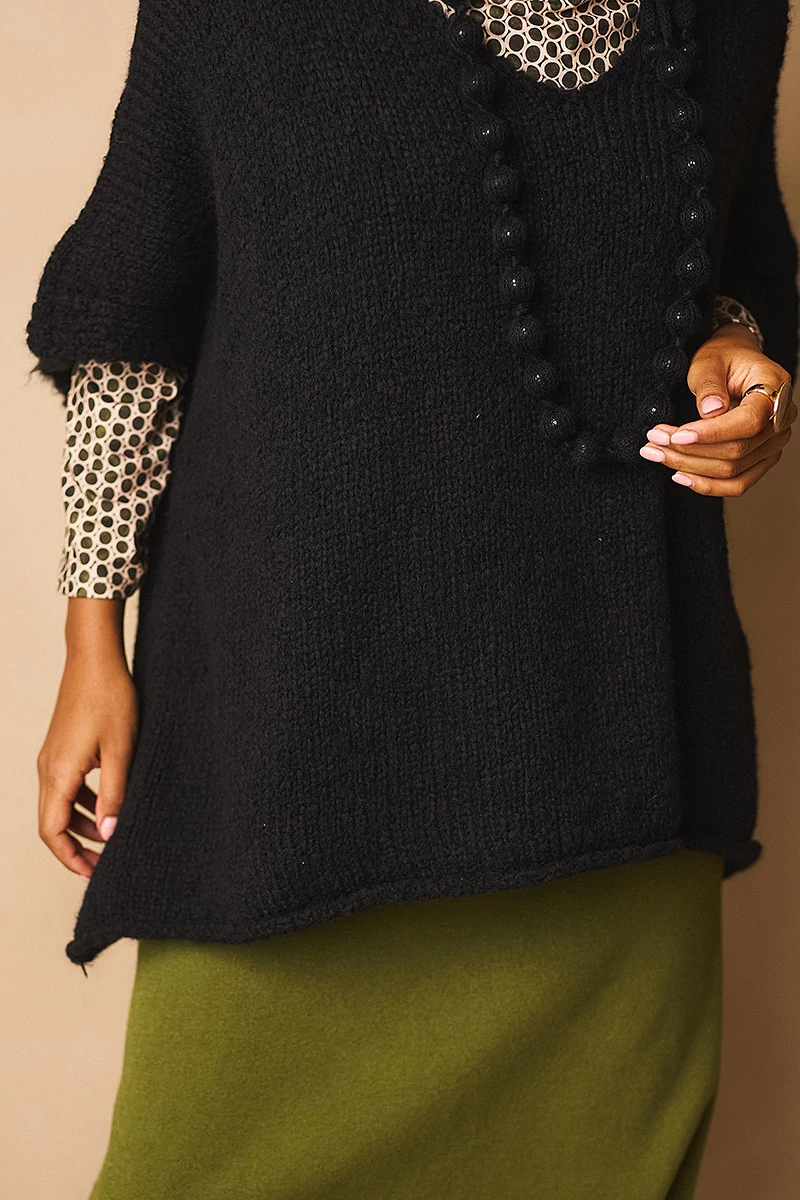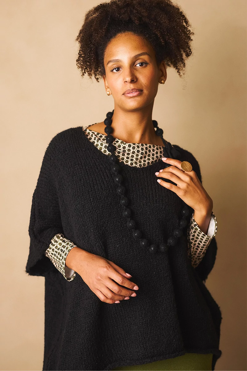 Különleges nyaklánc, amelyben a kézimunka és a modern design találkozik. A kb. 1 cm átmérőjű gyöngyöket finom horgolás borítja, a gyöngyök között aprólékos csomózás díszíti a láncot. Hosszú fazonja elegáns esést biztosít, így önmagában is hangsúlyos kiegészítő. A záródás is egyedi: a horgolt anyag csomózásával rögzíthető, ami természetes, kézműves karaktert ad a darabnak.