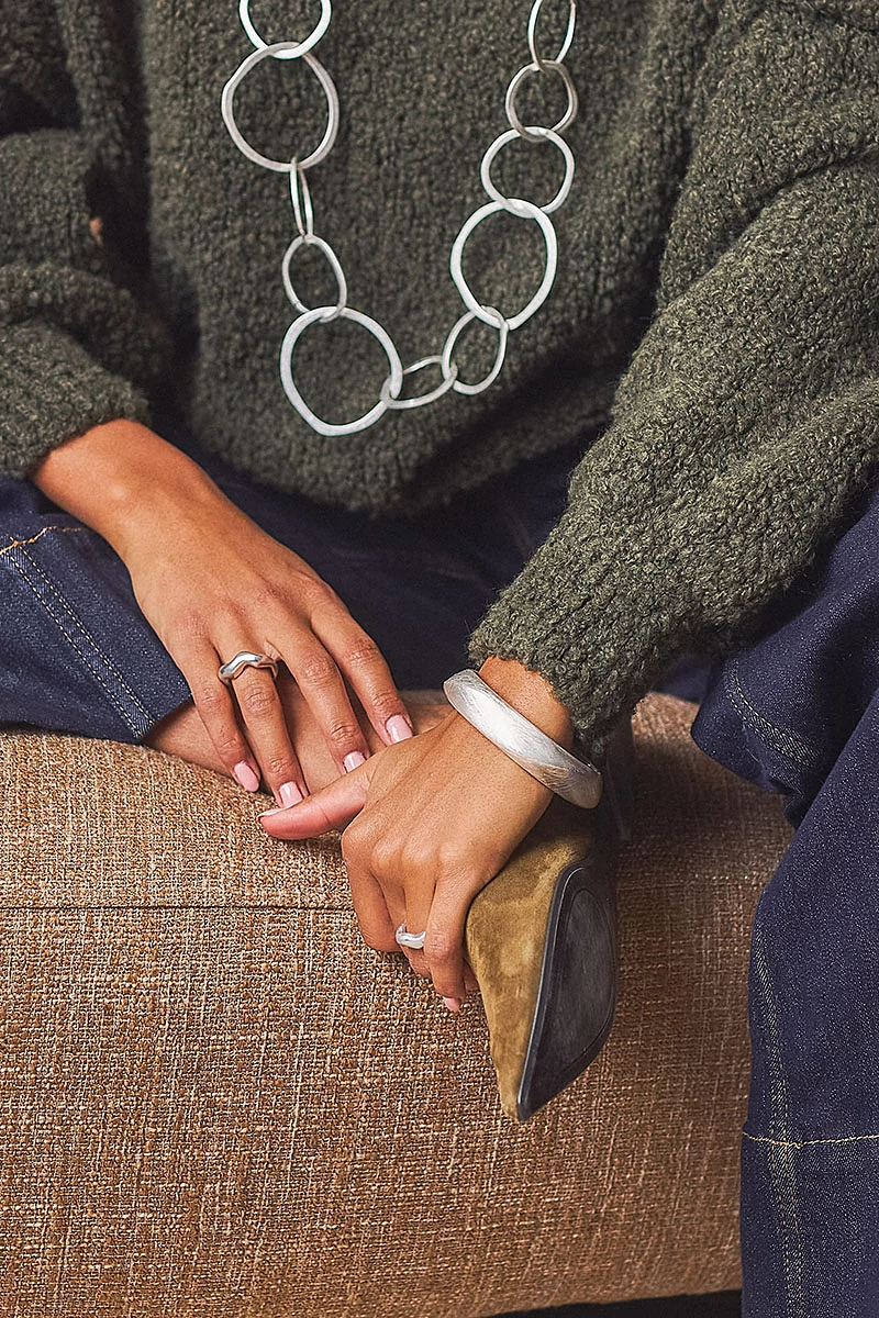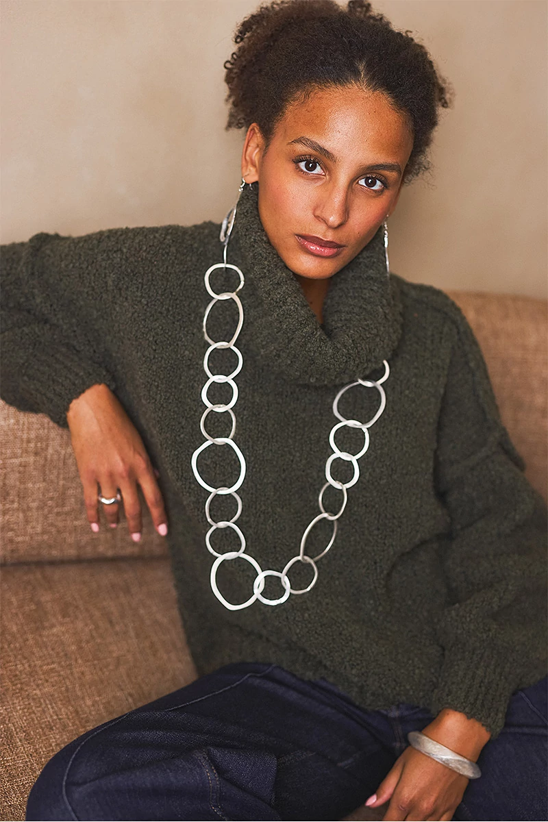 Hosszú, többsoros lánc koptatott hatású, egymásba fonódó fém karikákkal, állítható csatos záródással. Könnyített anyagból. Stílusos, elegáns kiegészítő, ami egy mozdulattal személyessé teszi a megjelenést.