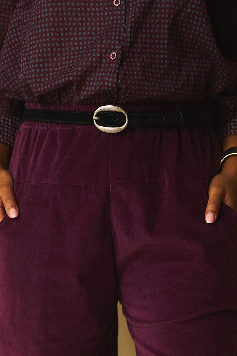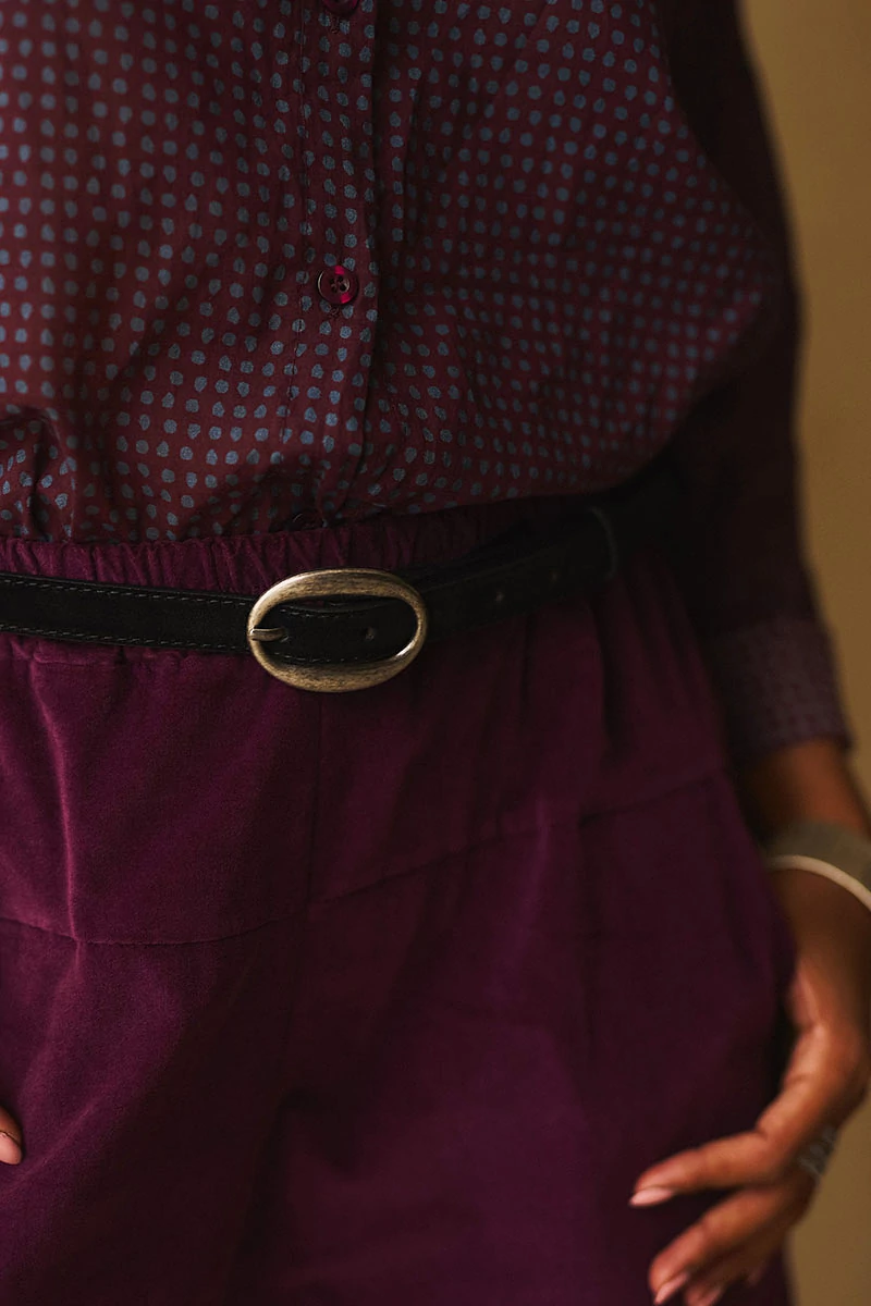 Állítható velúrbőr öv szögletes fém csattal, bújtatóval.