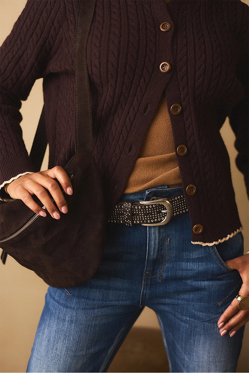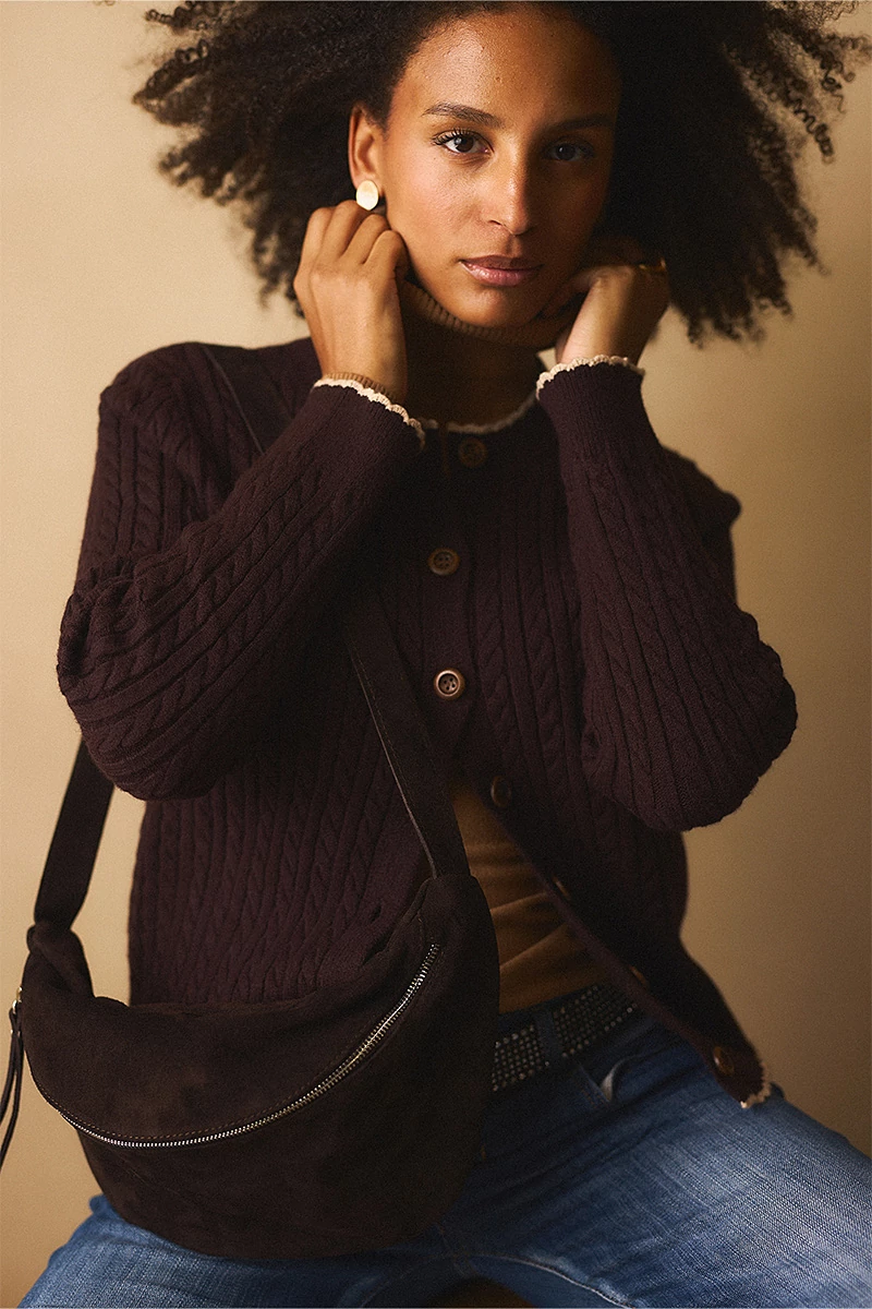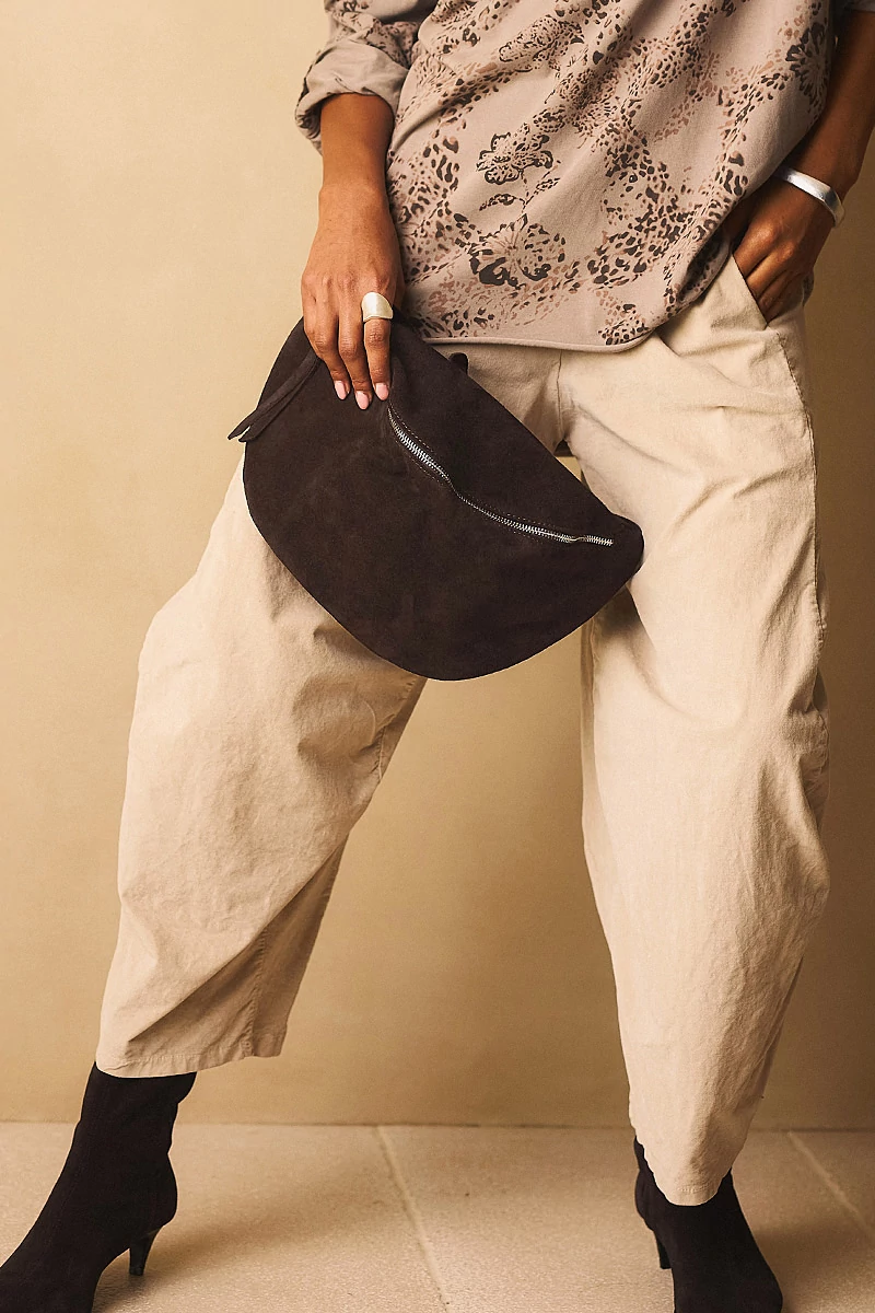 Velúr bőr övtáska stílusos és praktikus kiegészítő,  belül béléssel, és cipzáros zsebbel és egy külső cipzáros zsebbel a kisebb értékek biztonságos tárolására. Felül két fémcipzárral záródik, amely modern, letisztult karaktert kölcsönöz a darabnak. A levehető, állítható hosszú pántnak köszönhetően vállon átvetve is kényelmesen viselhető, így könnyedén igazítható a mindennapi öltözékhez.