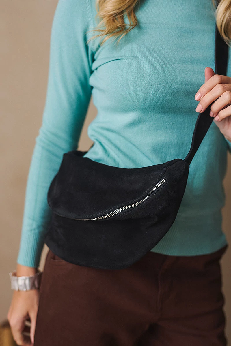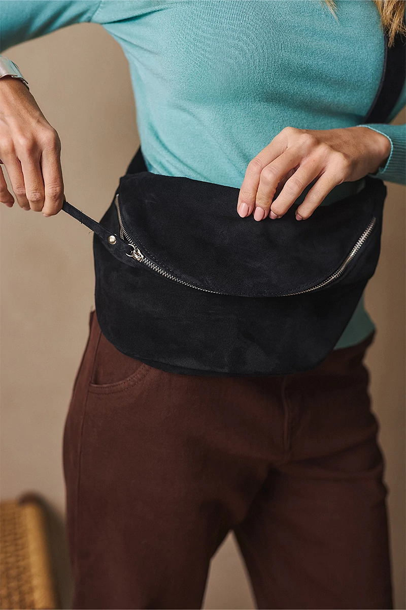 Velúr bőr övtáska stílusos és praktikus kiegészítő,  belül béléssel, és cipzáros zsebbel és egy külső cipzáros zsebbel a kisebb értékek biztonságos tárolására. Felül két fémcipzárral záródik, amely modern, letisztult karaktert kölcsönöz a darabnak. A levehető, állítható hosszú pántnak köszönhetően vállon átvetve is kényelmesen viselhető, így könnyedén igazítható a mindennapi öltözékhez.