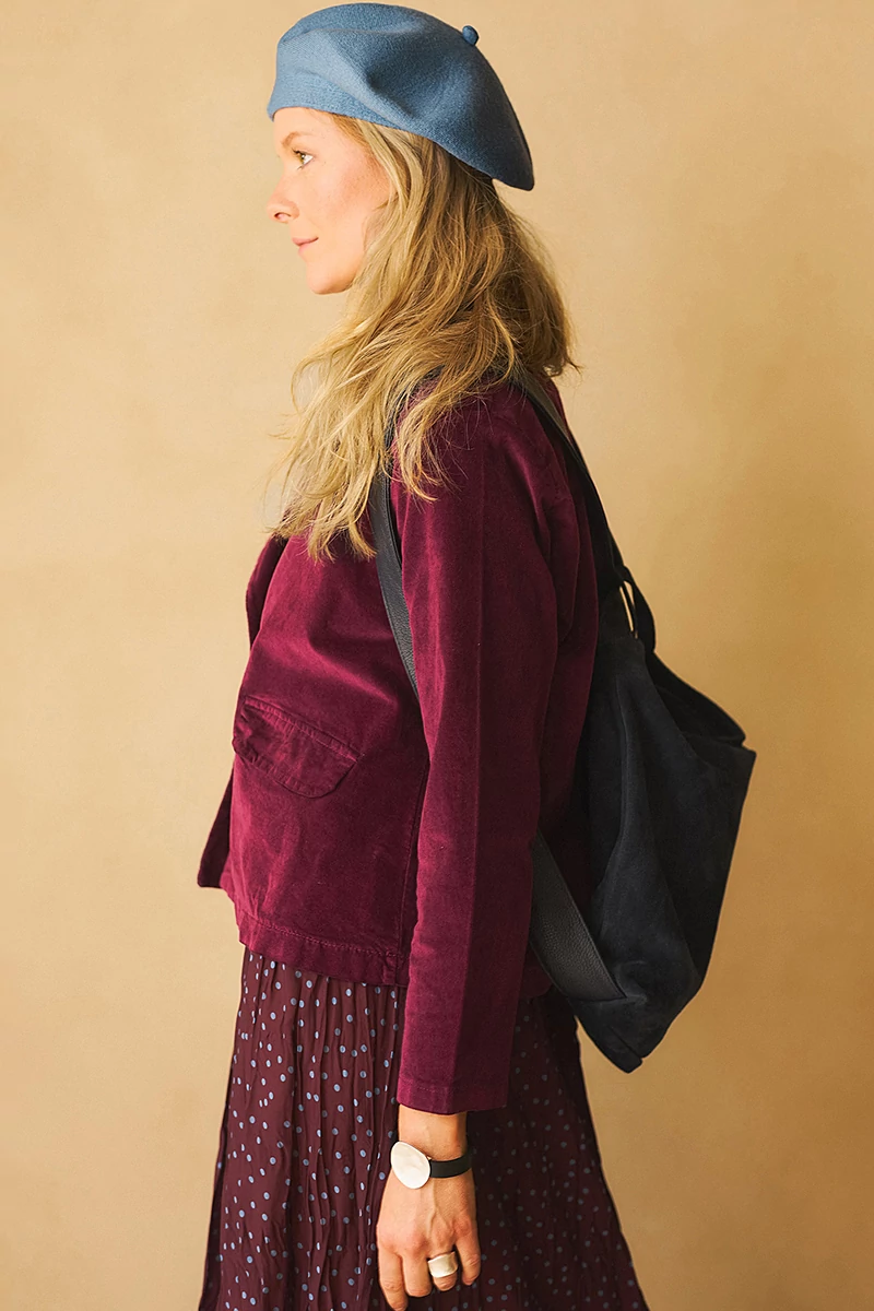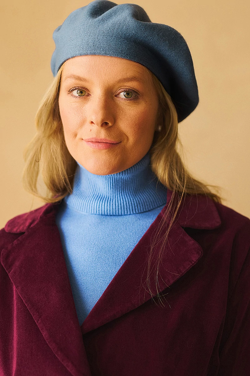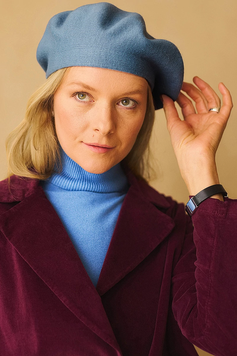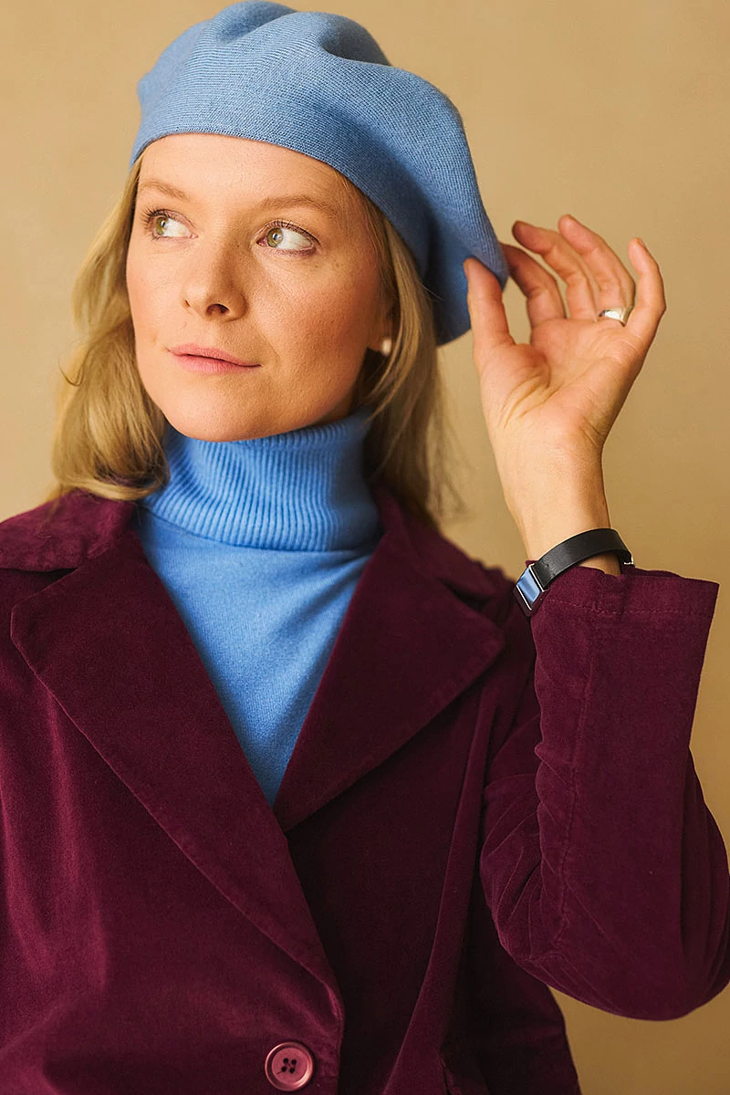 Nőies sapkafazon, franciás stílus. Bélelt, az anyaga kasmír puhaságú, rugalmas hurkolt szövet.