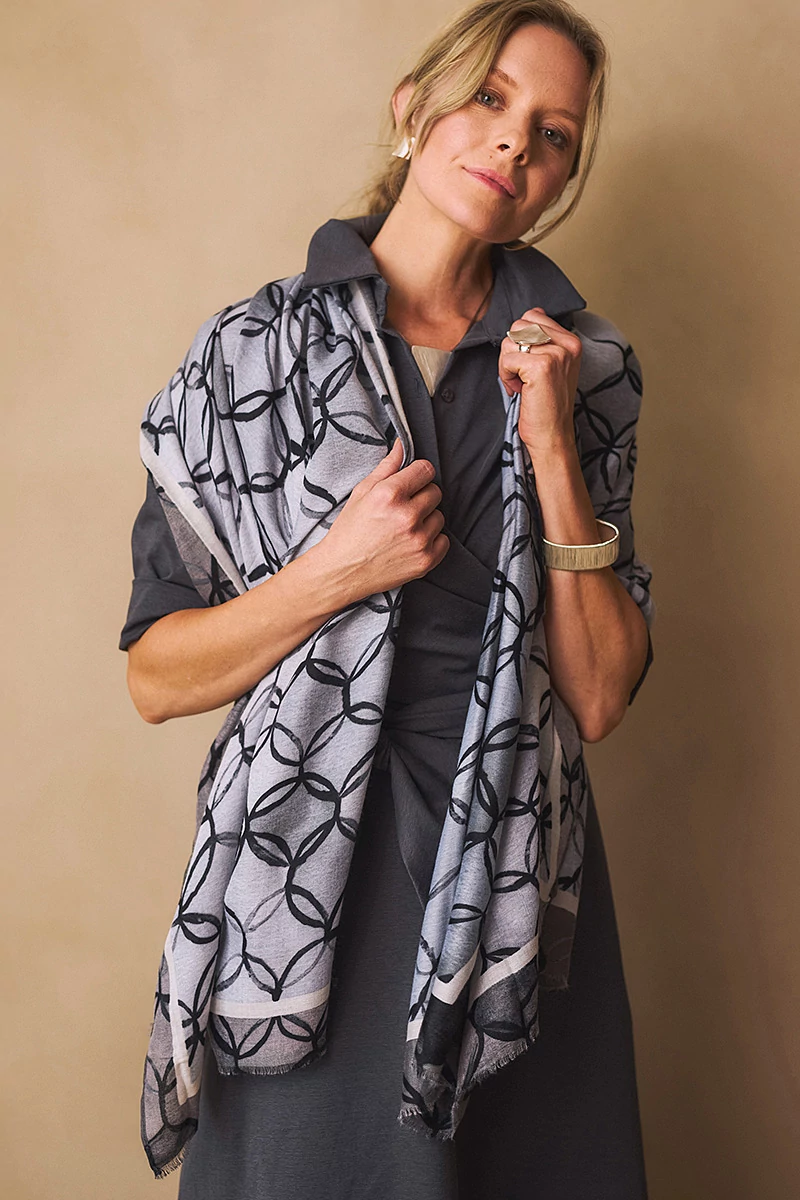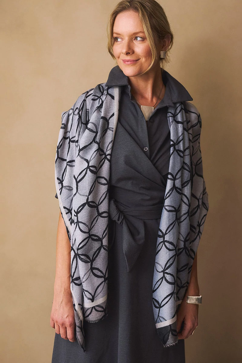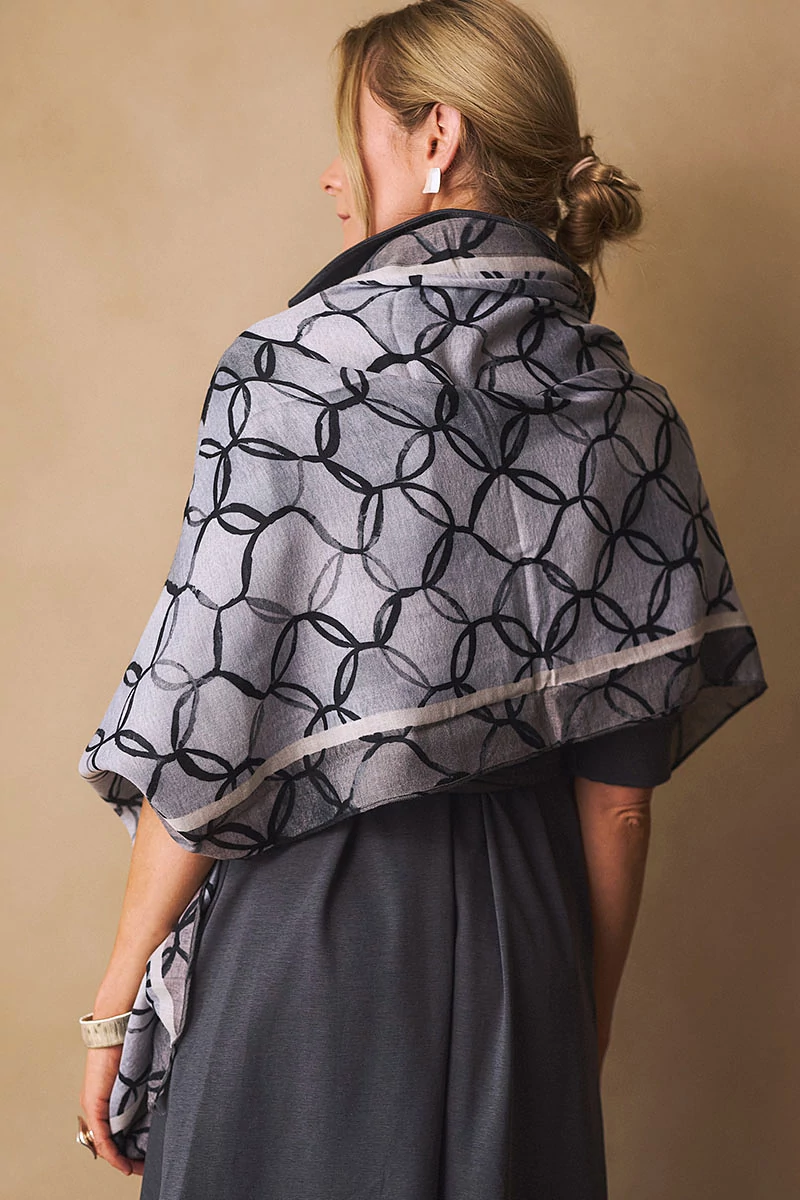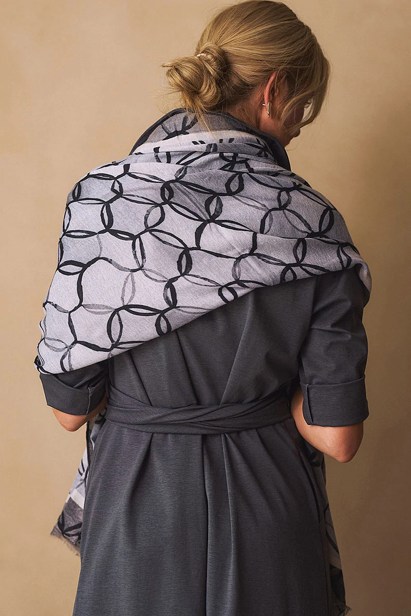 Széles, nyomott mintás, stóla. Az anyaga nem rugalmas. Két széle szegett, két vége finoman rojtozott.