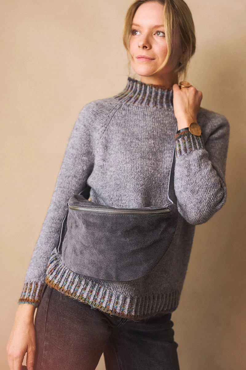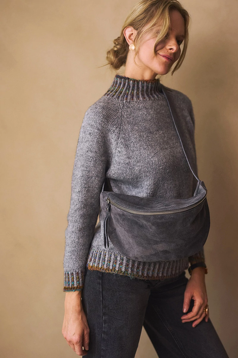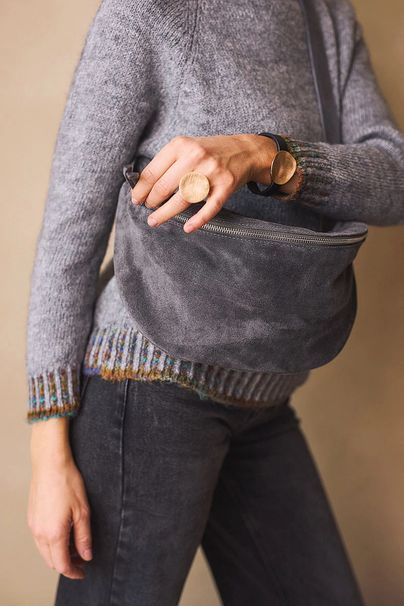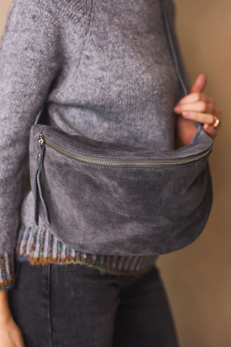 Velúr bőr övtáska stílusos és praktikus kiegészítő, belül béléssel, és cipzáros zsebbel és egy külső cipzáros zsebbel a kisebb értékek biztonságos tárolására. Felül két fémcipzárral záródik, amely modern, letisztult karaktert kölcsönöz a darabnak. A levehető, állítható hosszú pántnak köszönhetően vállon átvetve is kényelmesen viselhető, így könnyedén igazítható a mindennapi öltözékhez.