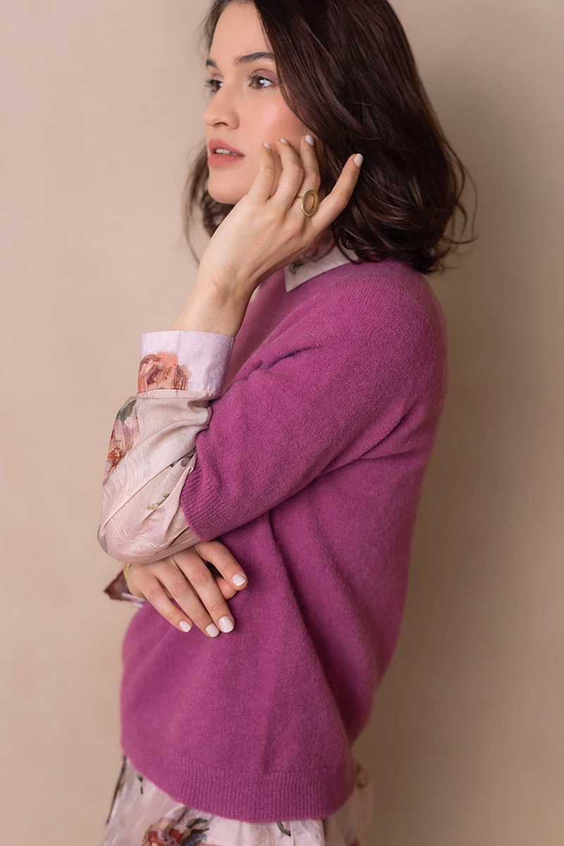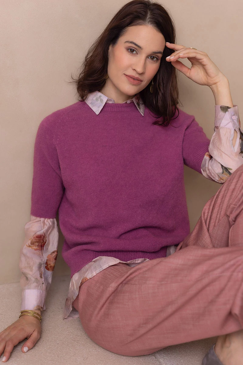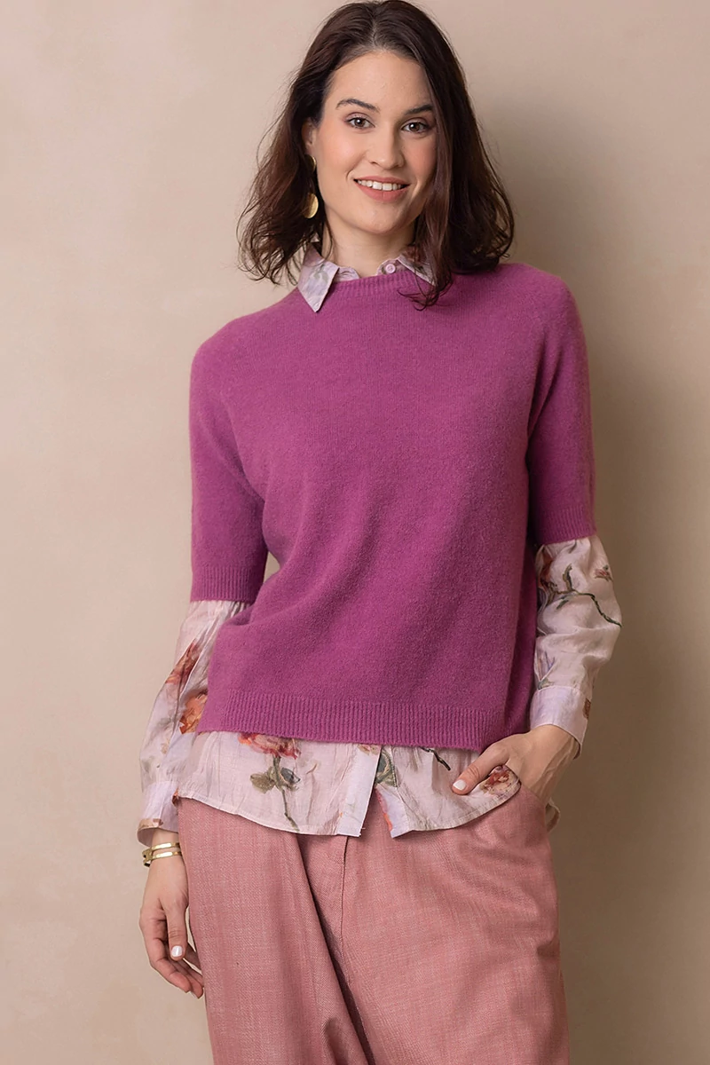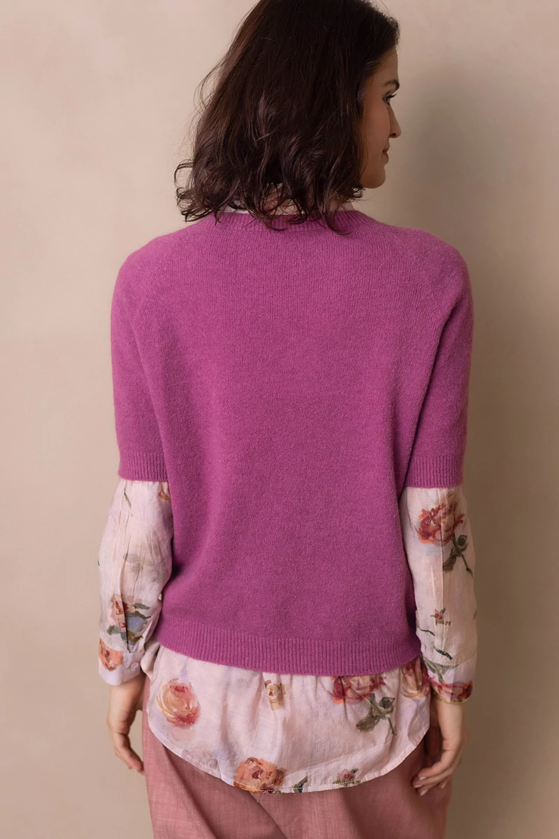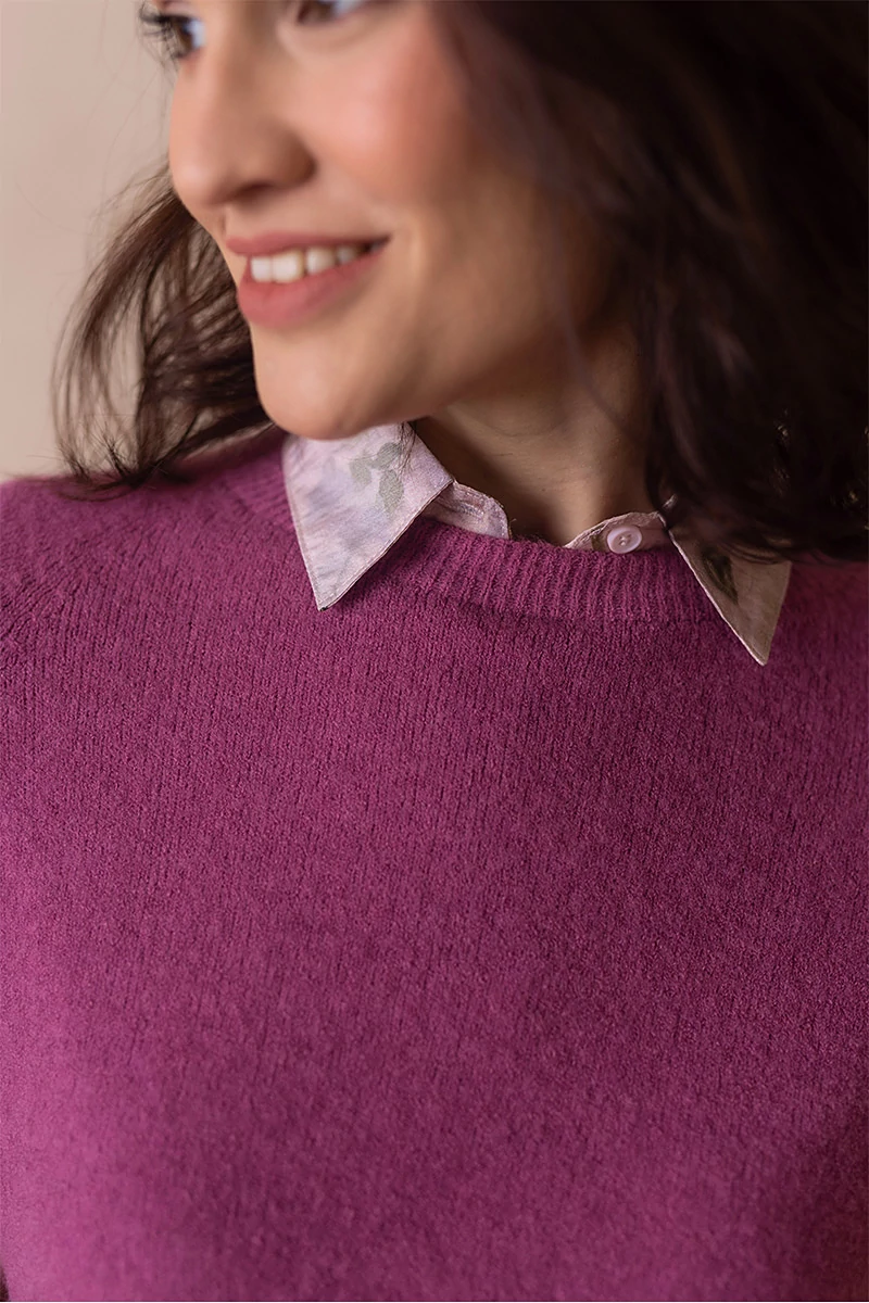 Lágy esésű, finom tapintású kötött felső, ami egyszerre kényelmes és nőies.A passzés, rövid raglán ujj könnyed mozgást enged, és laza eleganciát sugall. Egyszerre sportosan természetes és finoman sikkes.