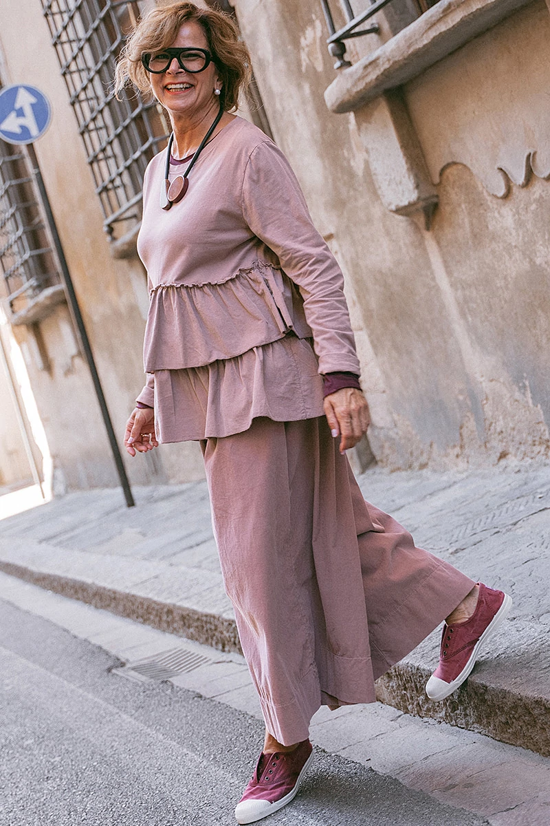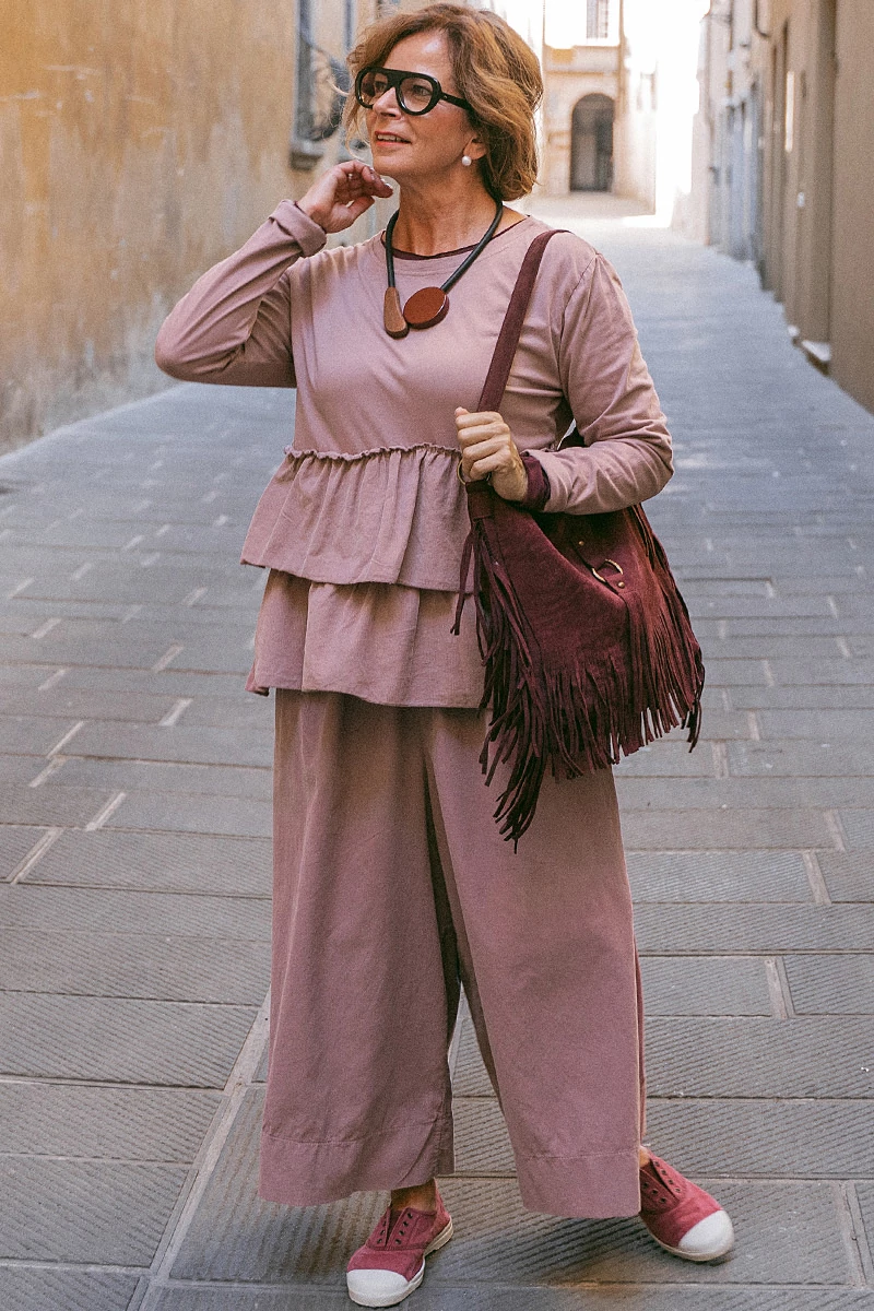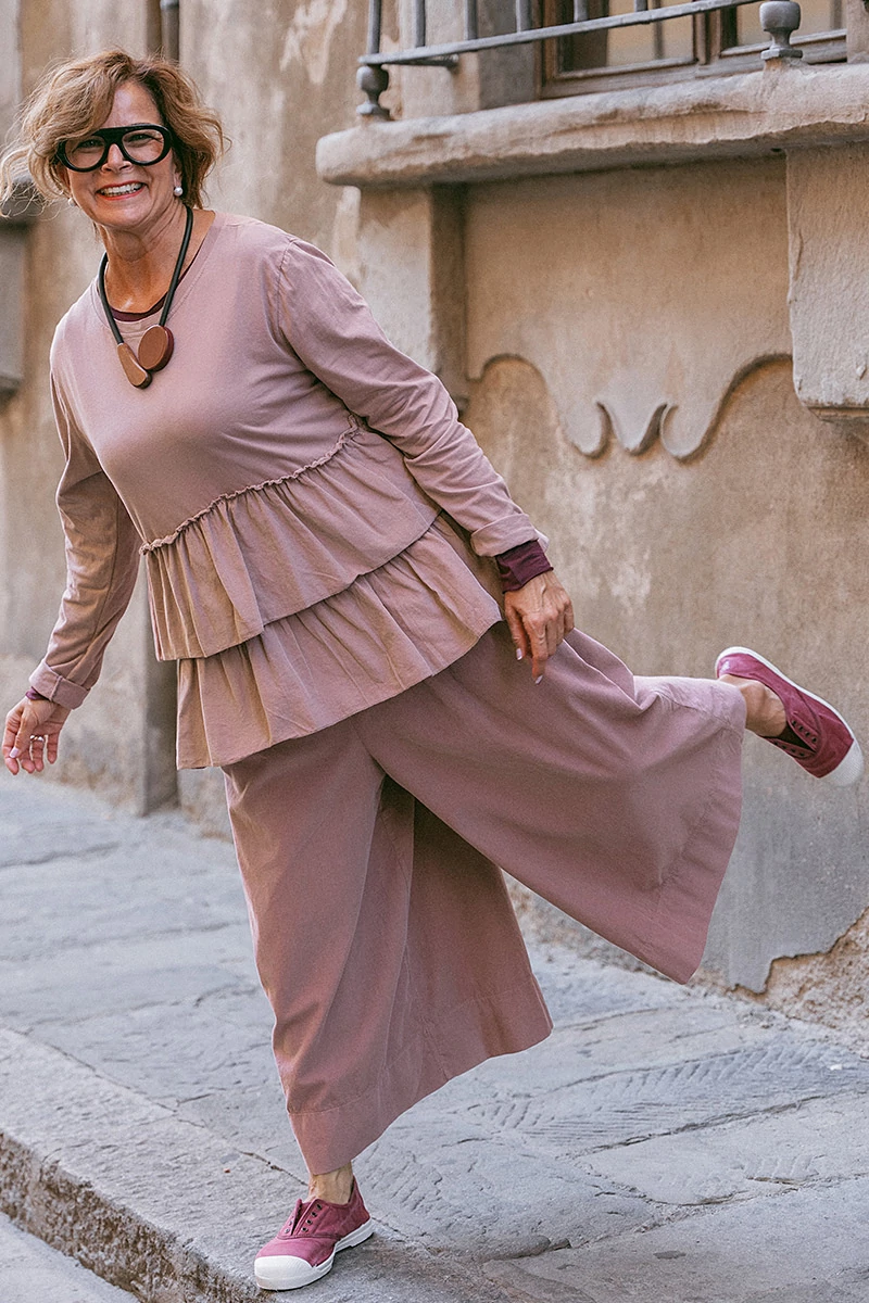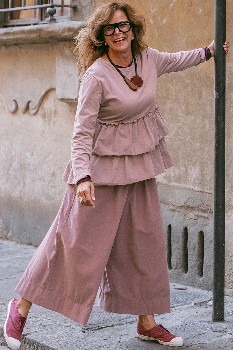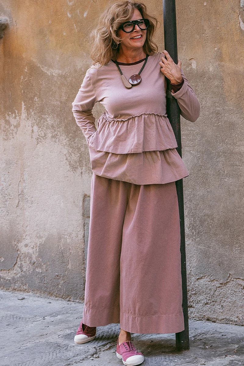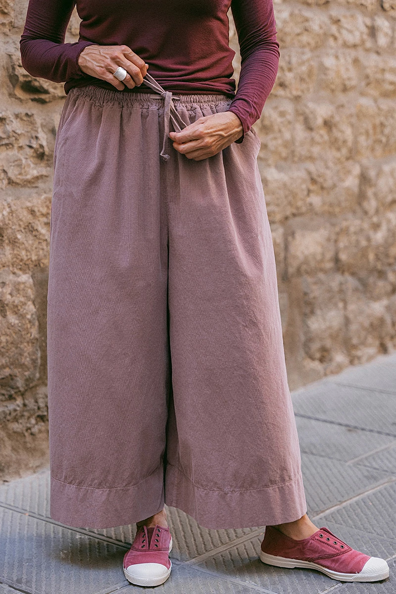 Bőszárú szoknyanadrág széles gumírozott, zsinóros derékkal zsebekkel. Az anyaga puha, enyhén rugalmas mikrokord bársony.