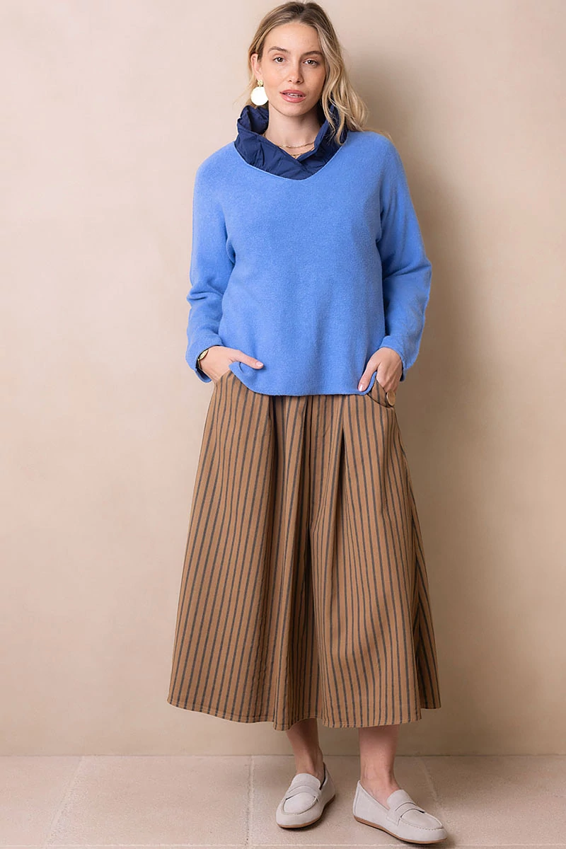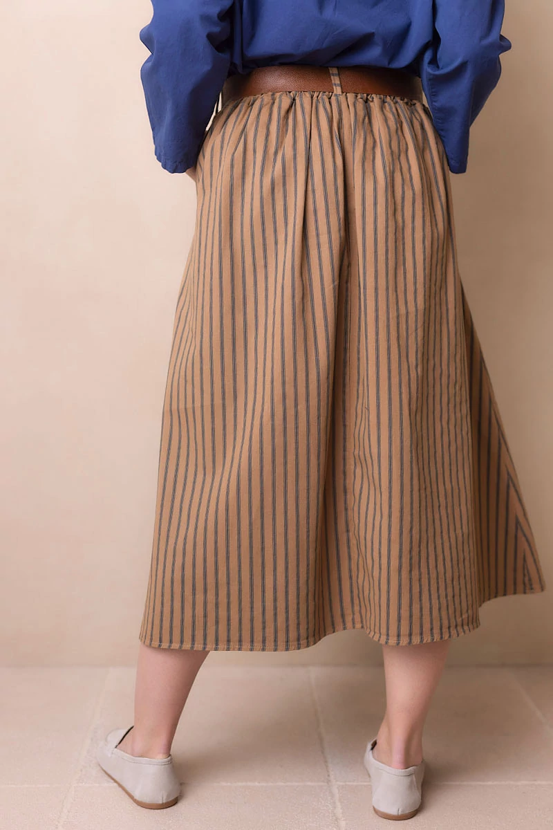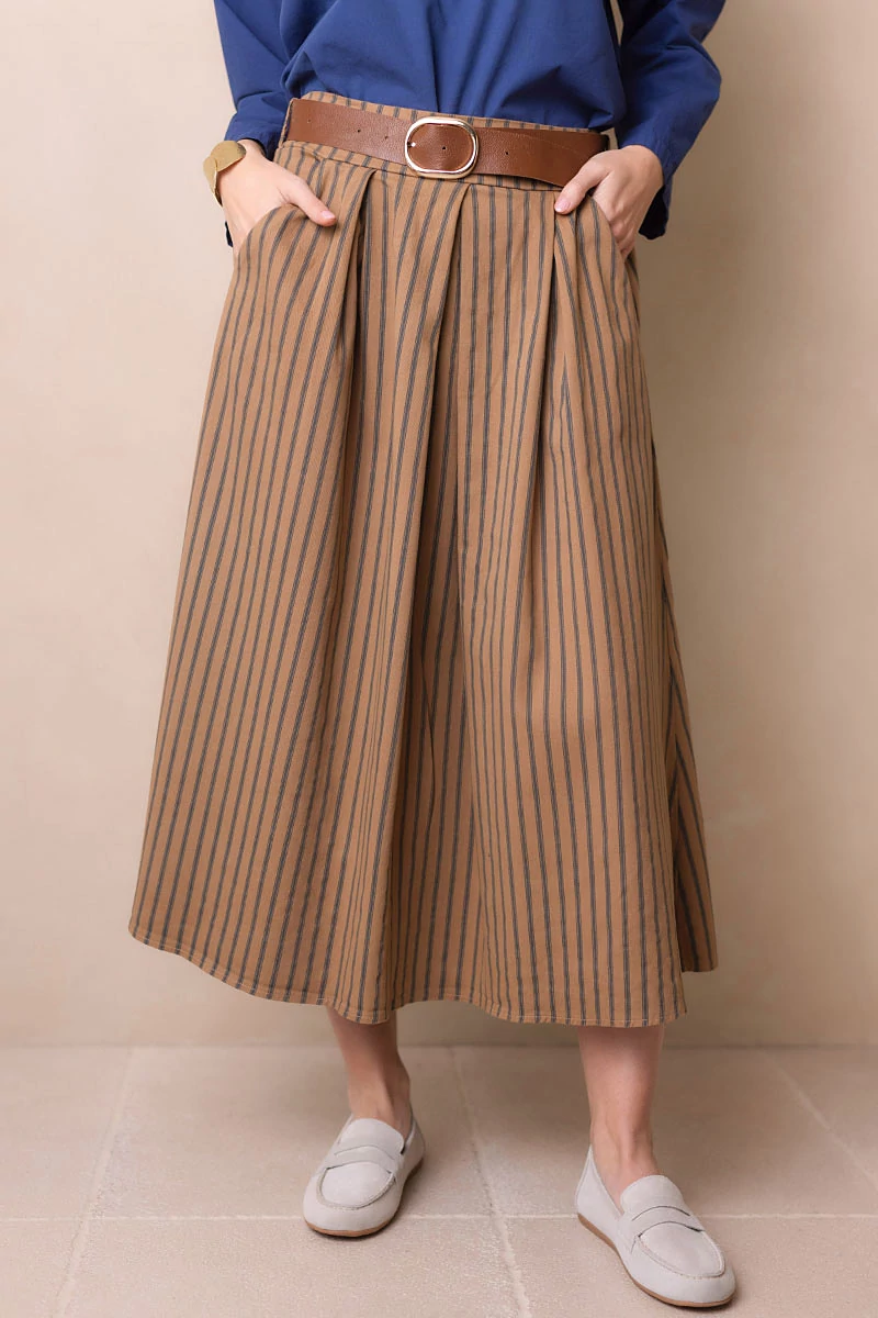 A csíkos minta és a vászon találkozása az elegancia halk ígéretét hordozzák.Az alj közepes hosszal, elöl zsebekkel, elöl fix, hajtásokkal bővülő, hátul széles, gumis derékrésszel ráncolt. A szoknya puha, pamutvászon anyag. A szoknyához ajándék egy fémcsatos műbőr öv.