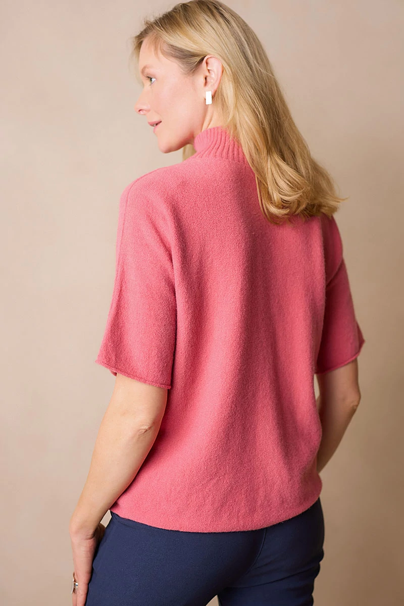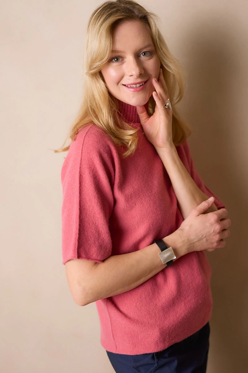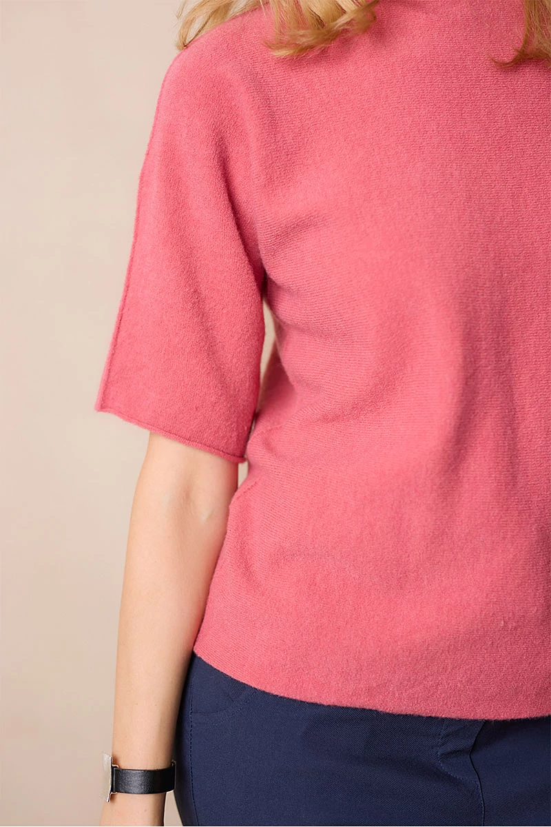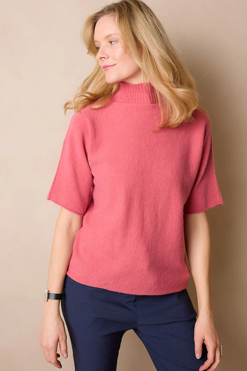 Lágy esésű, finom tapintású kötött felső, ami egyszerre kényelmes és nőies.A passzé nélküli, rövid T-ujj könnyed mozgást enged, a garbó nyak pedig laza eleganciát sugall. Passzé nélküli végei szabadabb, játékosabb hatást keltenek, így egyszerre sportosan természetes és finoman sikkes.