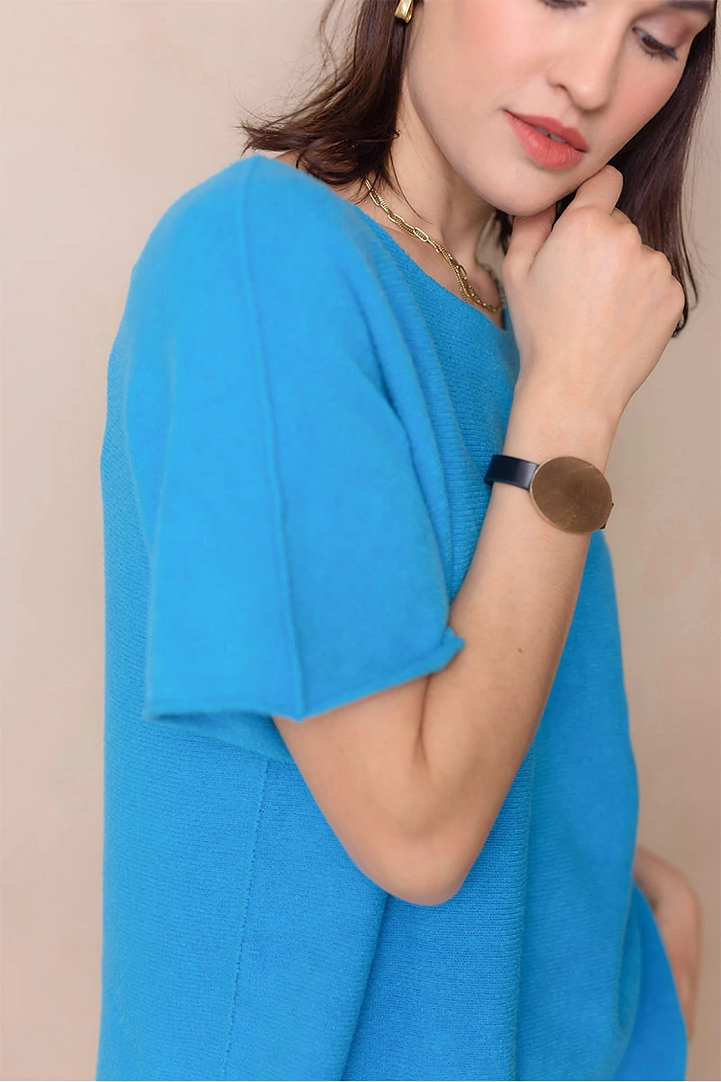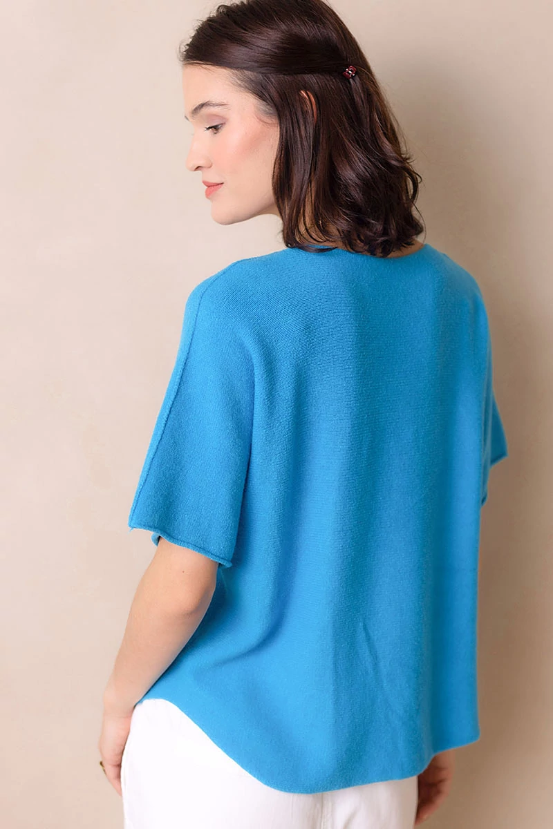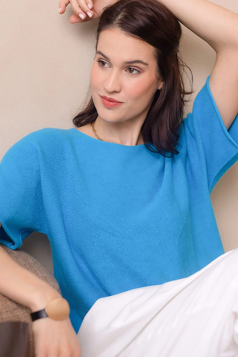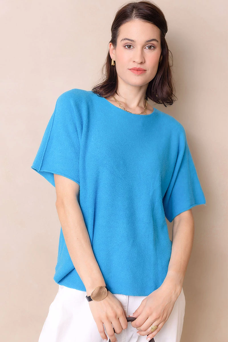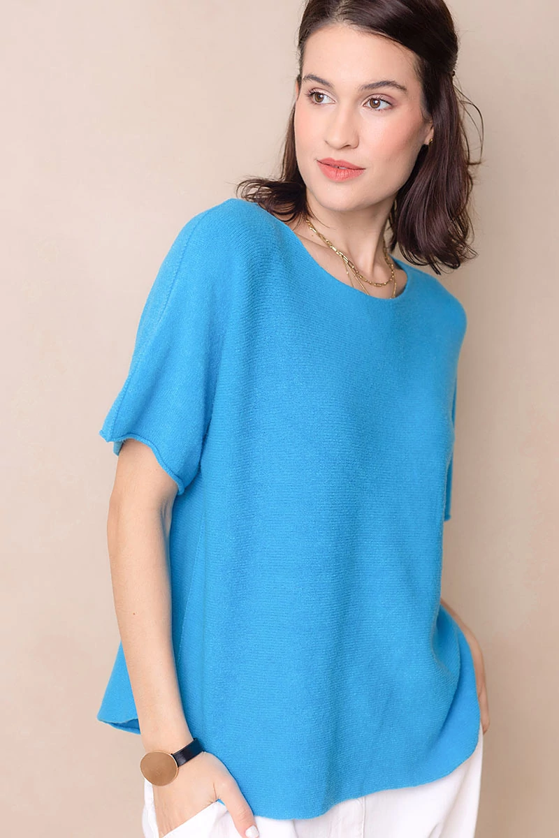 Lágy esésű, finom tapintású kötött felső rövid ujjal, ami egyszerre kényelmes és nőies. A lezserebb fazon könnyed mozgást enged, miközben laza eleganciát sugall. Passzé nélküli végei szabadabb, játékosabb hatást keltenek, a kör nyakkivágás pedig kiemeli a nyak vonalát, így egyszerre sportosan természetes és finoman sikkes.