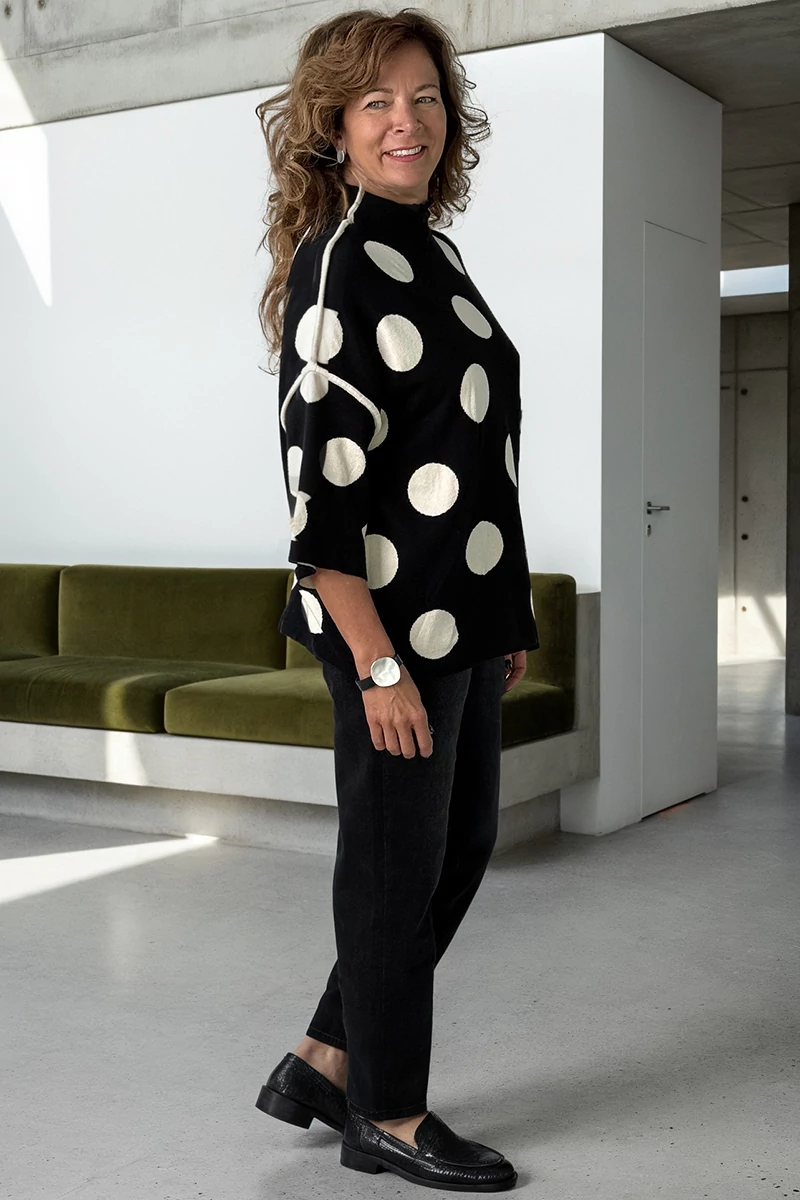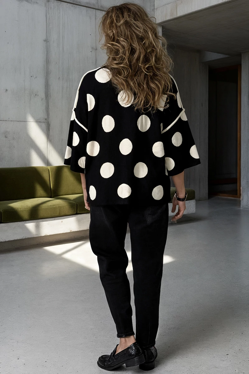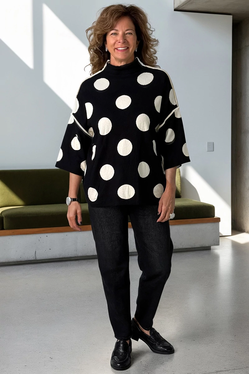 Rövidebb fazonú pulóver 1/2-es, T- ujjal, félgarbós nyakkal. Az anyaga puha,meleg, hurkolt anyag.