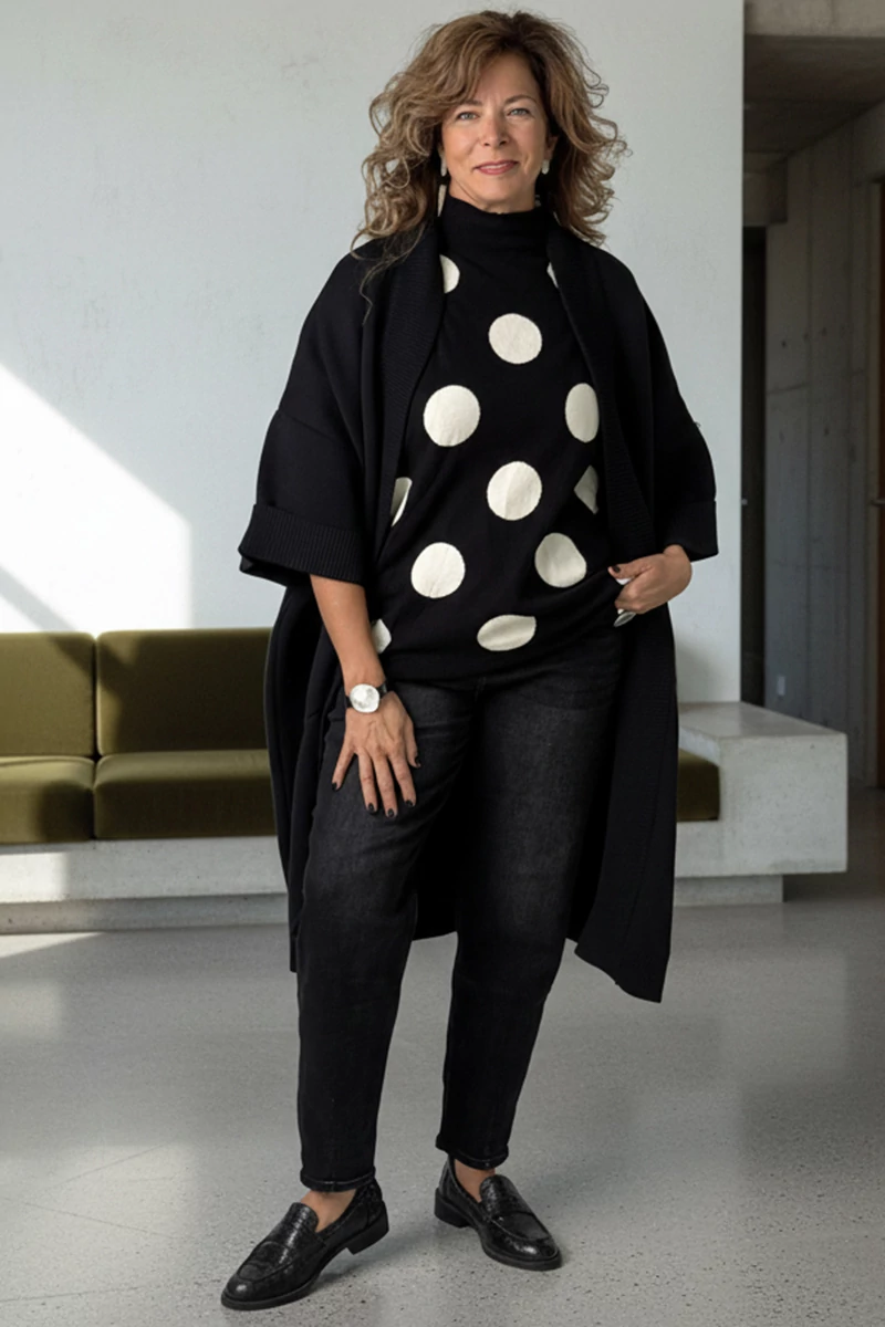 Mellvonalban 58 cm, derékvonalban 57 cm, csípővonalban 57 cm széles, hossza 64 cm, ujjhossz nyakkivágástól 56 cm,karöltő 22 cm. XL-es méretig ajánljuk. A terméket viselő modell 160 cm magas.
