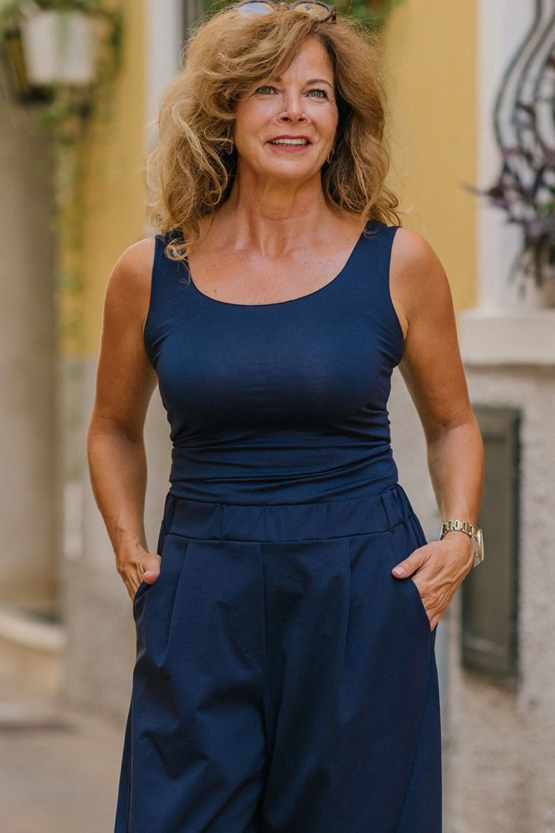 Enyhén testkövető fazonú trikó felső, szélei lézervágottan szegettek. Anyaga rugalmas.