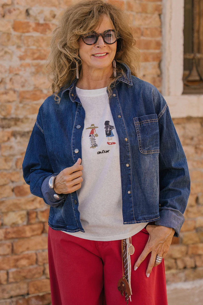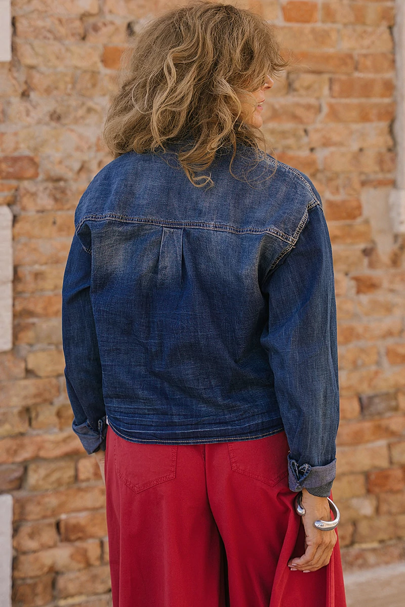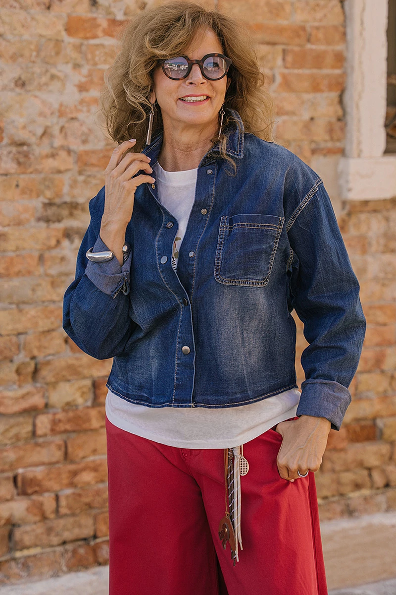 Rövidebb fazonú, egyenes vonalú, lezser fazonú, farmer ingkabát galléros nyakkal mellzsebekkel, mandzsettás hosszú ujjal. Elöl végig fémpatentokkal záródik. Az anyaga enyhén rugalmas, finoman koptatott, puha farmeranyag.
