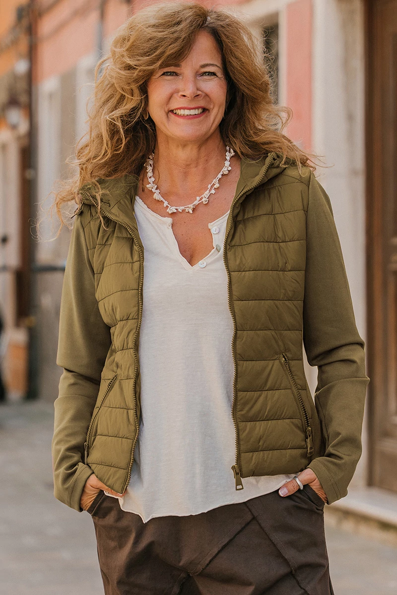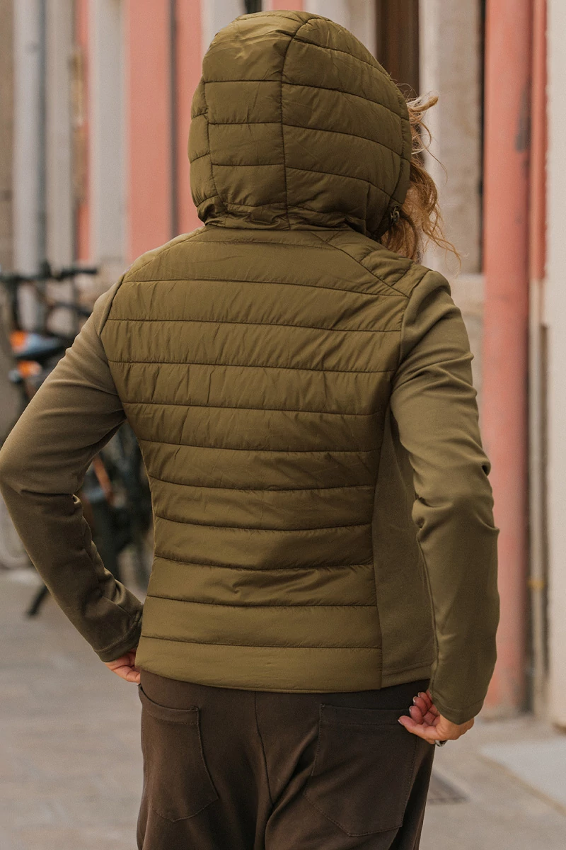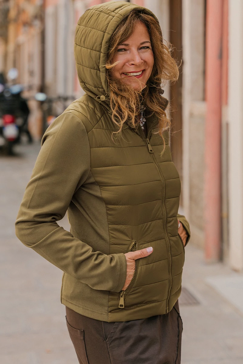 Karcsúsított fazonú, steppelt kabát vékony béléssel, rugalmas ujjal és oldalán rugalmas betéttel. Cipzáros zsebekkel, zsinóros kapucnival. Elöl cipzárral záródik.