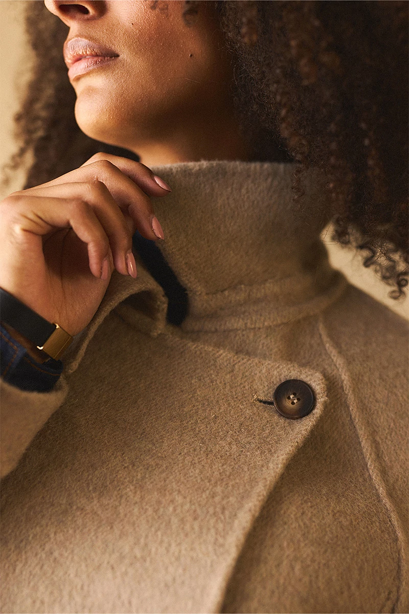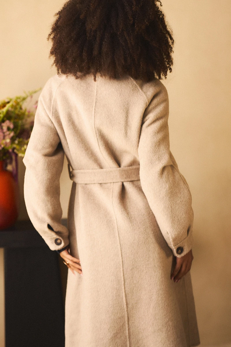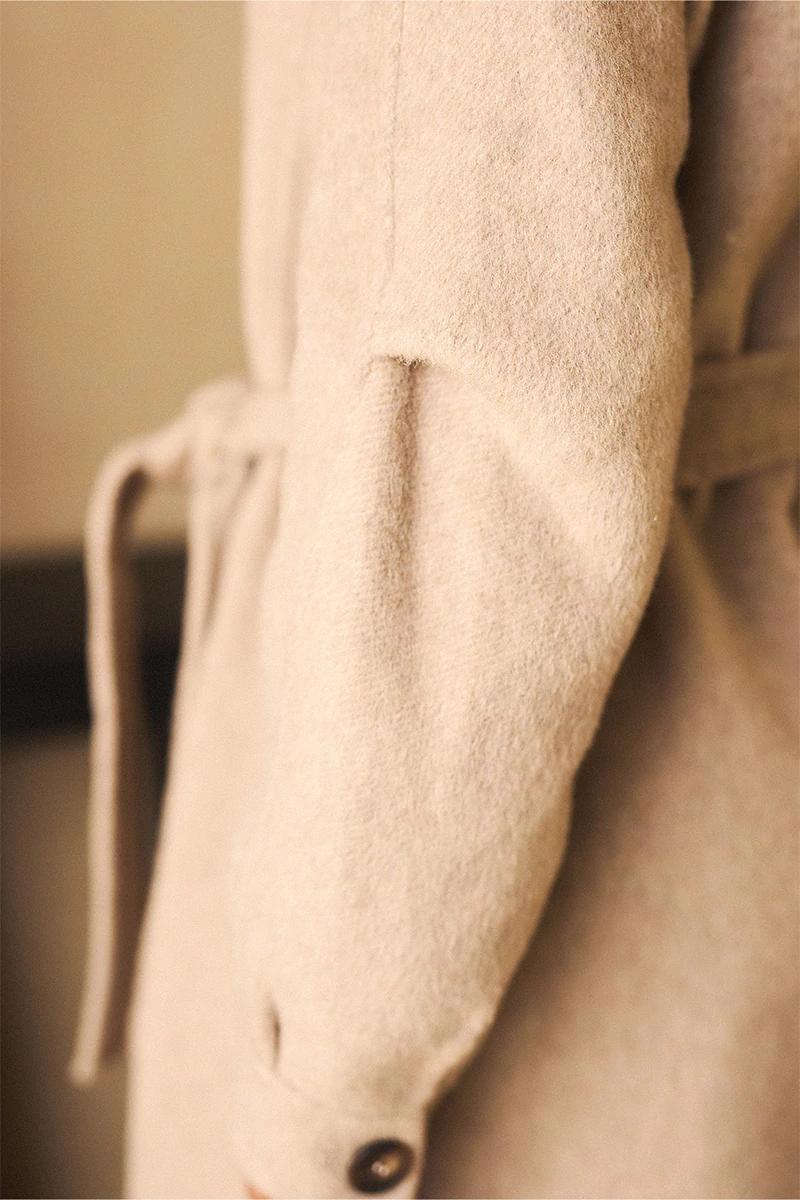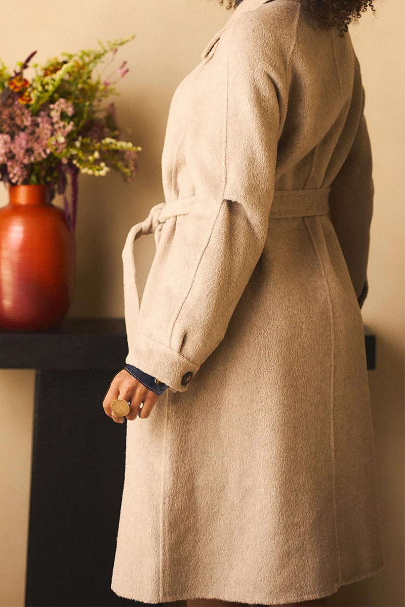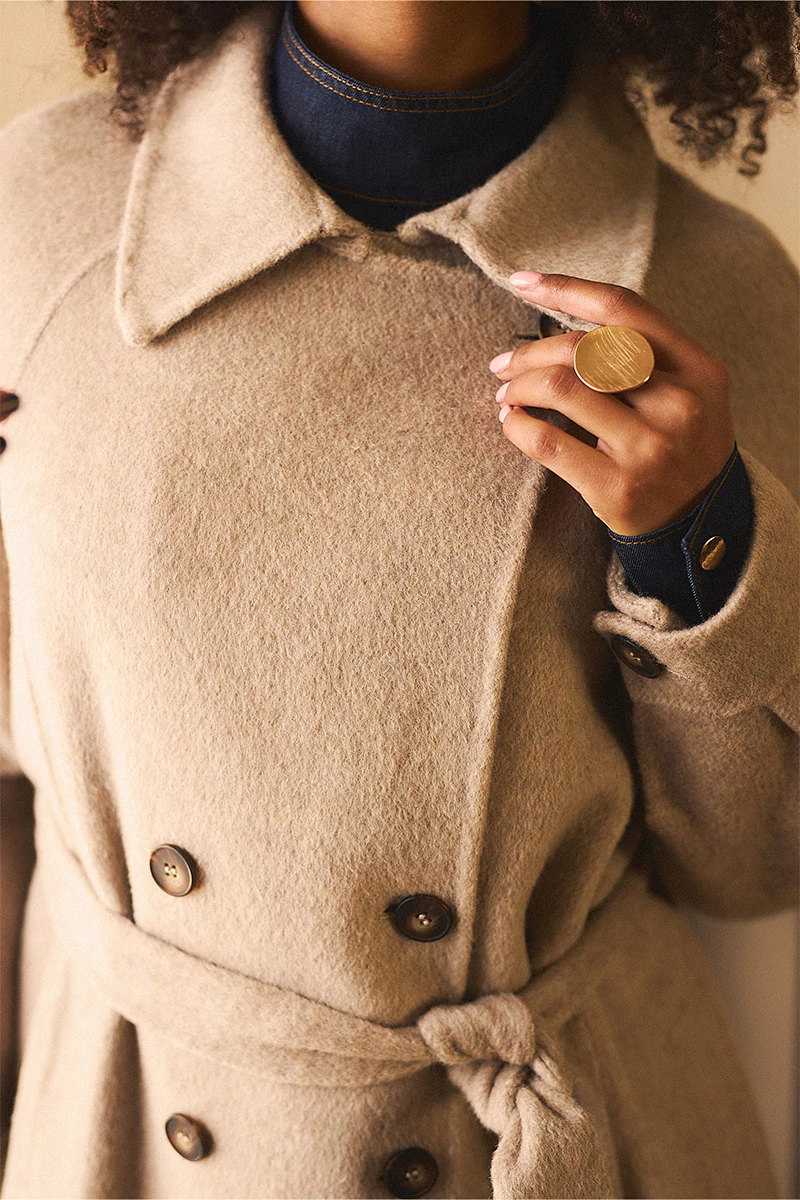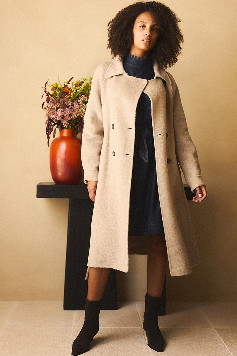 Klasszikus és időtálló szövetkabát, amelyben a kényelem és a stílus tökéletes harmóniában találkozik. Hosszú, bővebb fazonja légiesen követi a test vonalát, miközben kényelmes mozgásteret biztosít. A duplasoros gombolás és a hajtókás gallér letisztult, elegáns karaktert adnak a darabnak, a derékban megköthető öv pedig játékosan kiemeli a nőies sziluettet. A raglán ujj sportosabb, lezserebb vonalat kölcsönöz, így a kabát egyszerre viselhető hétköznapi összeállításokhoz és alkalmi szettekhez is. Béleletlen.