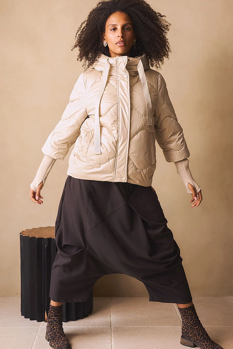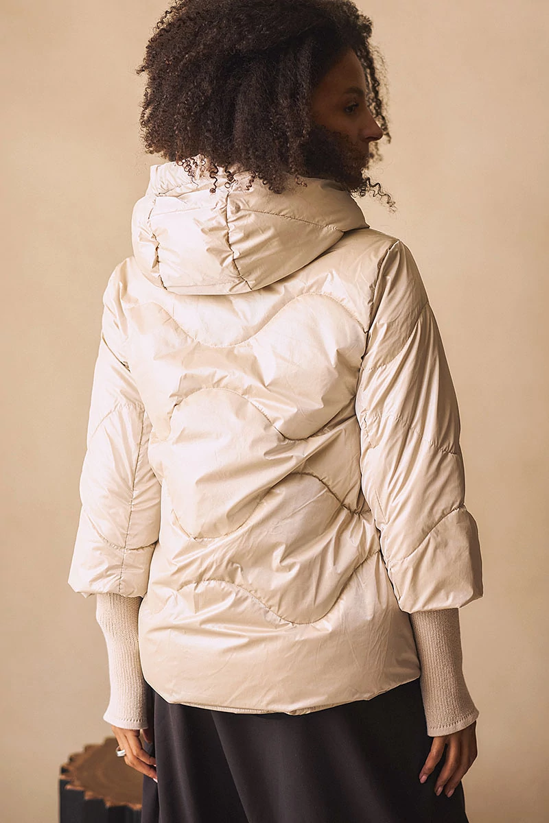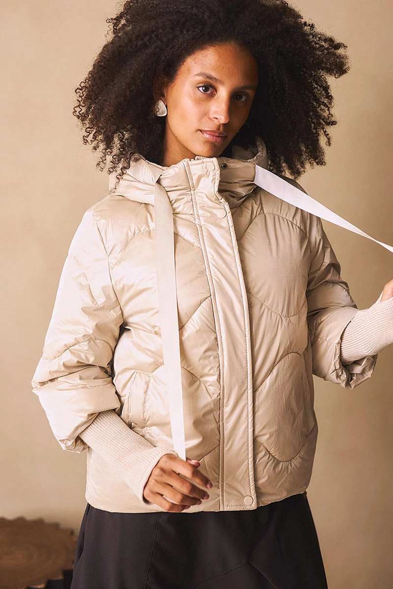Ez a steppelt dzseki a modern városi stílus és a praktikus kényelem találkozása. Vastag töltete gondoskodik a hideg elleni védelemről, miközben könnyű súlya miatt kényelmes viselet a mindennapokban. A rövid, nőies fazon kiemeli a derékvonalat, sportos és fiatalos hatást ad. Az elöl végigfutó széles cipzár a patentos szélfogóval, és a zsinóros kapucni szélálló védelmet nyújt. A hosszú, bordázott, ujjbújtatós mandzsetta praktikus részlet, amely egyszerre melegen tartja a kezet és vagány karaktert ad a kabátnak.100% poliészter töltet.