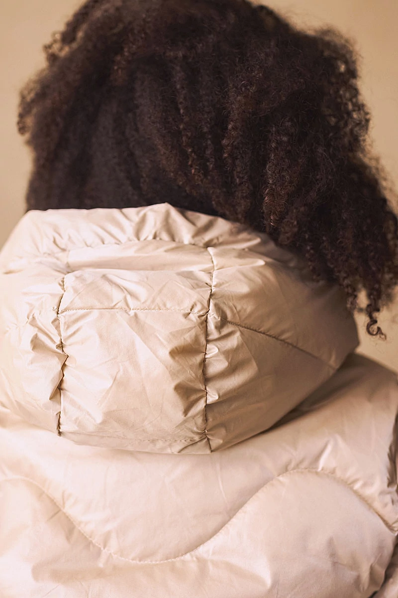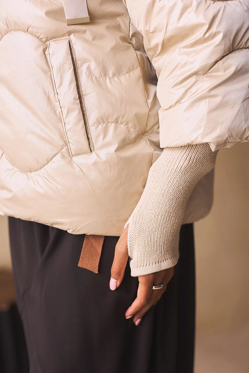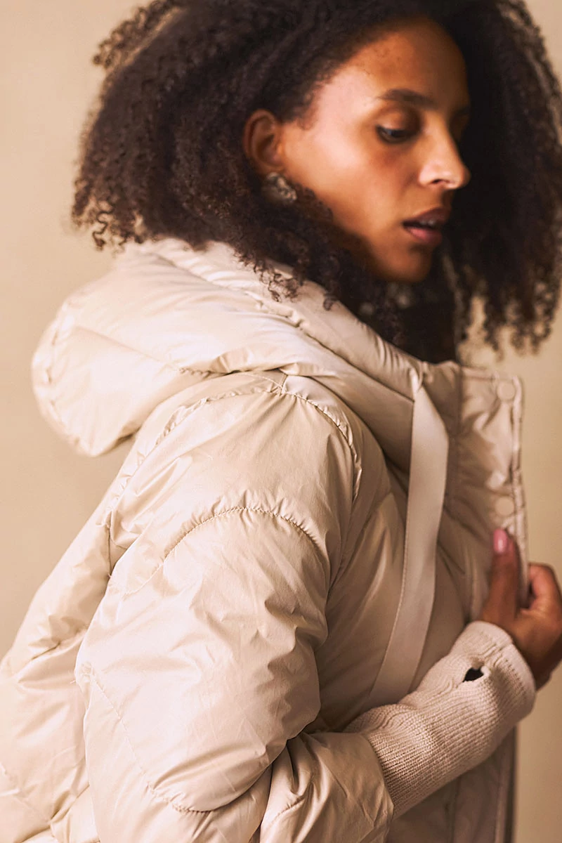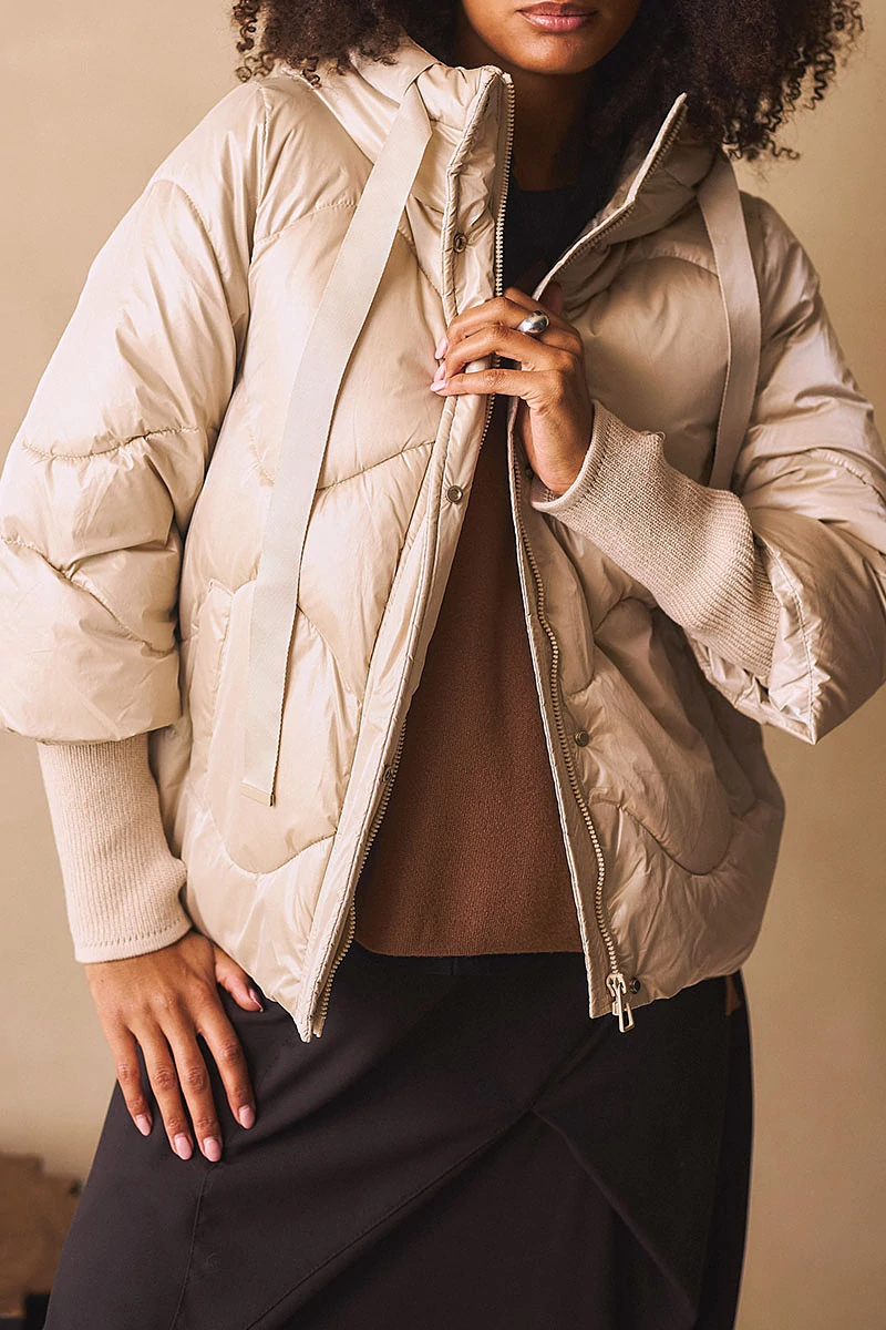Ez a steppelt dzseki a modern városi stílus és a praktikus kényelem találkozása. Vastag töltete gondoskodik a hideg elleni védelemről, miközben könnyű súlya miatt kényelmes viselet a mindennapokban. A rövid, nőies fazon kiemeli a derékvonalat, sportos és fiatalos hatást ad. Az elöl végigfutó széles cipzár a patentos szélfogóval, és a zsinóros kapucni szélálló védelmet nyújt. A hosszú, bordázott, ujjbújtatós mandzsetta praktikus részlet, amely egyszerre melegen tartja a kezet és vagány karaktert ad a kabátnak.100% poliészter töltet.