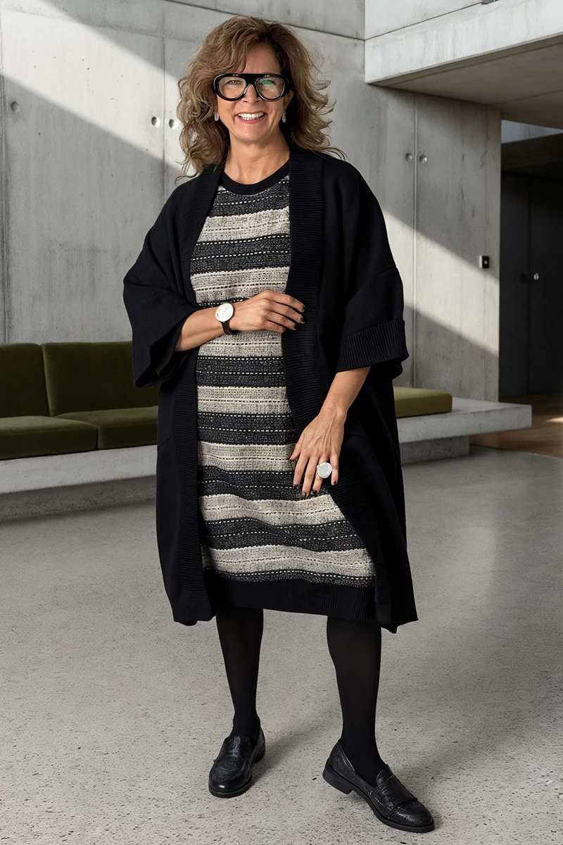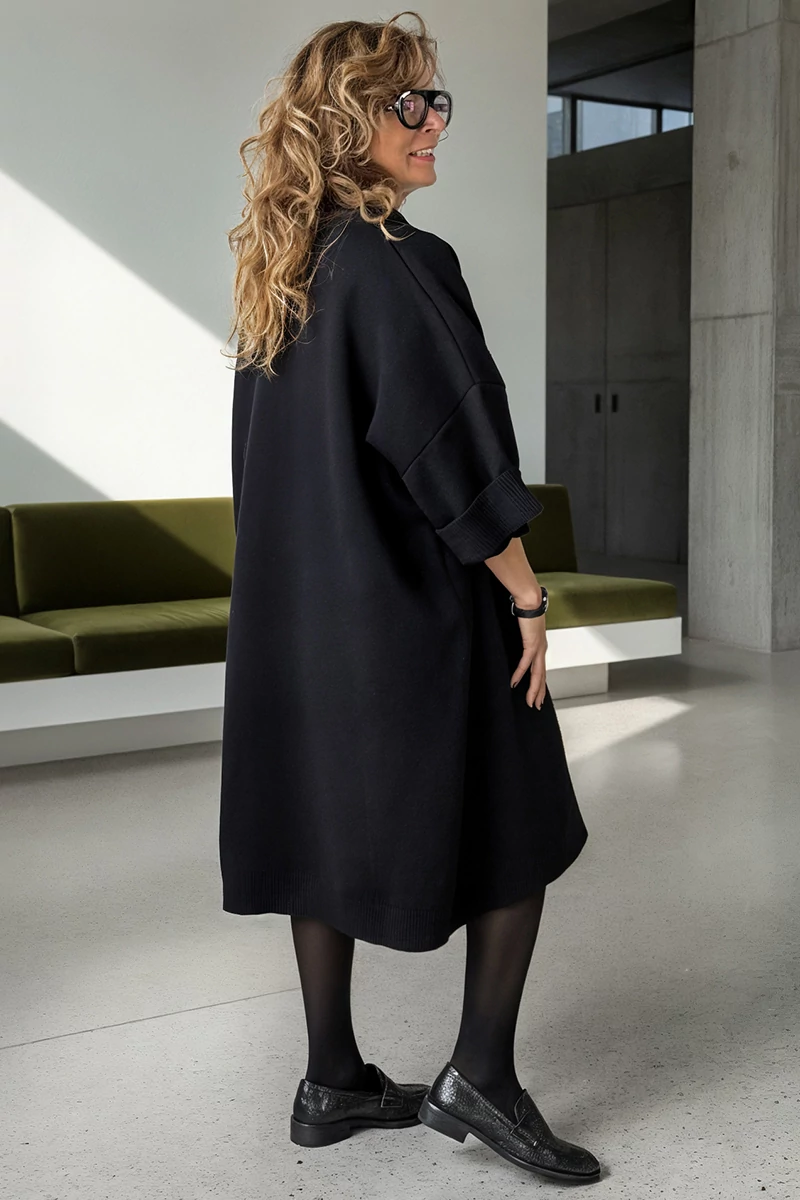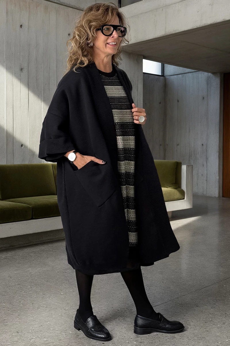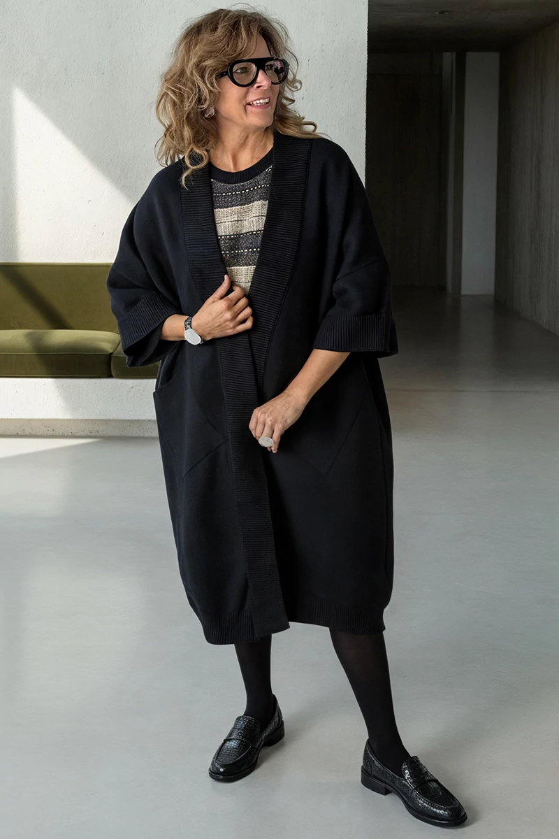 Kényelmes, meleg, oversize fazonú, hosszú kötött kabát nagyméretű zsebekkel, T-ujjal, bordázott, széles passzékkal.