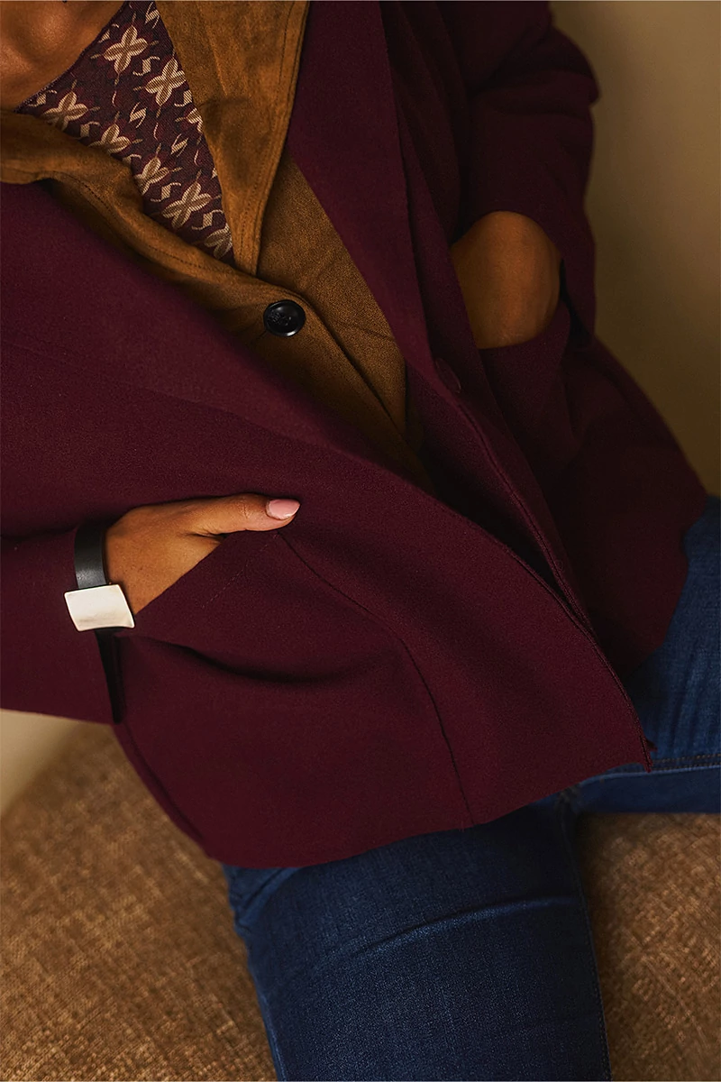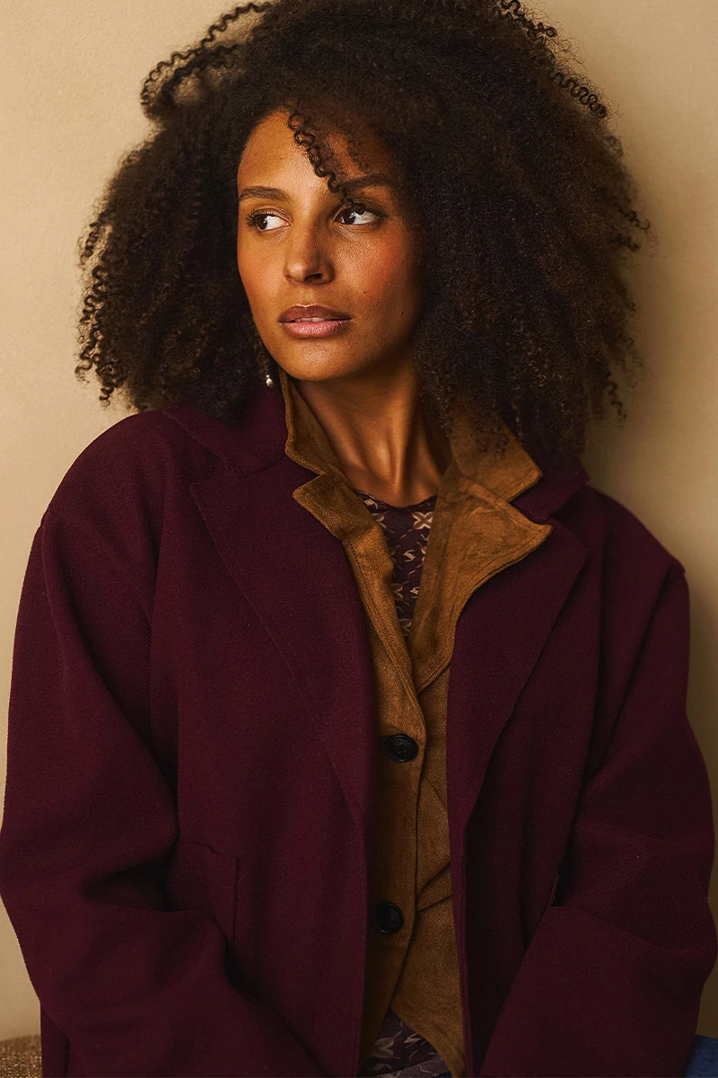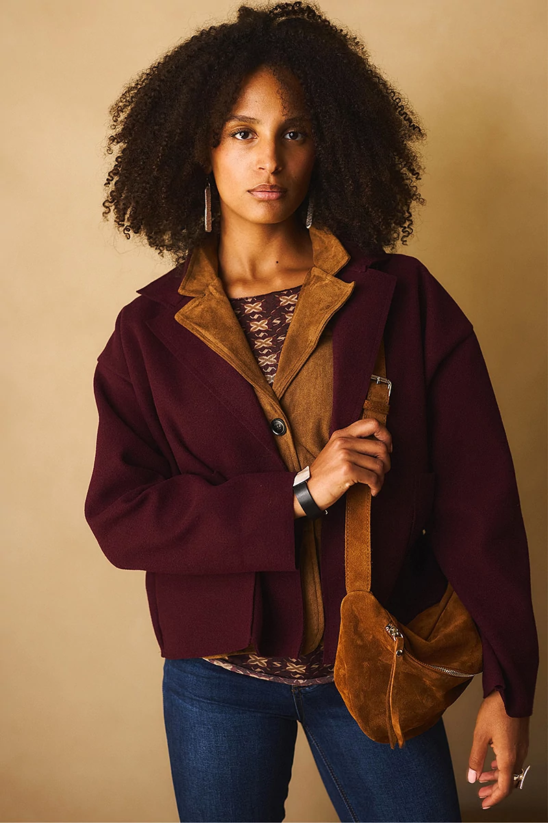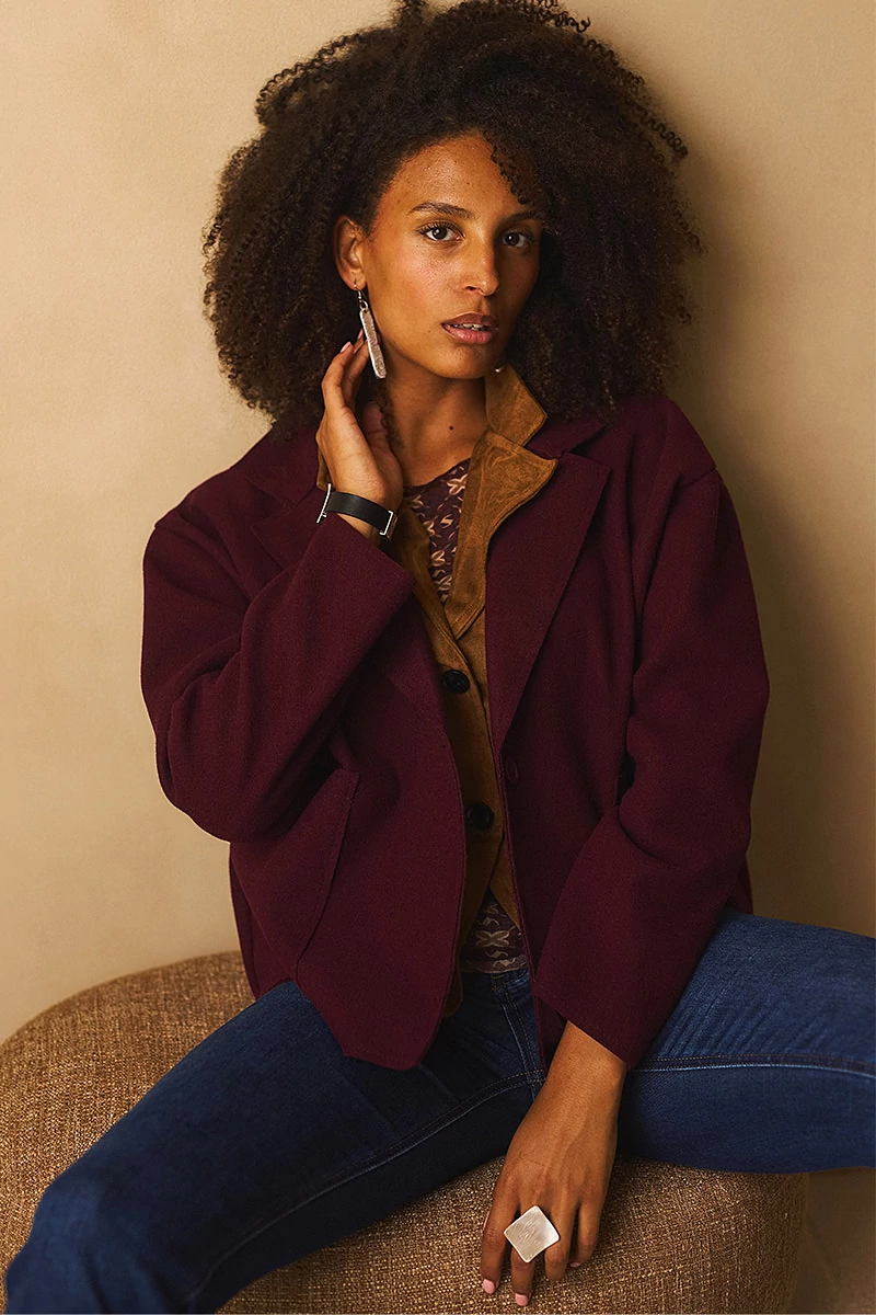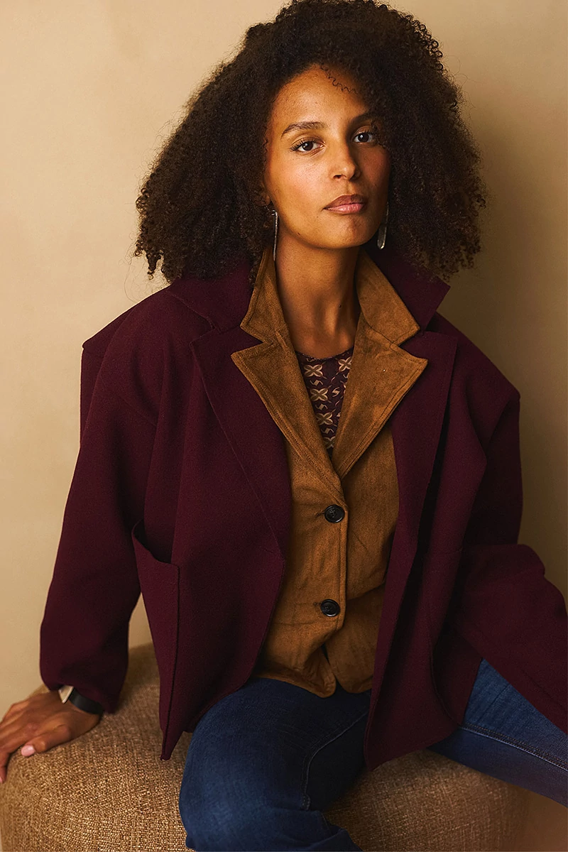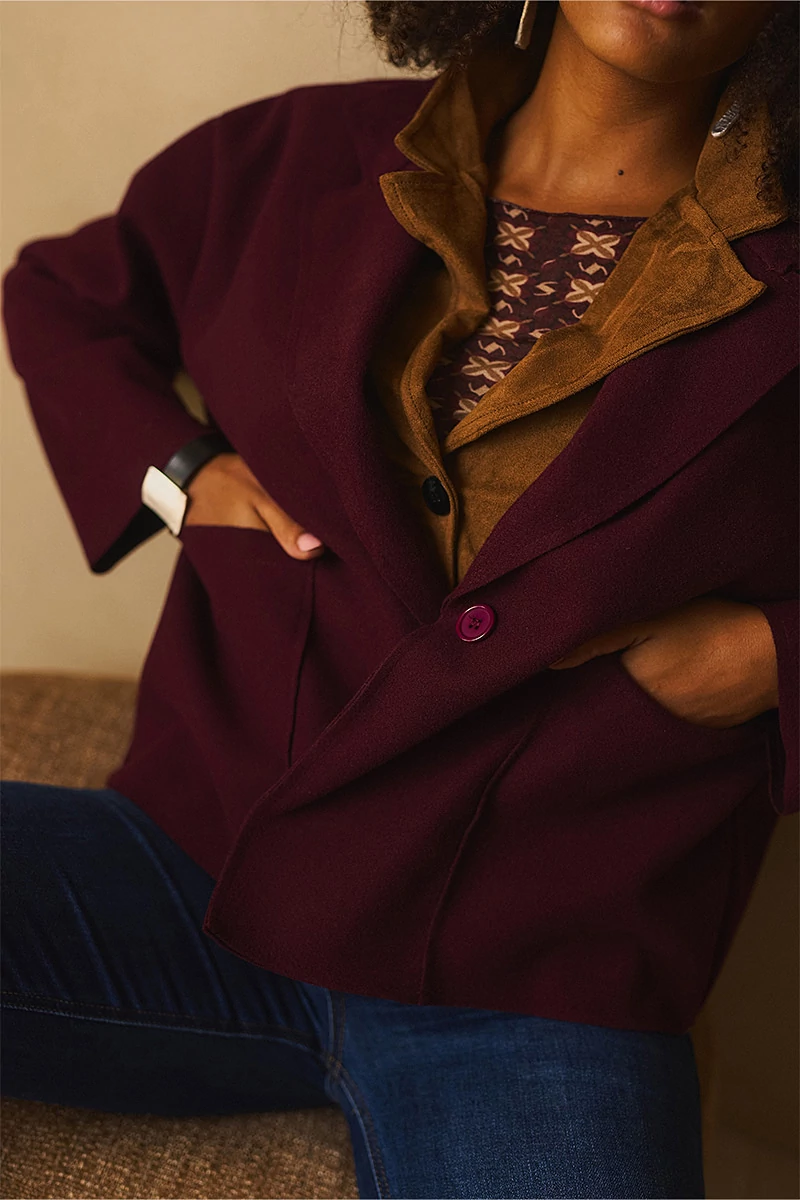 Ez a könnyű, béleletlen filc kabátka sikkes könnyedség a hűvösebb napokra. A klasszikus gallér elegáns karaktert kölcsönöz neki. Elöl gombbal záródik ésrávarrt zsebekkel így a letisztult fazonhoz finom részletek társulnak. A filc szövet könnyed, mégis stílusos megjelenést biztosít, amely egyszerre modern és nőies.